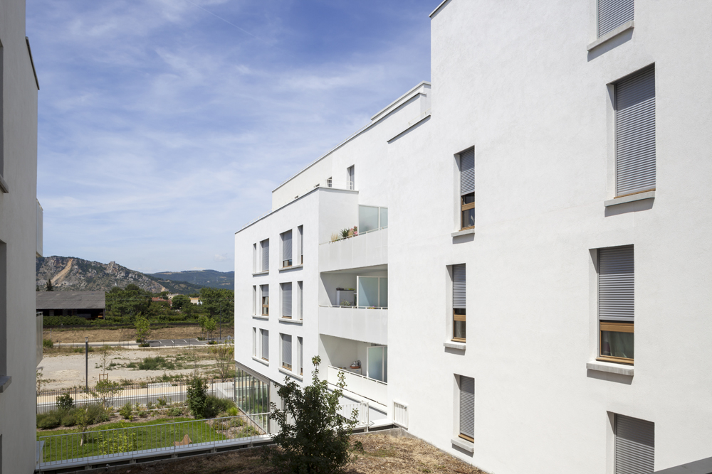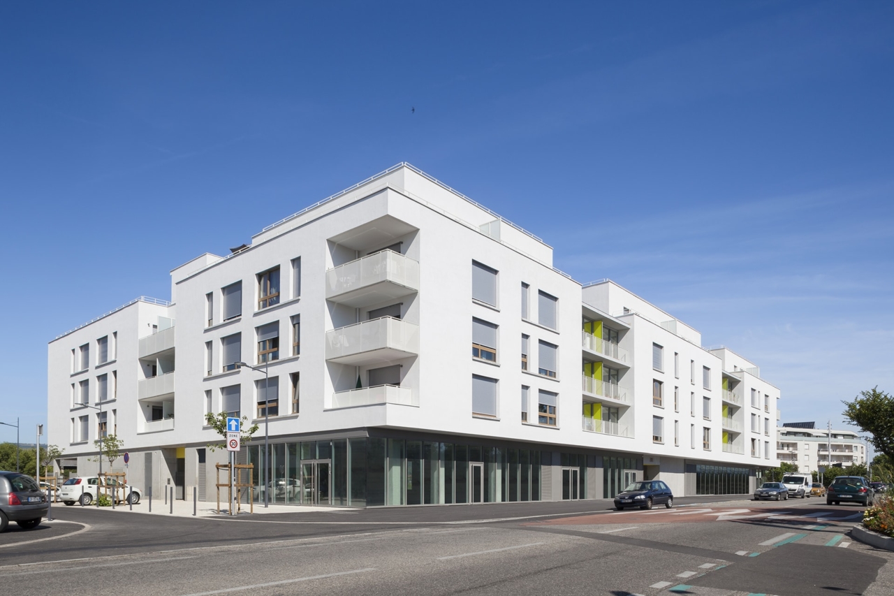 La composition architecturale est classique: au dessus d’un socle fédérateur, trois corps de bâtiment de couleur claire, sont complétés par un attique discret de même couleur. Les grandes fenêtres des séjours et leurs allèges basses privilégient la vue, la lumière et les apports solaires gratuits, mais aussi l’expression d’une convivialité urbaine, d’un vis-à-vis animé. L’intimité des logements et en particulier des loggias est assurée par des garde-corps translucides, réalisés en verre feuilleté dépoli. La façade Est, est marquée par deux failles qui apportent une transparence vers le coeur d’îlot et accueille des loggias traversantes. En cœur d’îlot, des plantations créent un nécessaire filtre végétal.