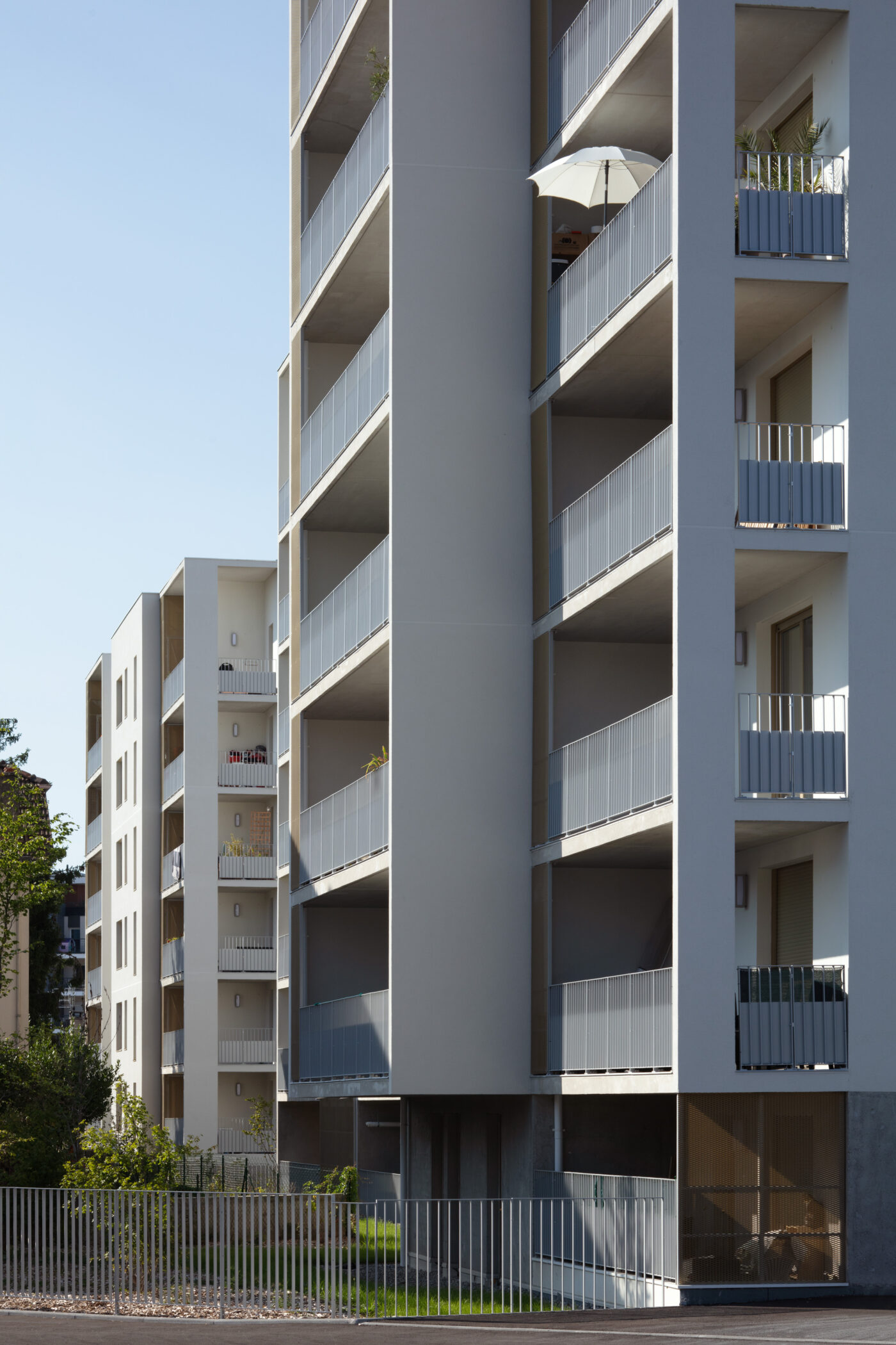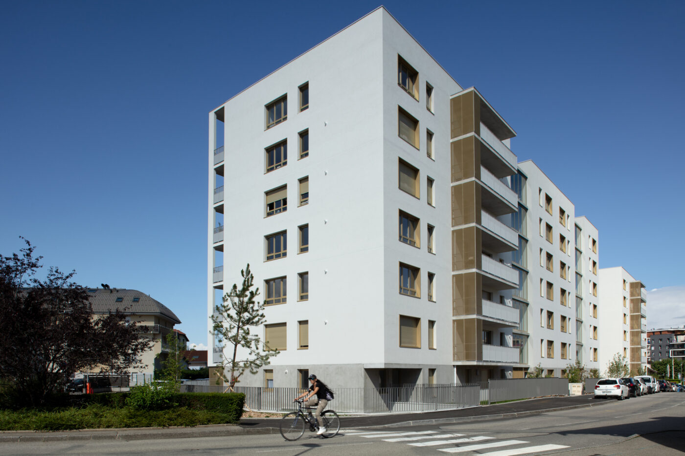 Dans le but d’affirmer le caractère élancé de la silhouette fractionnée des différents blocs, aucun effet de couronnement ni de retrait d’attique n’est exprimé.