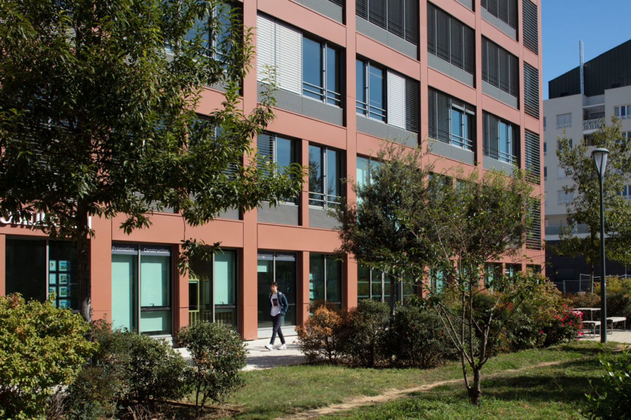 La composition architecturale est classique : le bâtiment développe un corps de couleur uniforme, qui s’étire sur le niveau R+6, au maximum des 25 mètres autorisés, pour renforcer son caractère de signal dans l’angle sud-est du quartier. Plus à l’est le volume en retrait rompt l’aspect monolithique en proposant des terrasses d’usage.