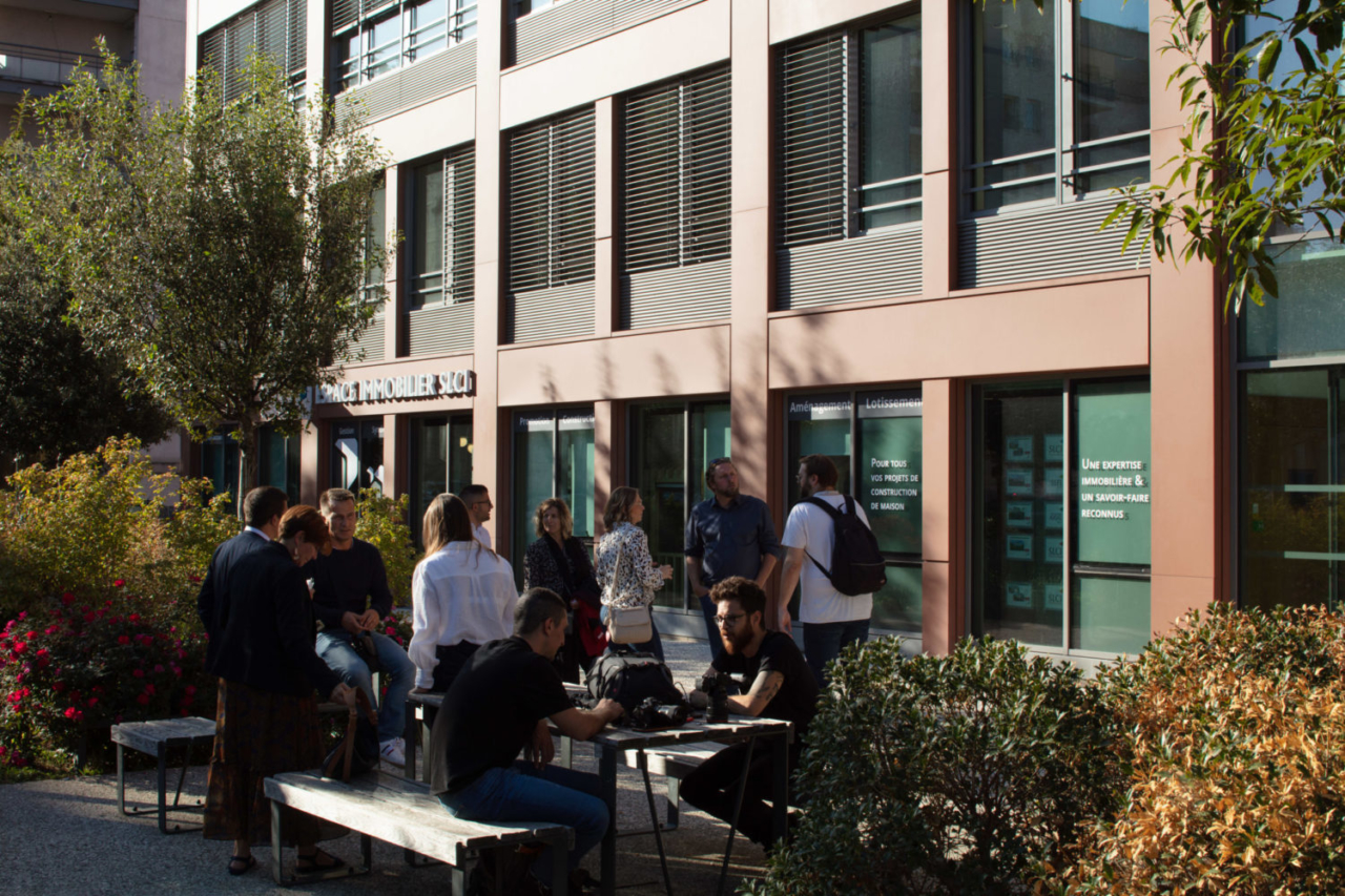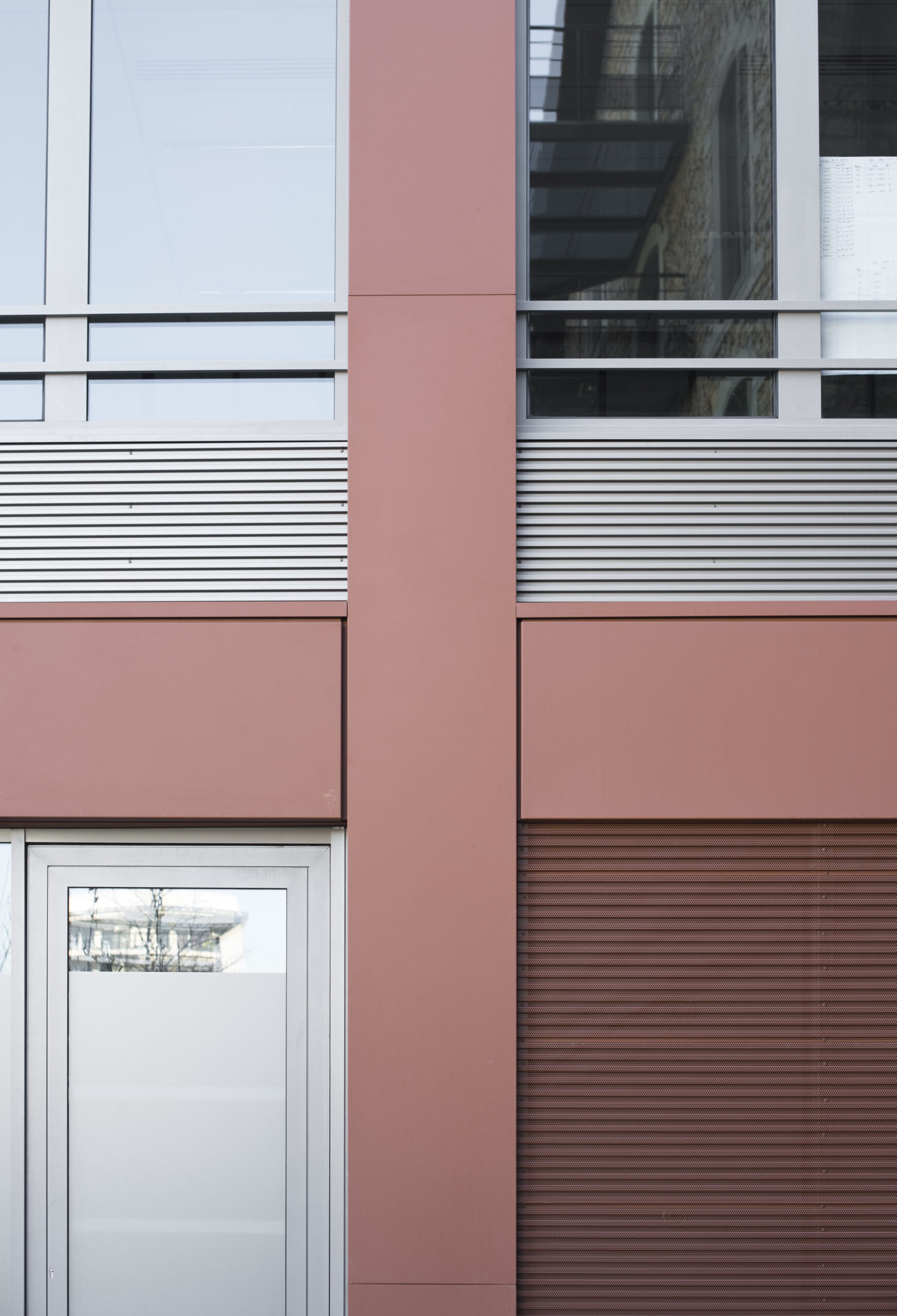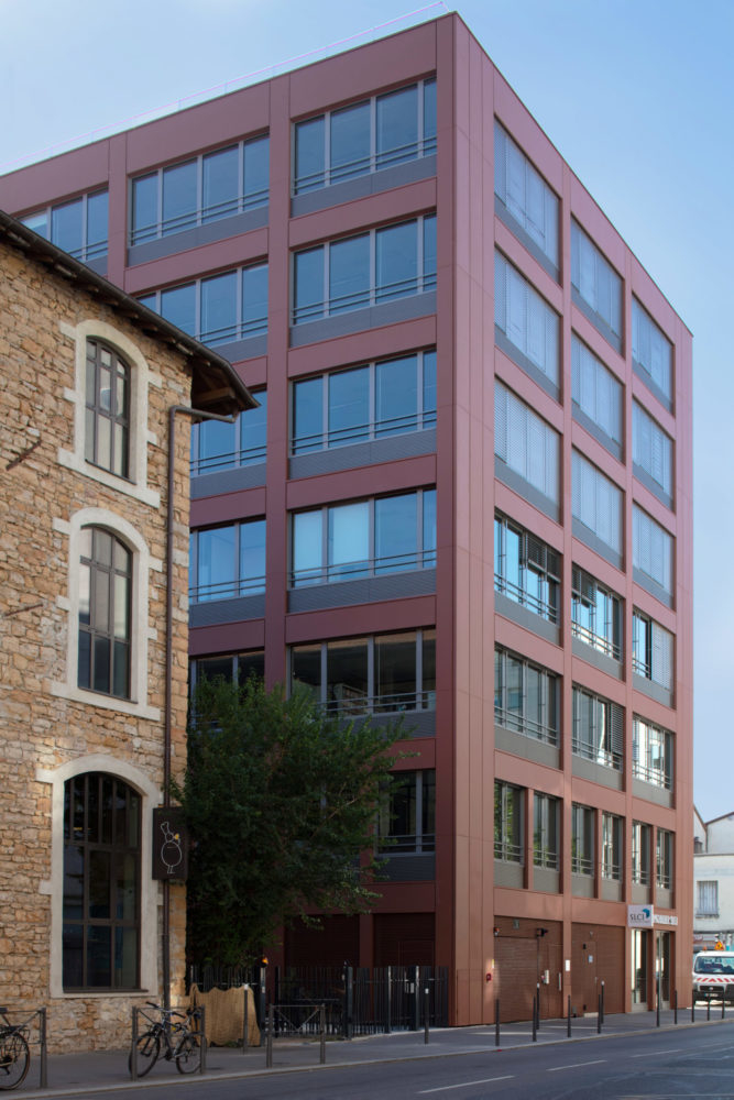 Le bâtiment s’inscrit dans ce nouveau paysage urbain par des matériaux nobles et durables : bardage métallique calepiné, vitrage clair, châssis aluminium très performants pour l’ensemble des bureaux, protégés par des brises soleil qui filtrent vue et soleil.