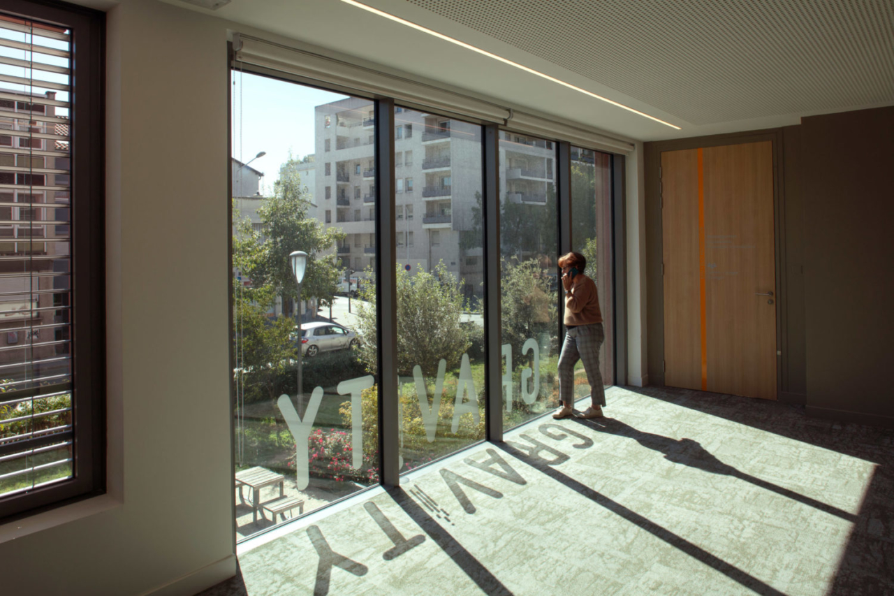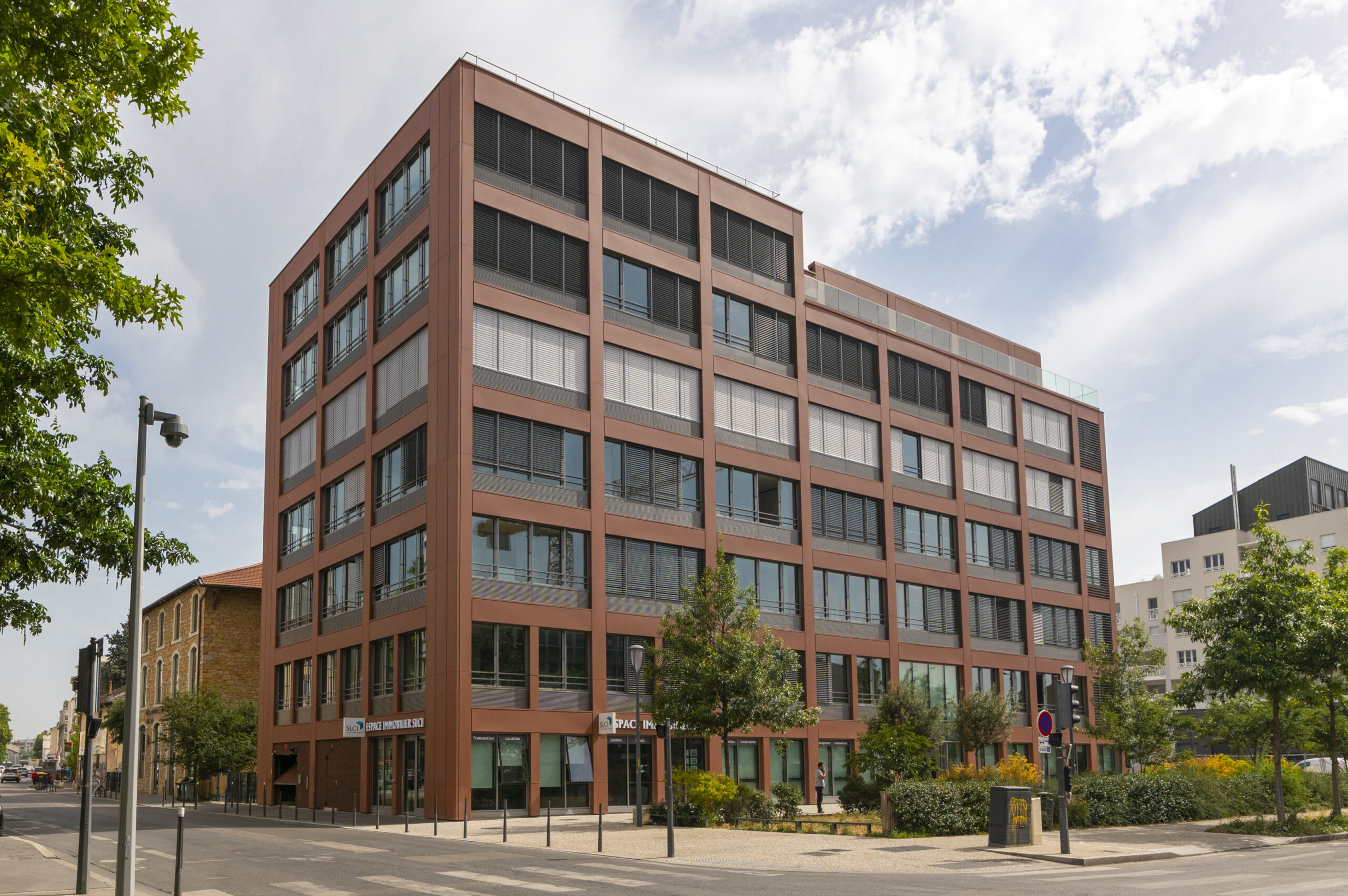 L’écriture du bâtiment est à la fois sobre et archétypique. Elle évoque l’architecture industrielle qui a façonné le territoire de Gerland: Une trame porteuse en façade, rigoureuse, dessinant de larges ouvertures pour faire pénétrer la lumière naturelle.