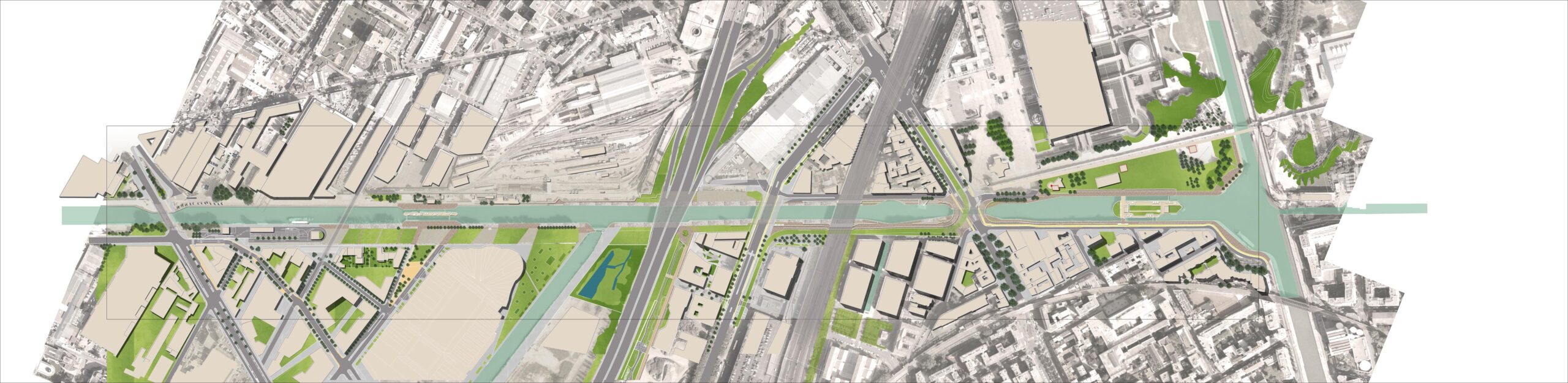 Nos réflexions prolongent et enrichissent les notions « d’horizon-paysage » et de « parc-canal » développés depuis au moins deux décennies sur le canal Saint-Denis. La période actuelle entérine la forte volonté politique d’un dialogue avec l’eau et d’un retournement de la ville vers le canal. Ses berges et les quartiers naissants mitoyens forment un corridor écologique de première importance au sein du vaste territoire du Nord est de Paris. Ainsi, le projet s’attache à concilier maintien des fonctions historiques & industrielles de l’ouvrage (transport fluvial et adduction d’eau), avec des objectifs plus contemporains :
