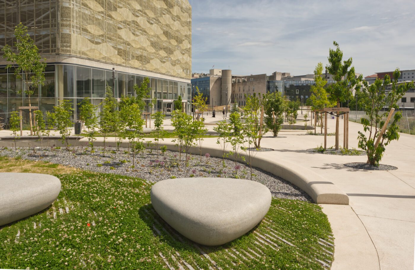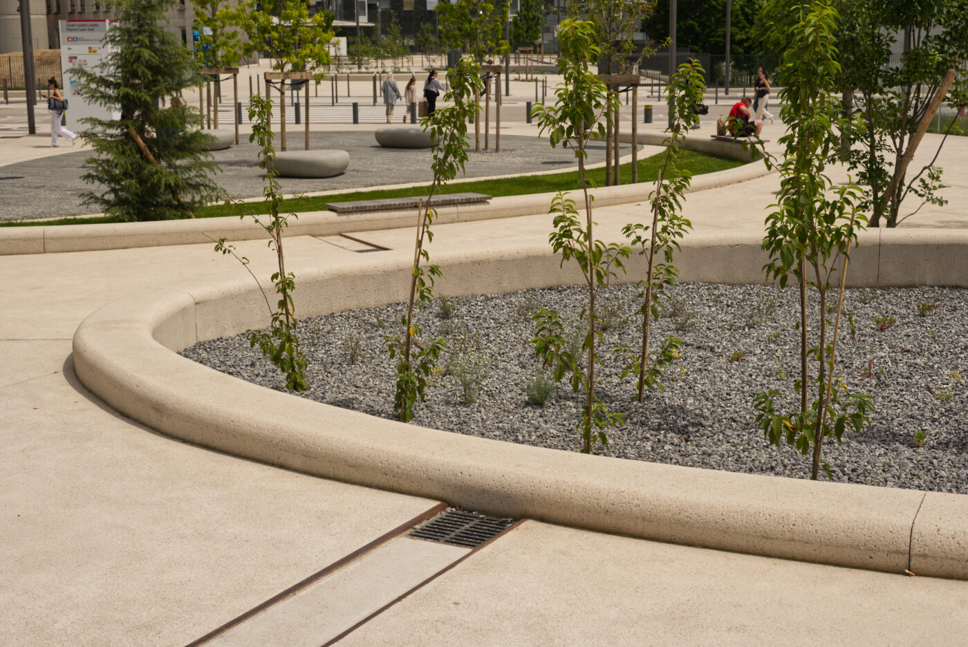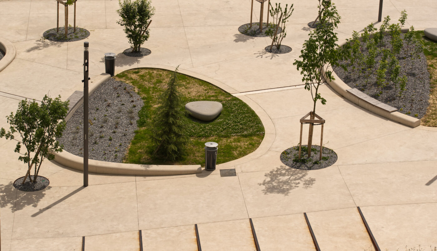 Des iles végétales ponctuent ce tapis minéral, creusant un sol fertile et perméable, planté d’arbres et d’arbustes aux essences variées, armature végétale formant une frondaison génératrice d’ombrage et support de biodiversité.