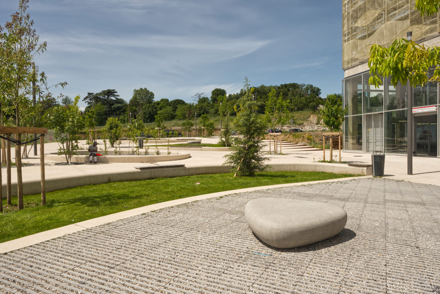 Accueillir le terminus du métro B autour d’un parvis fédérateur, c’est proposer un socle commun qui puisse rassembler autour d’une image originale et singulière tous les usages d’un tel pôle d’échanges. Les voiries qui se déploient autour du parvis redéfinissent la trame viaire du futur quartier à venir en sculptant le terrain naturel et en mettant en valeur son patrimoine végétal.