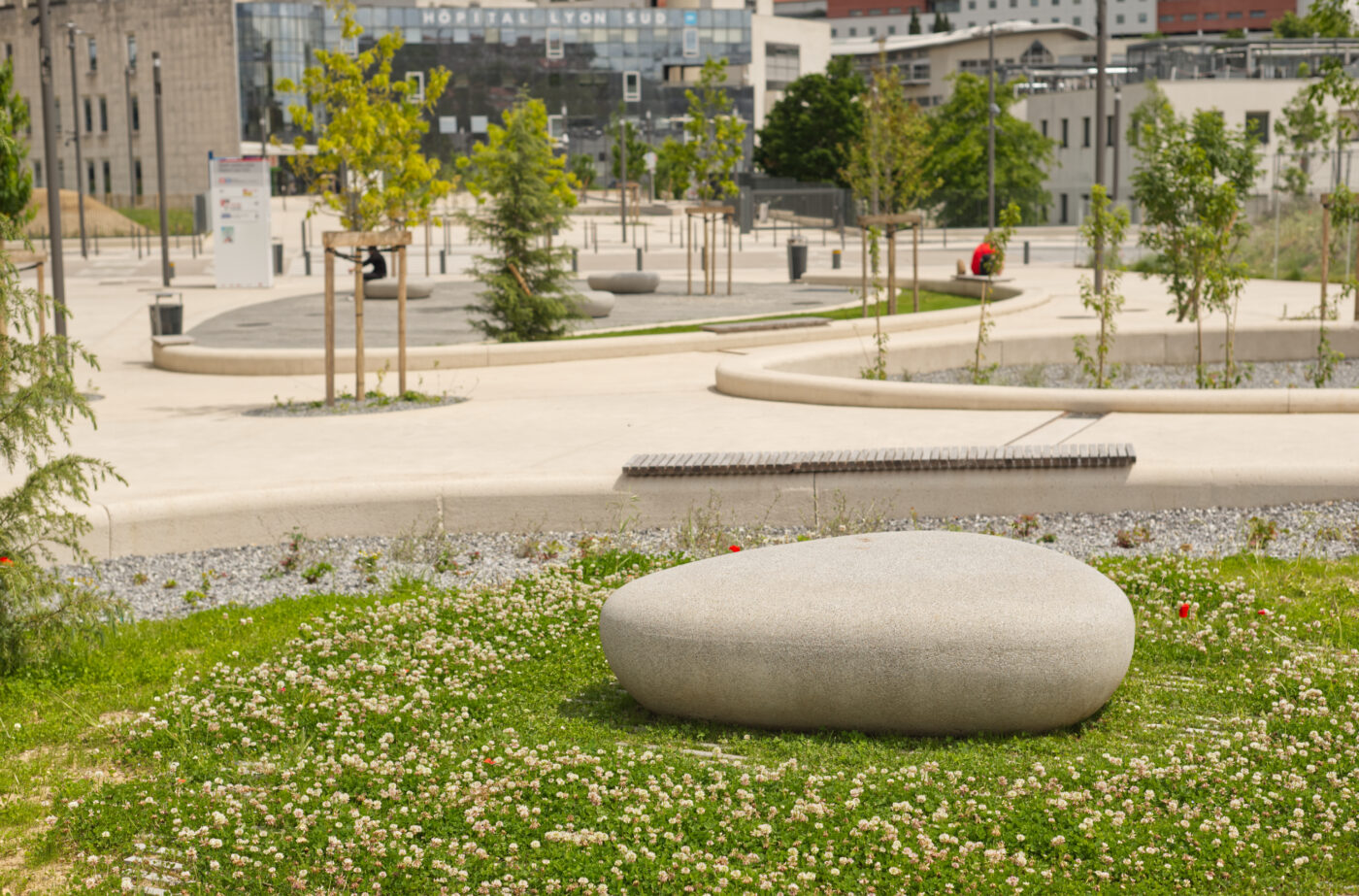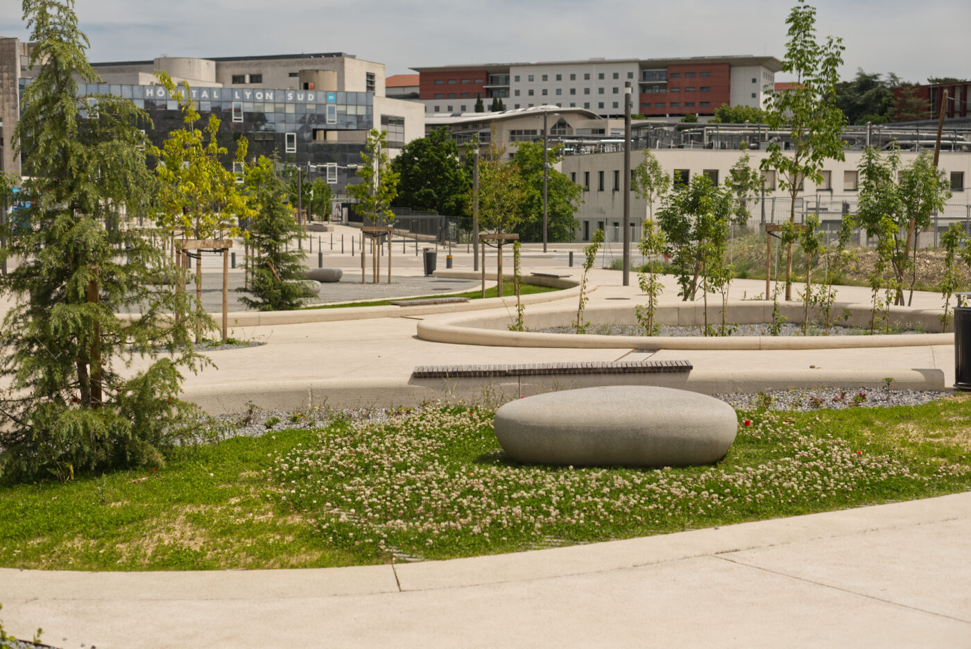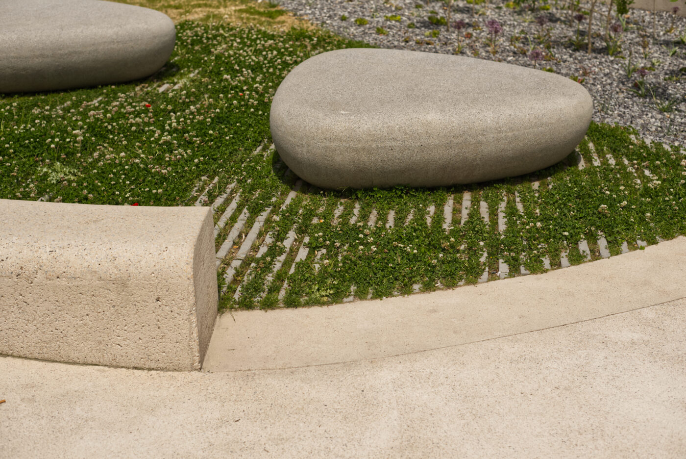 La sculpture du socle propose une gestion paysagère des eaux pluviales avec une mise en scène du chemin de l’eau, intercepté et guidés par des sillons menant aux îles fertiles. Un parquet de béton percé de sillons poreux complète ce dispositif qui place l’infiltration au cœur du projet.