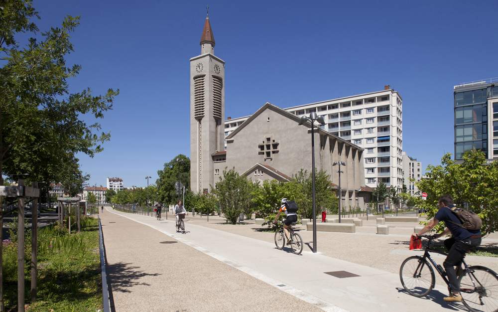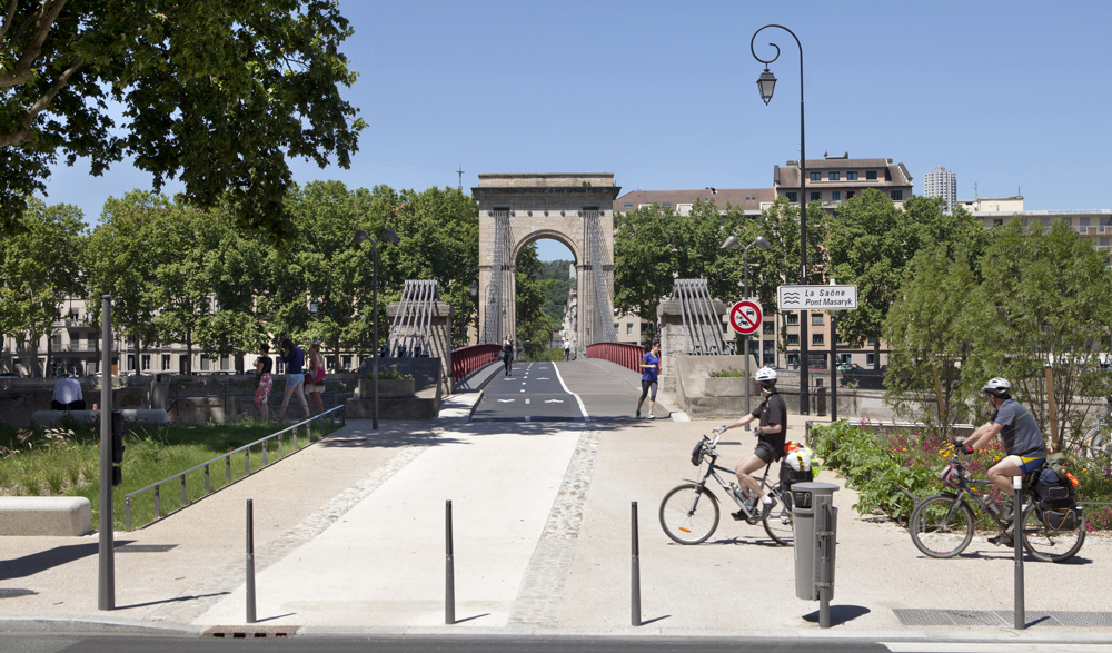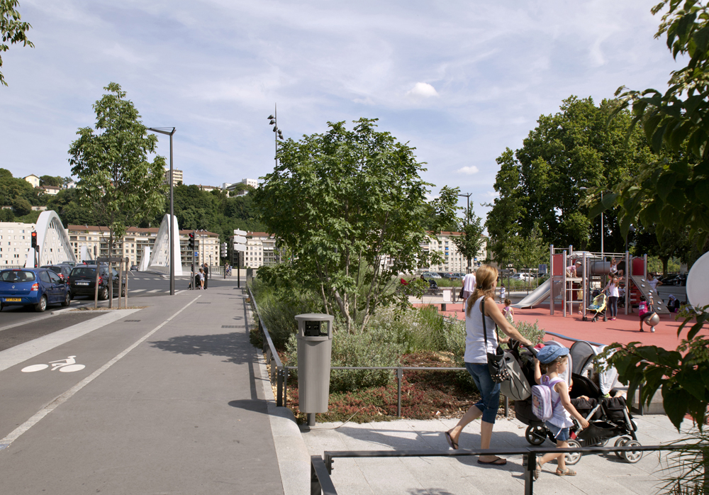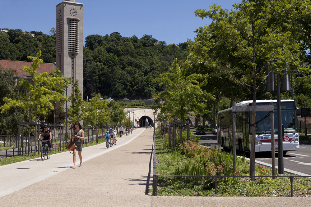 Recréer une identité de porte de ville par des aménagements urbains en lien avec la création d’infrastructure, le pont Schuman et le tunnel mode doux de la Croix-Rousse.Développer des continuités «modes doux» Est/Ouest et améliorer l’accessibilité piétonne. Prendre en compte et favoriser les itinéraires de transports en commun.
