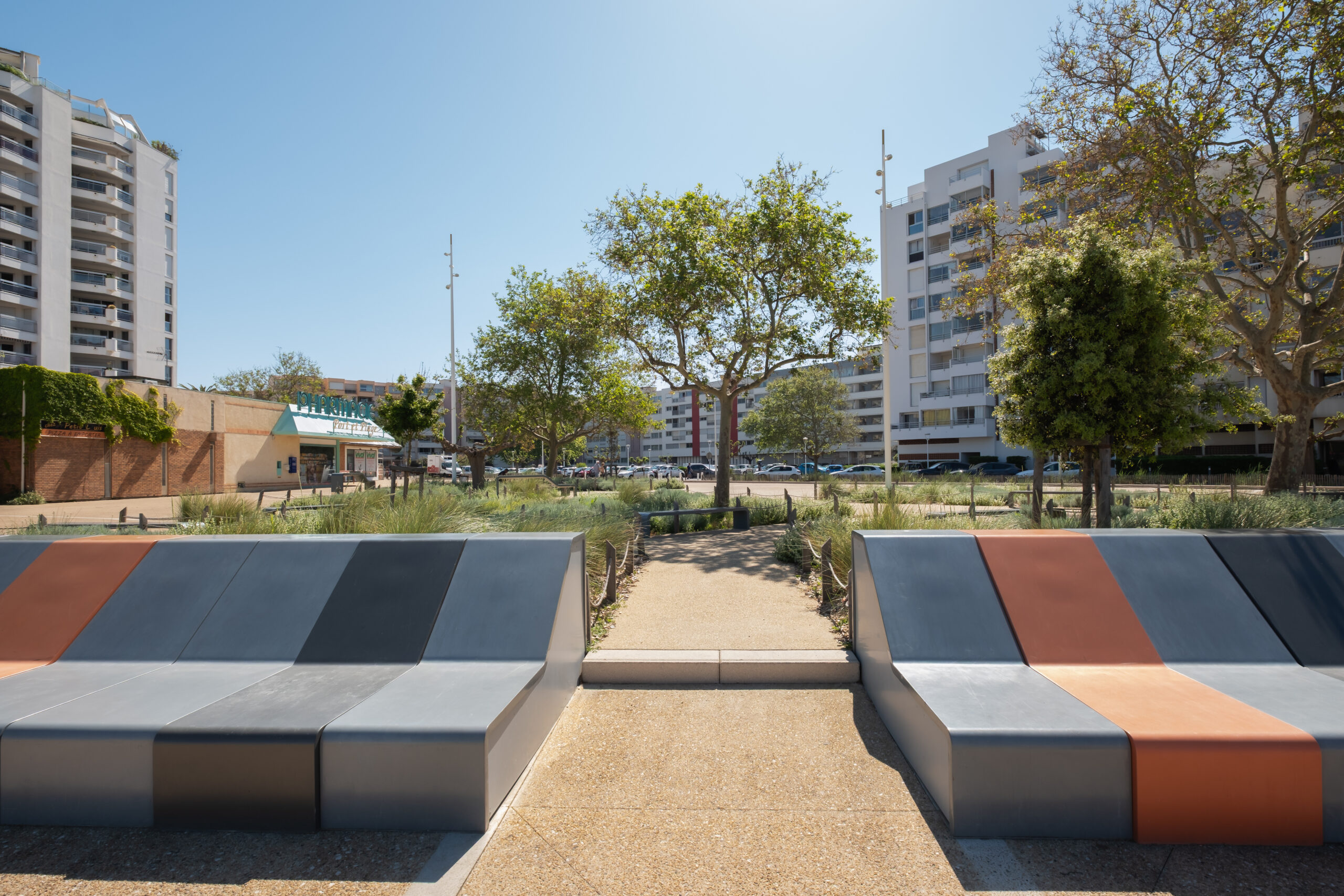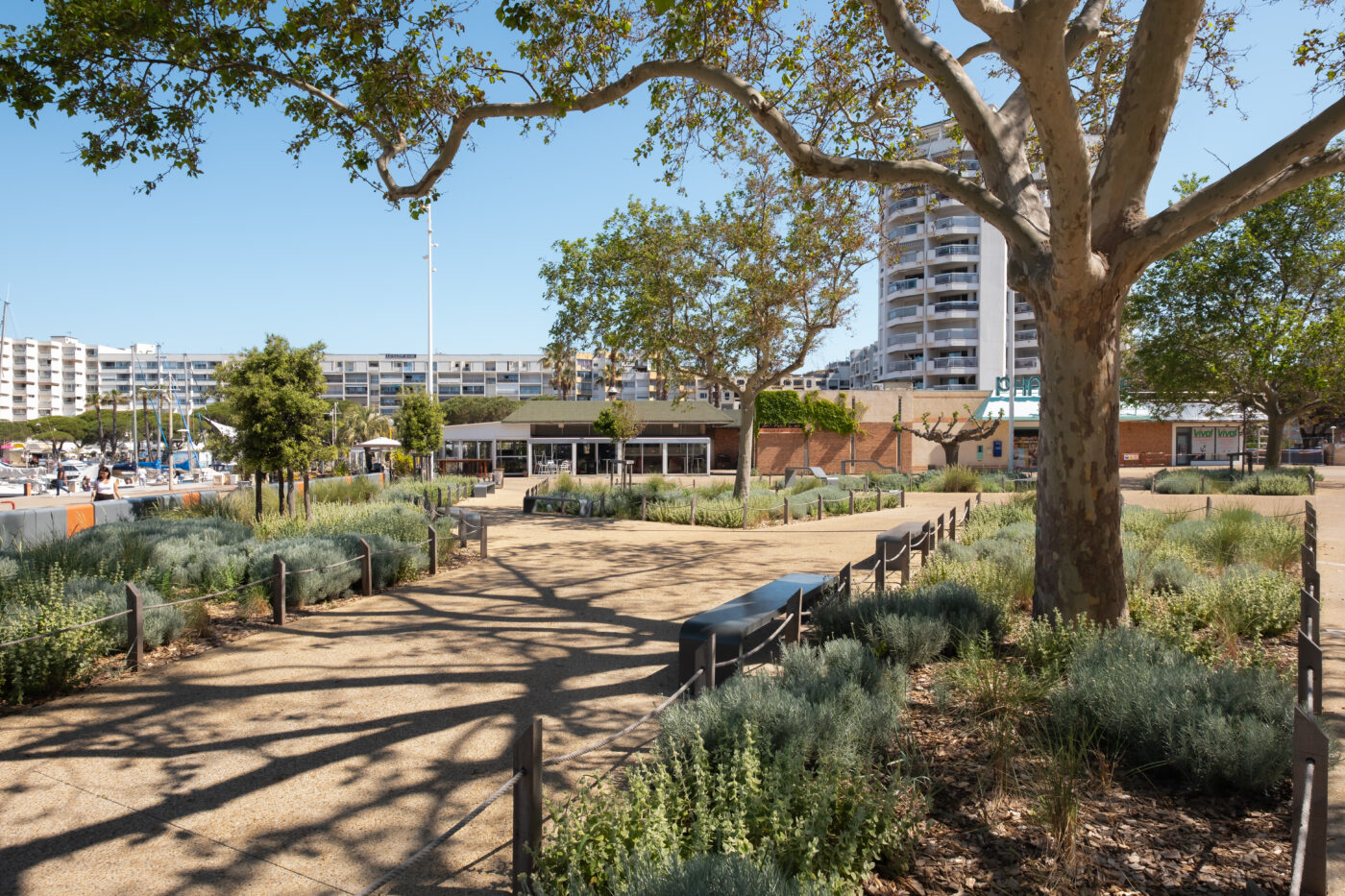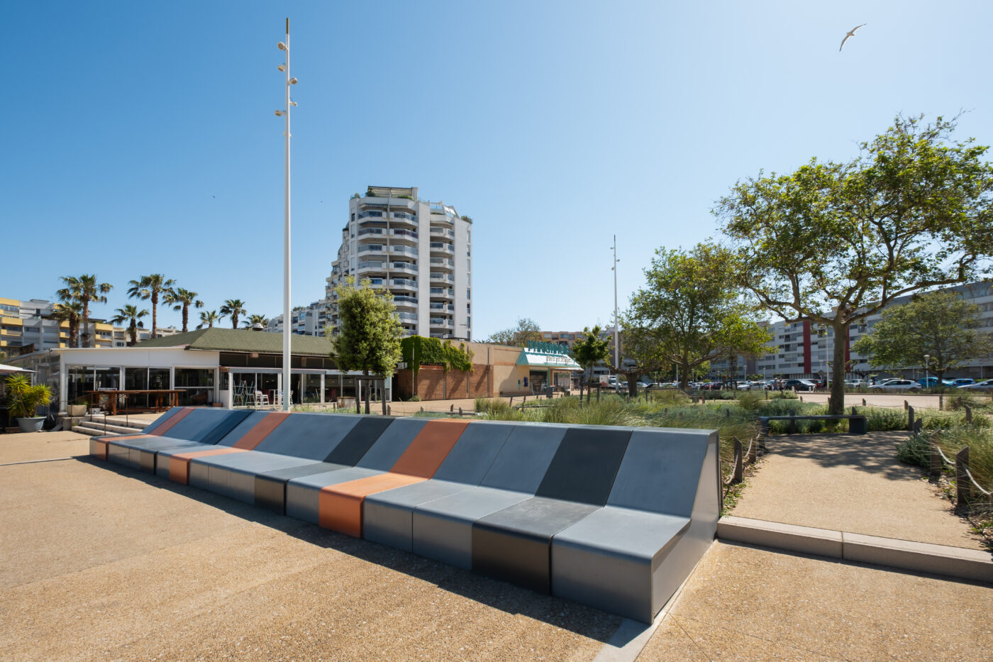 L’esplanade du port a été conçu comme lieu d’articulation entre les espaces publics de l’avenue des Comtes de Melgueil et le quai Auguste Meynier. Une harmonisation des revêtements du sol a été réalisée afin que les espaces publics soient plus lisibles et compris par les usagers.