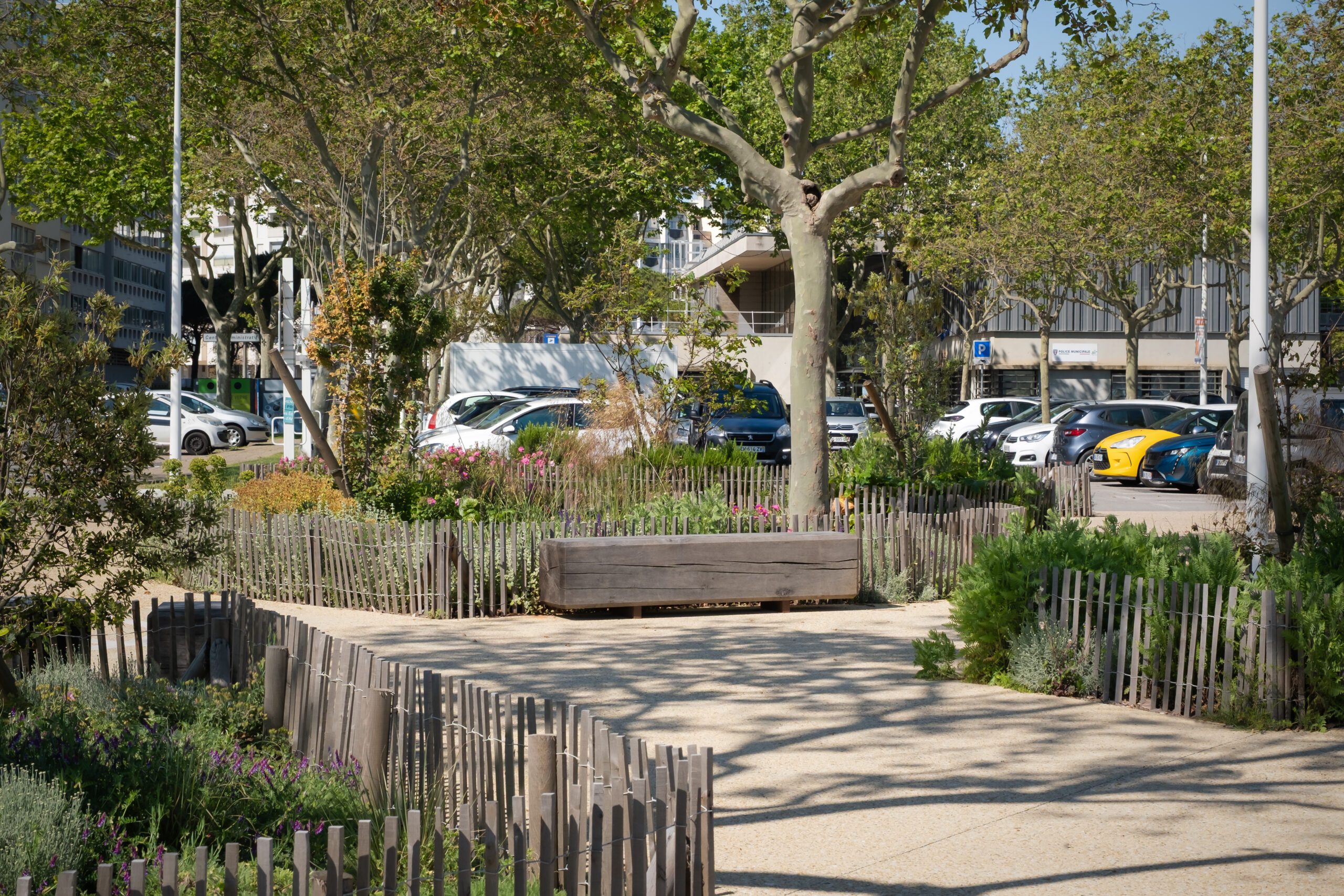 Le stationnement est déporté en arrière de station pour limiter le trafic en cœur de ville et favoriser les modes doux et les transports en commun. Le stationnement d’entrée de ville permettra de capter la majeure partie des véhicules et d’offrir un espace largement végétalisé pour apporter de l’ombrage et désimperméabiliser les sols.
