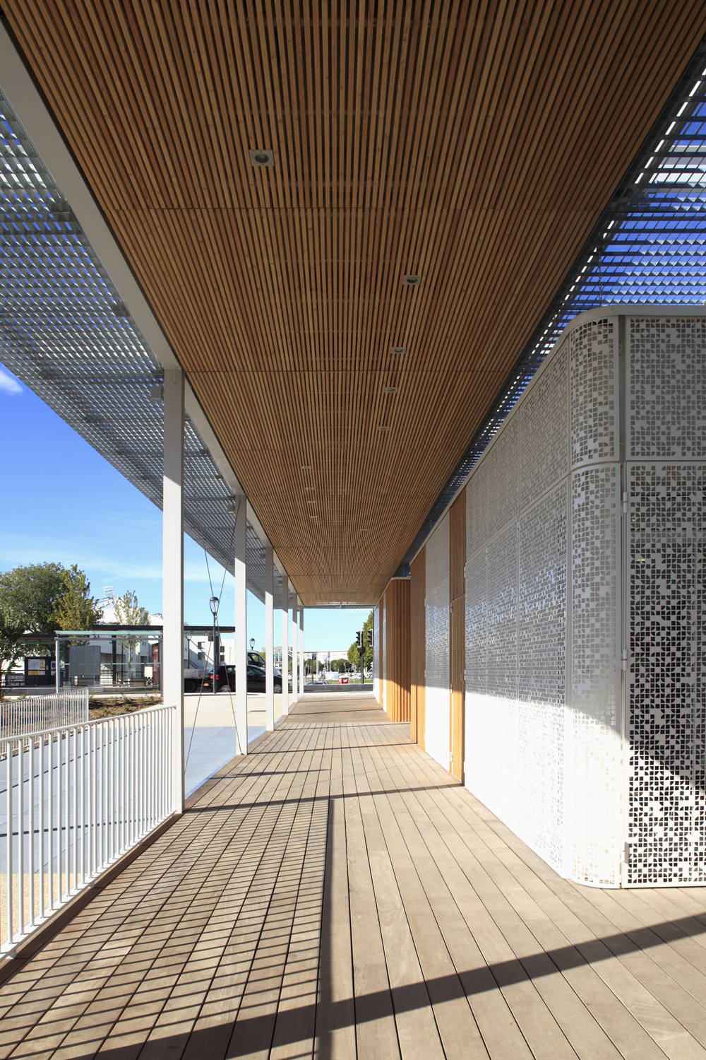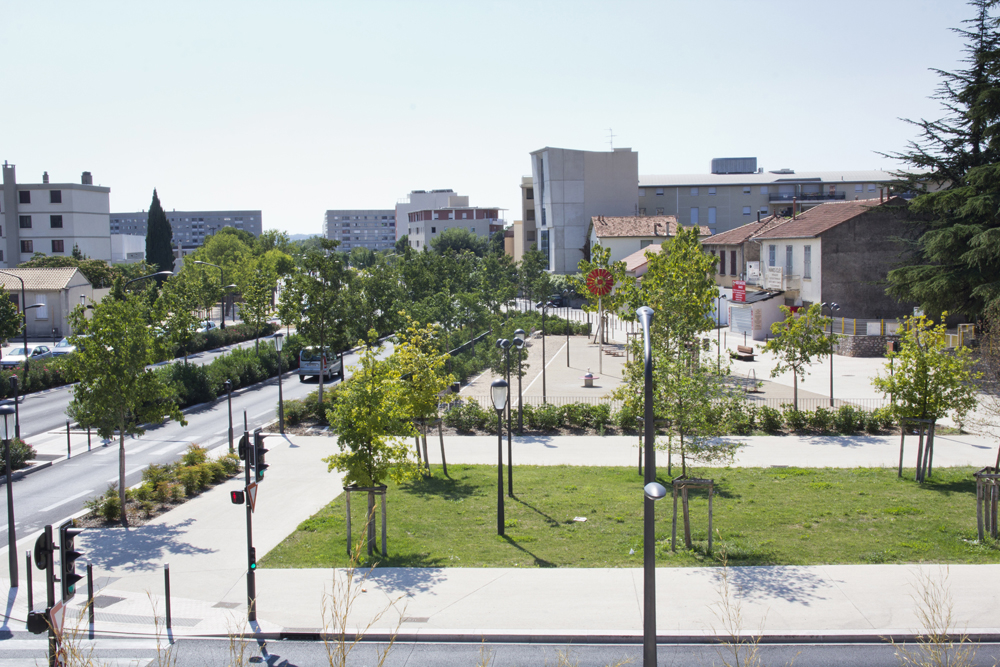 Nous avons opté pour le choix d’un espace en plateau pour signifier l’importance de l’emprise, diminuer l’impact majoritaire de la voirie et faciliter la fluidité des usages publics transversaux.
