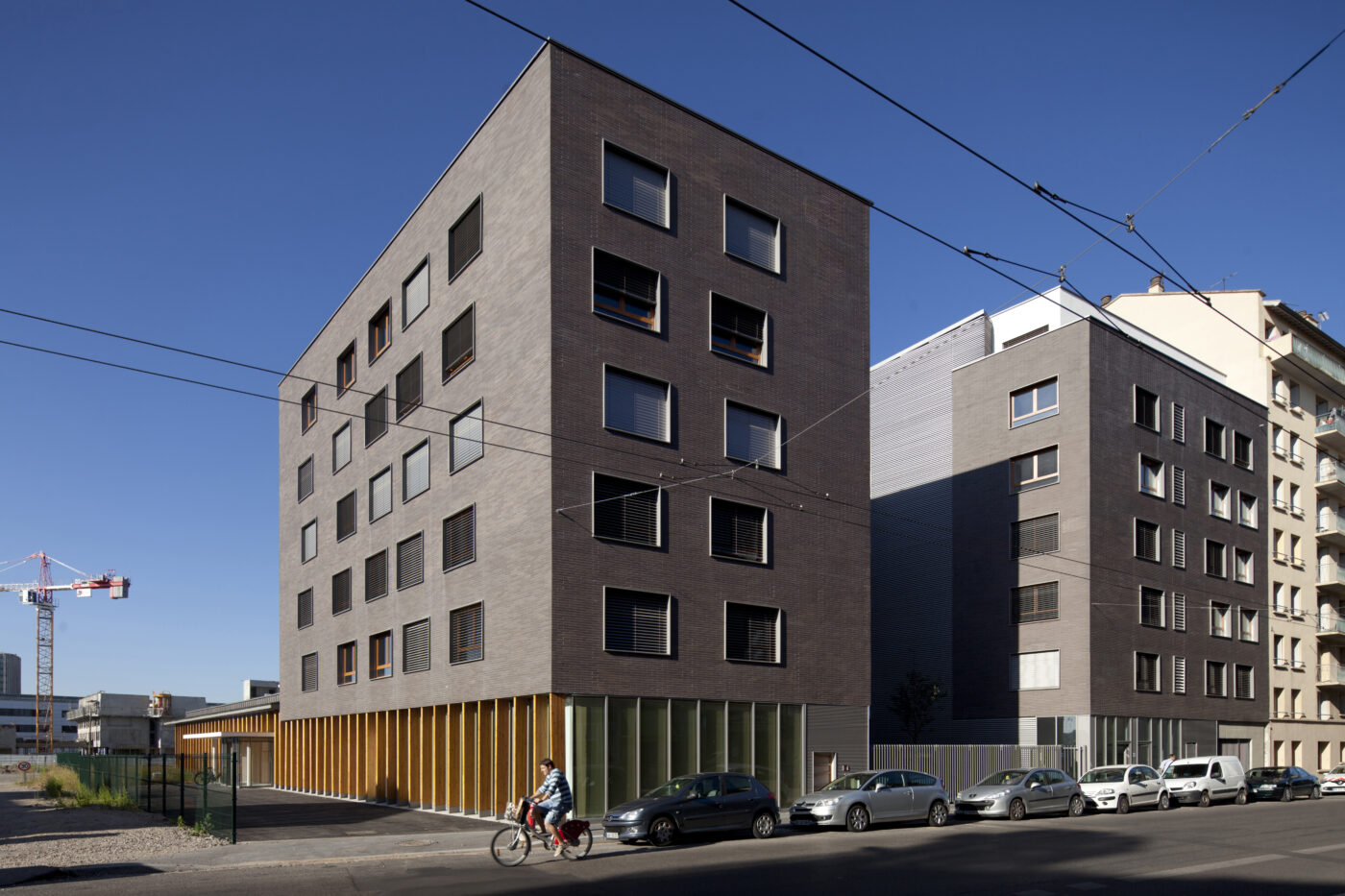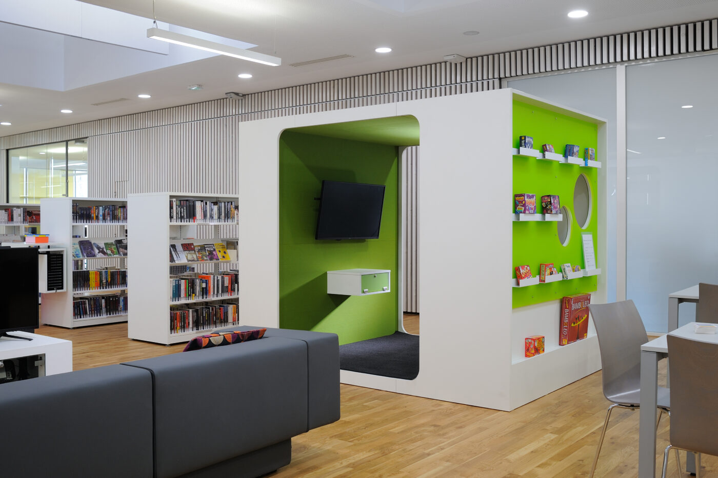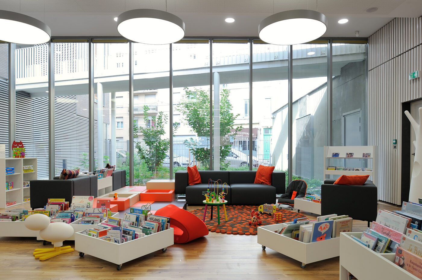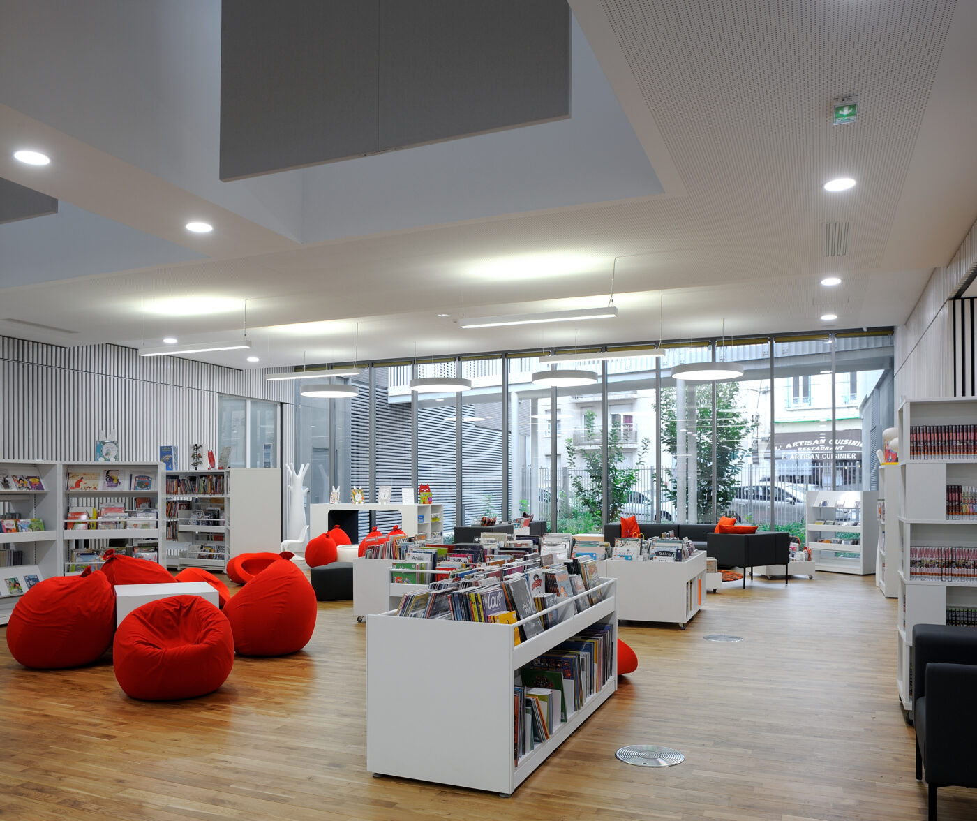 Cette bibliothèque a été réalisée en VEFA par Grand Lyon Habitat, en rez-de-chaussée d’un programme de logements, pour la ville de Lyon. Elle constitue un équipement de quartier essentiel en limite nord d’un projet global d’équipements : lycée professionnel, logements étudiants, école de design, distribué autour d’un parc public.