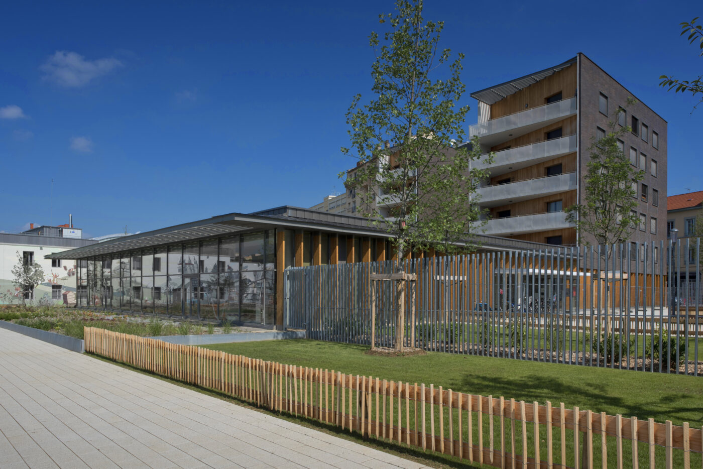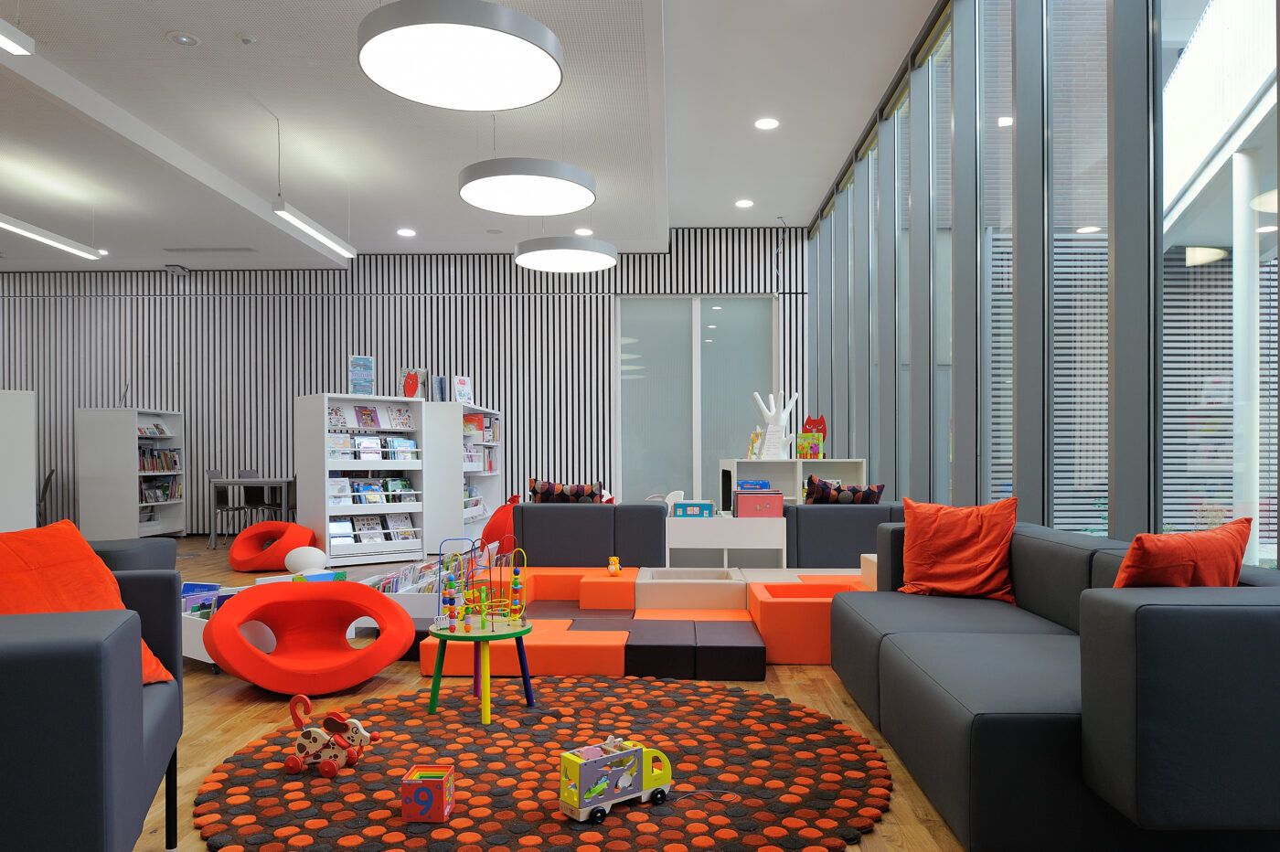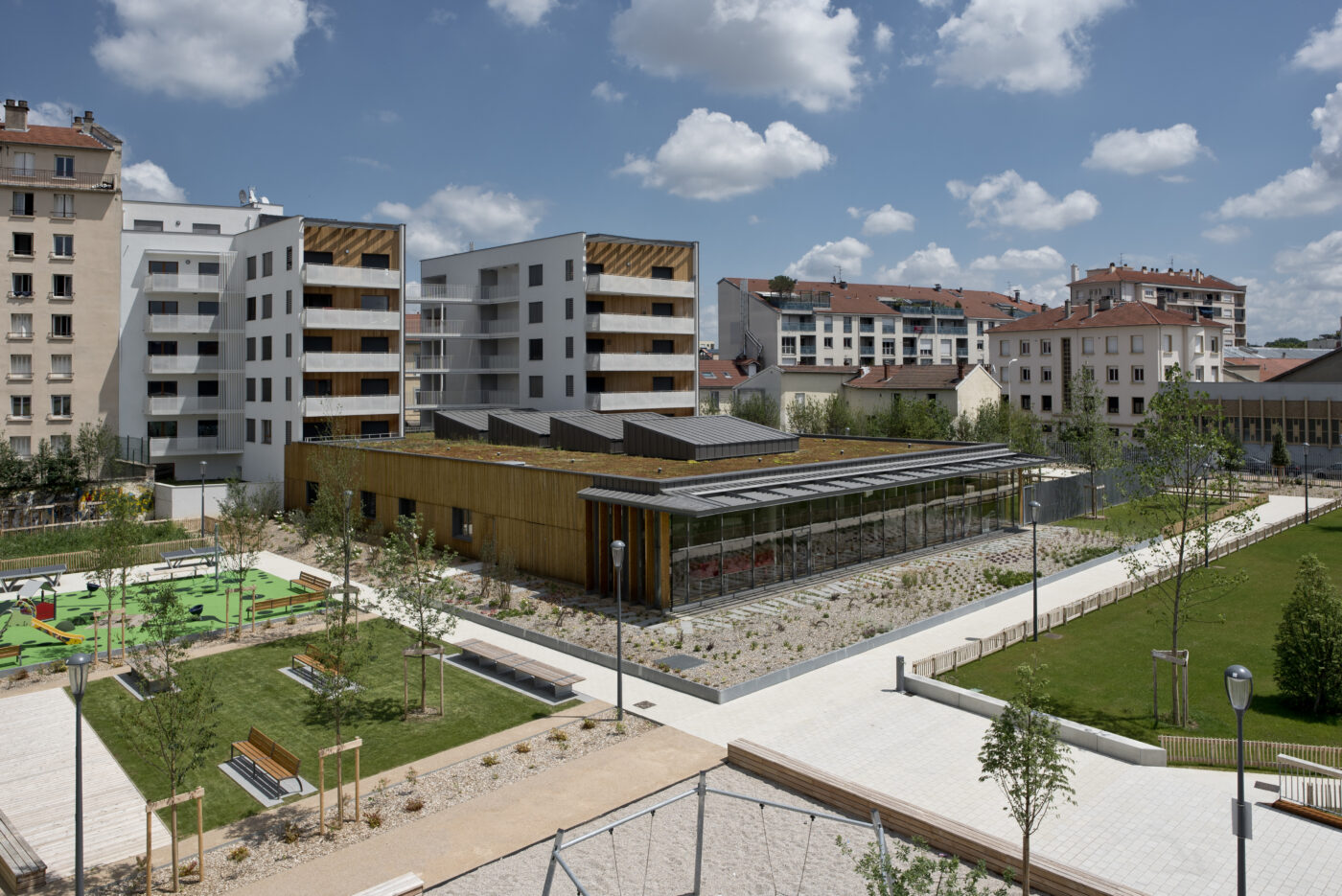 Cette bibliothèque a été réalisée en VEFA par Grand Lyon Habitat, en rez-de-chaussée d’un programme de logements, pour la ville de Lyon. Elle constitue un équipement de quartier essentiel en limite nord d’un projet global d’équipements : lycée professionnel, logements étudiants, école de design, distribué autour d’un parc public.