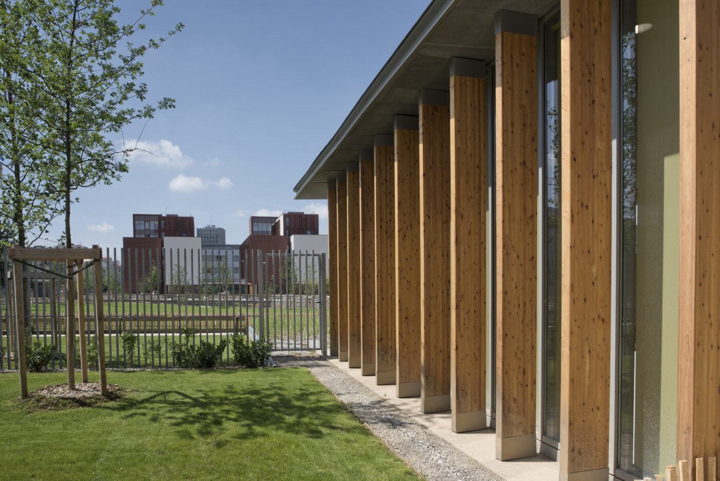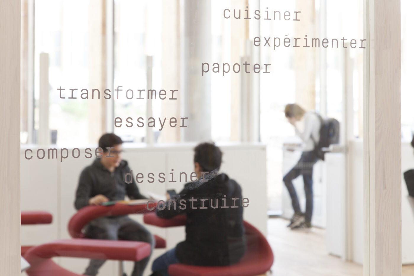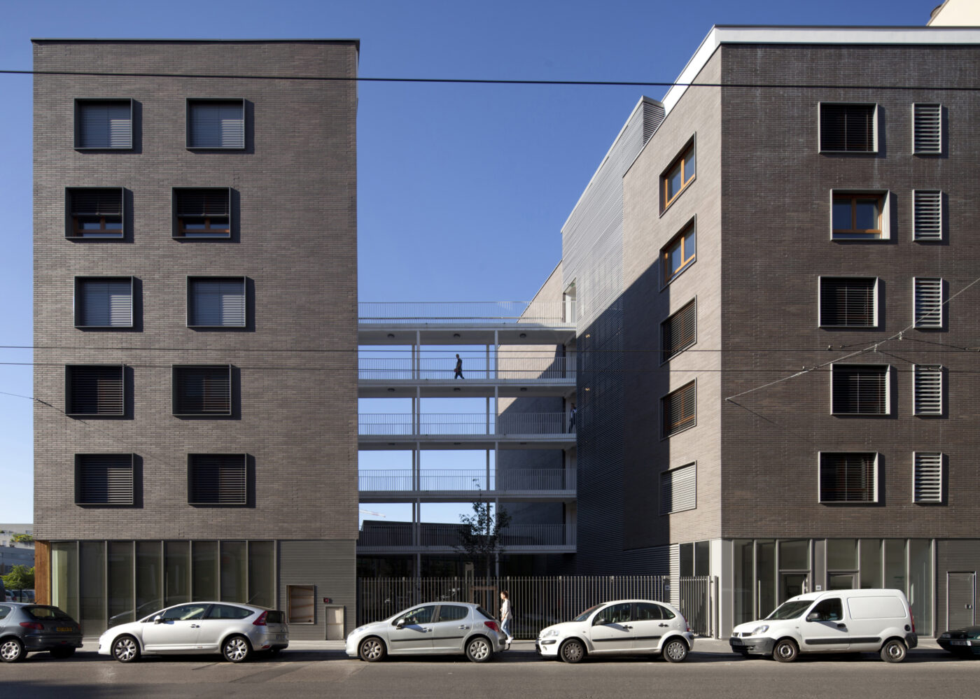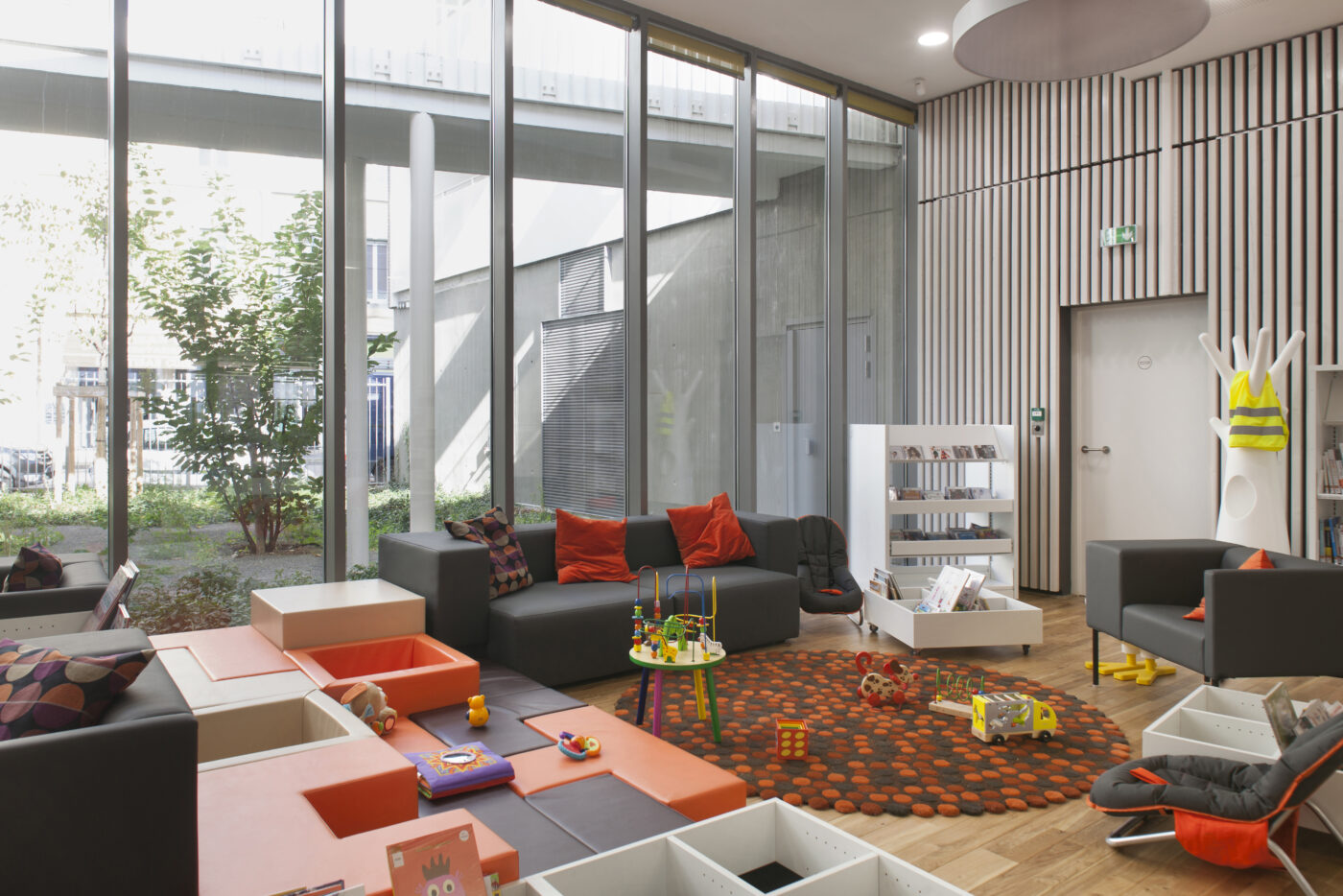 Cette bibliothèque a été réalisée en VEFA par Grand Lyon Habitat, en rez-de-chaussée d’un programme de logements, pour la ville de Lyon. Elle constitue un équipement de quartier essentiel en limite nord d’un projet global d’équipements : lycée professionnel, logements étudiants, école de design, distribué autour d’un parc public.