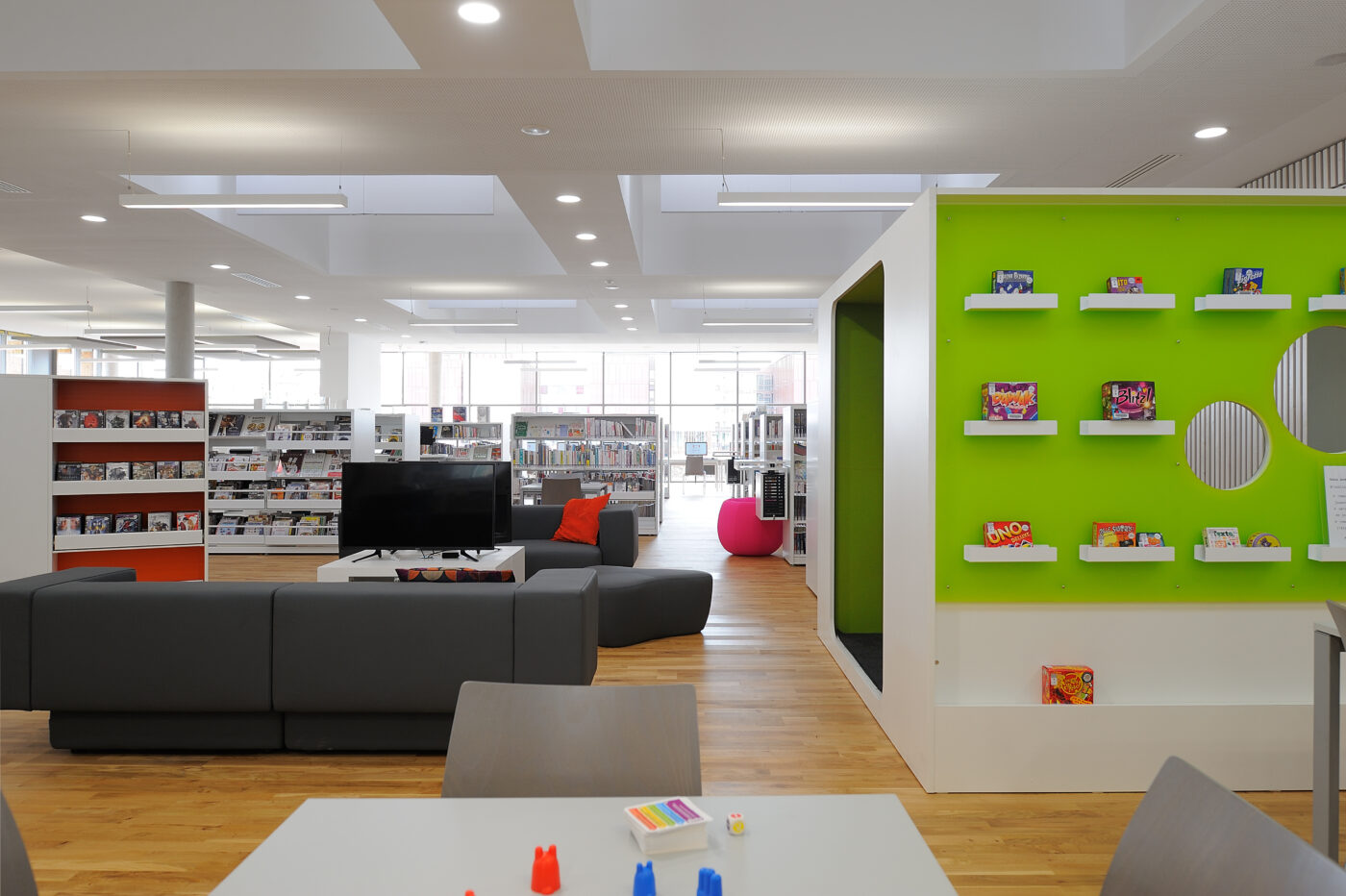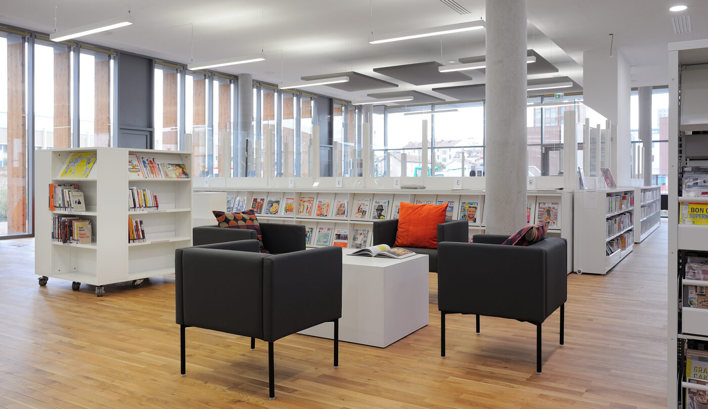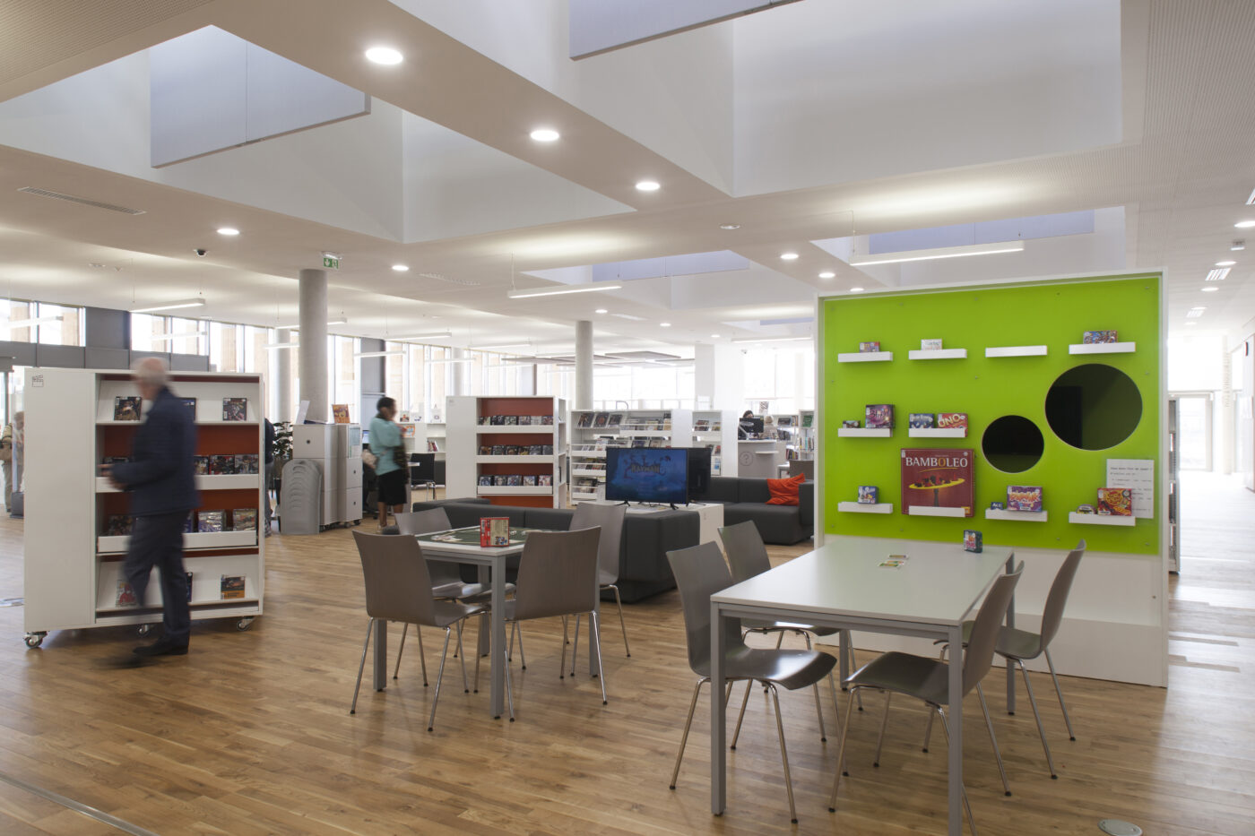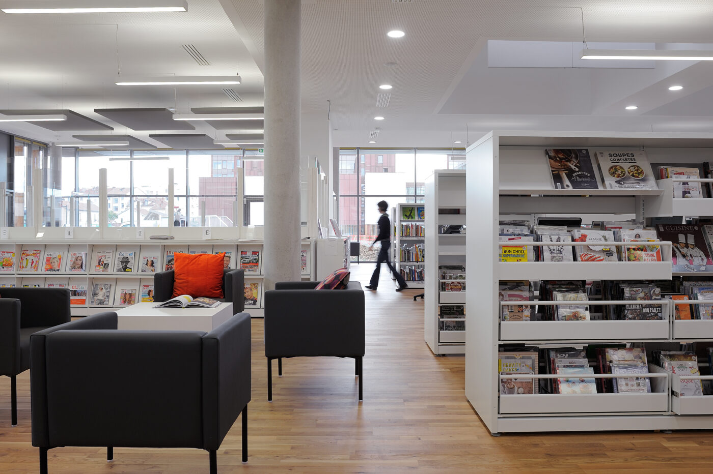 L’espace presse est en prise avec l’accueil. Les salles de consultation bénéficient très largement de la vue sur le parc public. Le grand plateau central est éclairé par des sheds qui apportent la belle lumière du nord et un volume intérieur augmenté. Les locaux du personnel sont situés en façade ouest, avec une bonne relation visuelle sur les salles. Au nord l’espace enfants un peu en retrait est plus autonome. La lumière naturelle accompagne la vie quotidienne de cette bibliothèque municipale, aménagée comme un troisième lieu, pour accueillir un large public intergénérationnel.