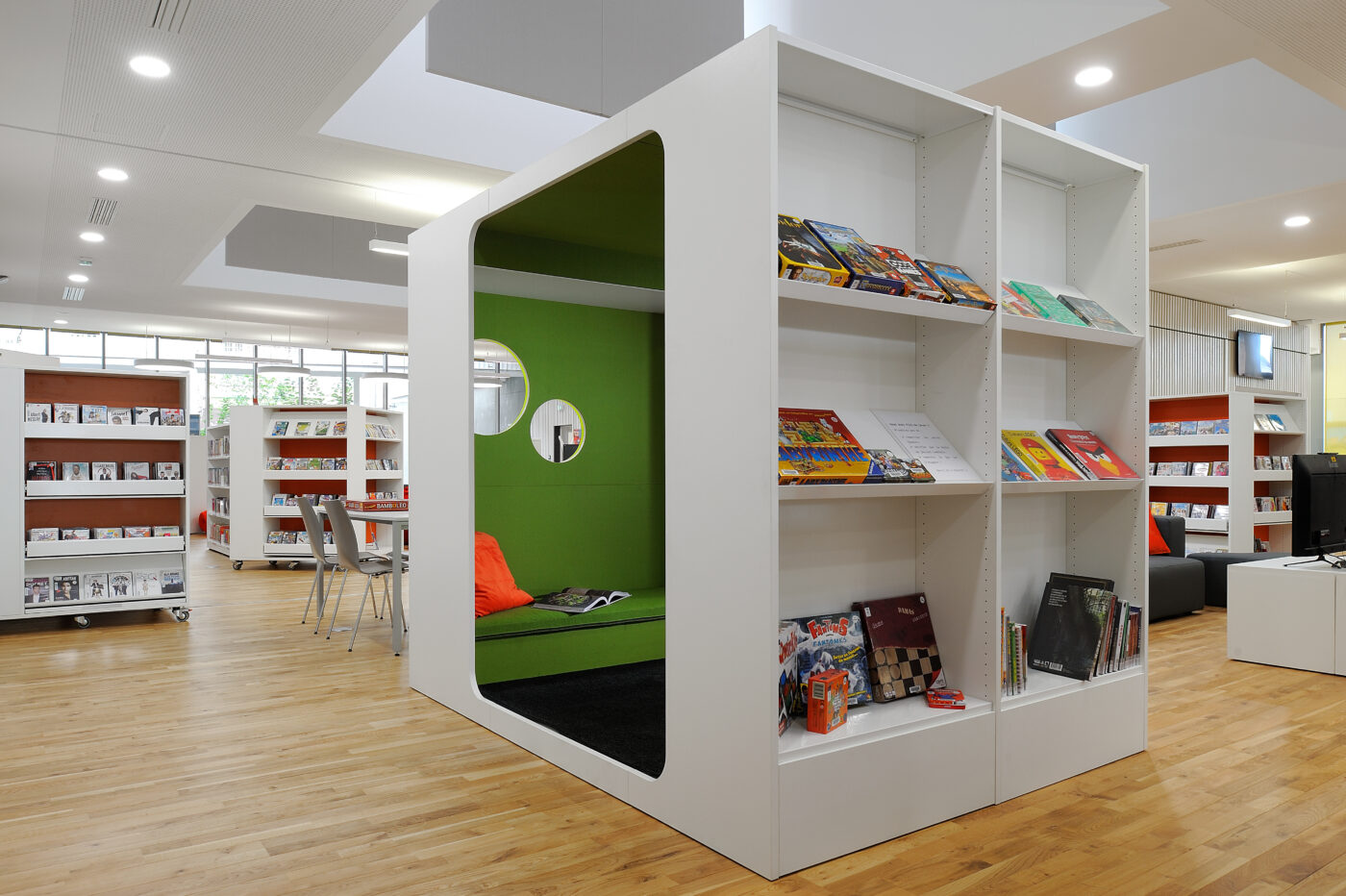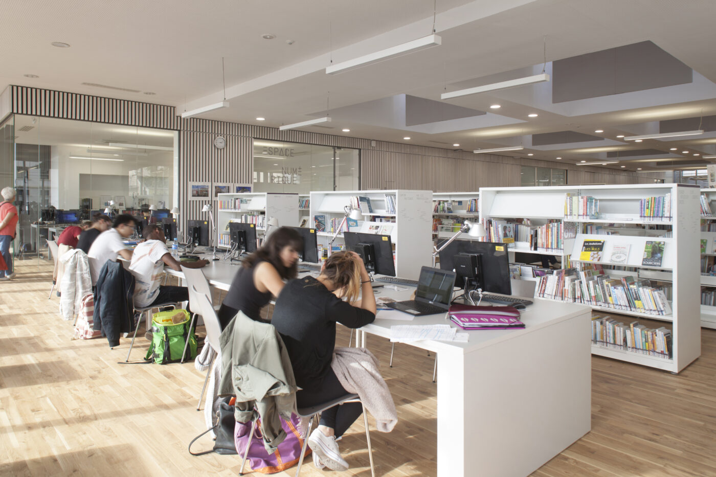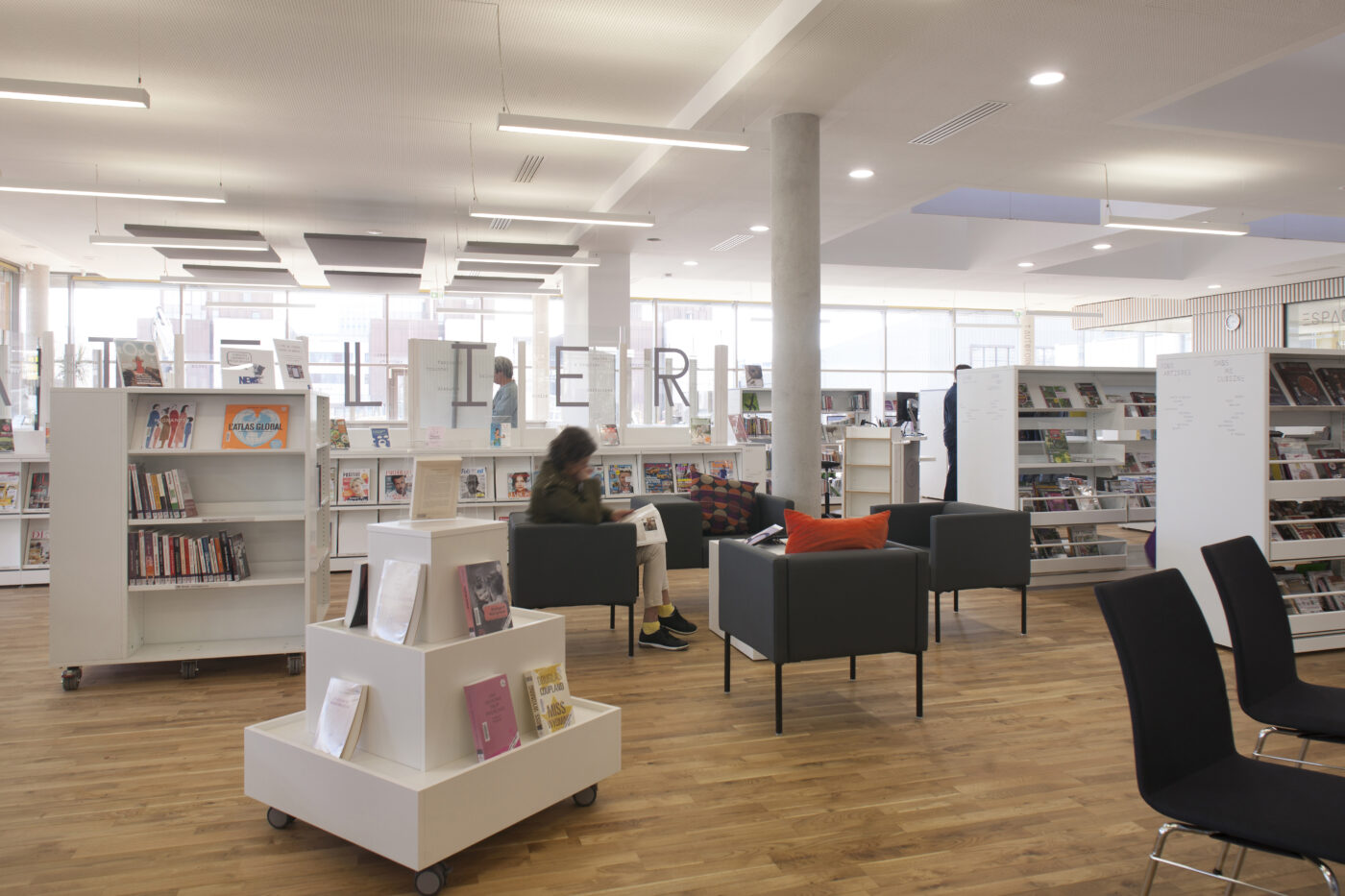 L’espace presse est en prise avec l’accueil. Les salles de consultation bénéficient très largement de la vue sur le parc public. Le grand plateau central est éclairé par des sheds qui apportent la belle lumière du nord et un volume intérieur augmenté. Les locaux du personnel sont situés en façade ouest, avec une bonne relation visuelle sur les salles. Au nord l’espace enfants un peu en retrait est plus autonome. La lumière naturelle accompagne la vie quotidienne de cette bibliothèque municipale, aménagée comme un troisième lieu, pour accueillir un large public intergénérationnel.