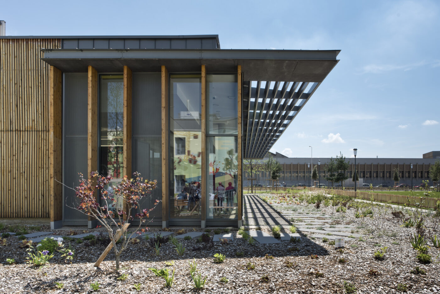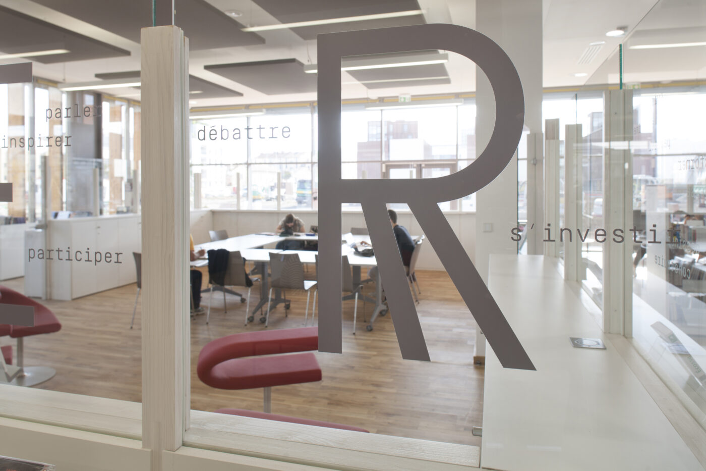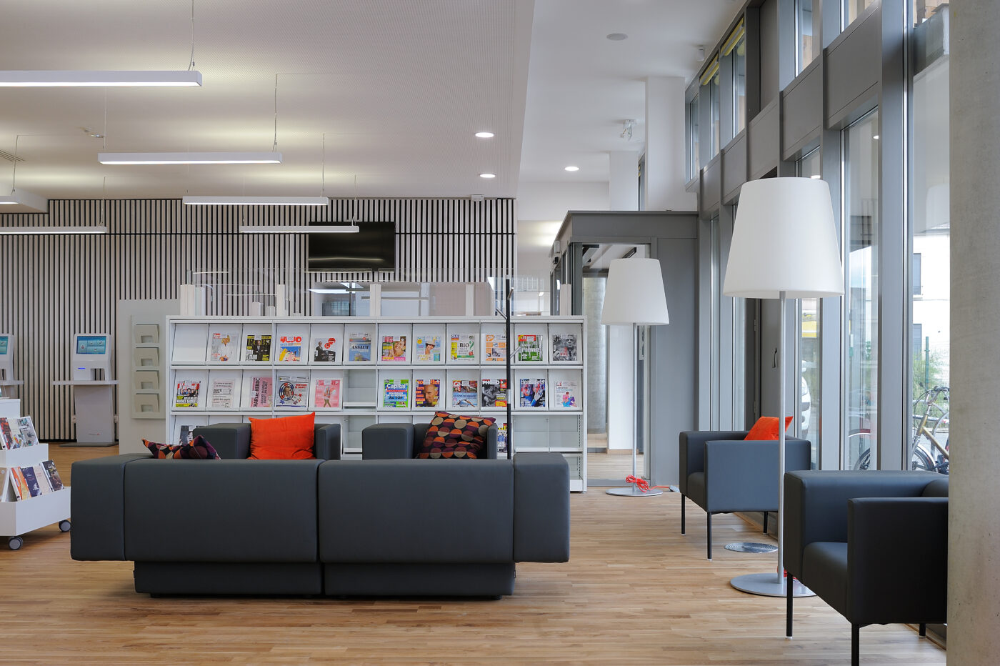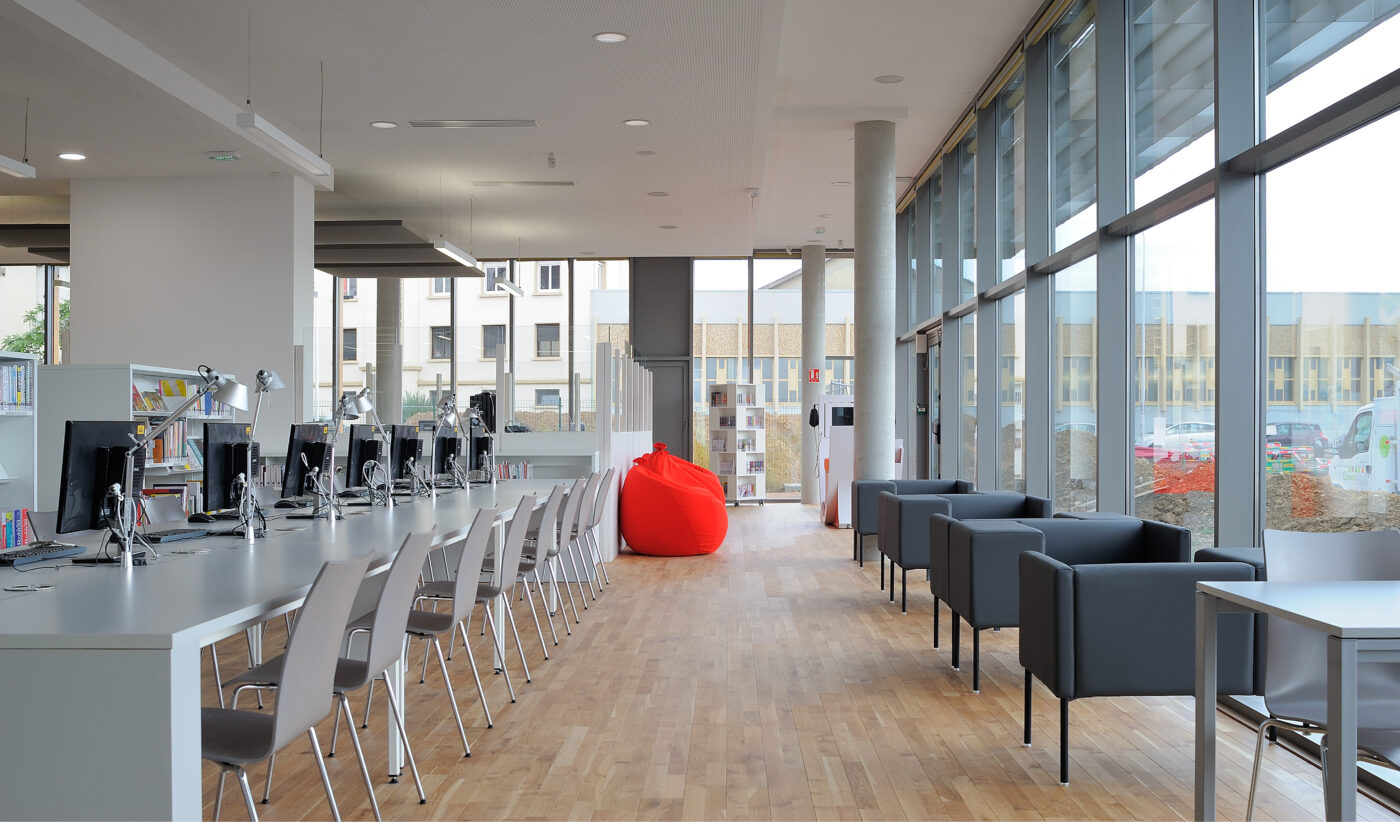 L’espace presse est en prise avec l’accueil. Les salles de consultation bénéficient très largement de la vue sur le parc public. Le grand plateau central est éclairé par des sheds qui apportent la belle lumière du nord et un volume intérieur augmenté. Les locaux du personnel sont situés en façade ouest, avec une bonne relation visuelle sur les salles. Au nord l’espace enfants un peu en retrait est plus autonome. La lumière naturelle accompagne la vie quotidienne de cette bibliothèque municipale, aménagée comme un troisième lieu, pour accueillir un large public intergénérationnel.