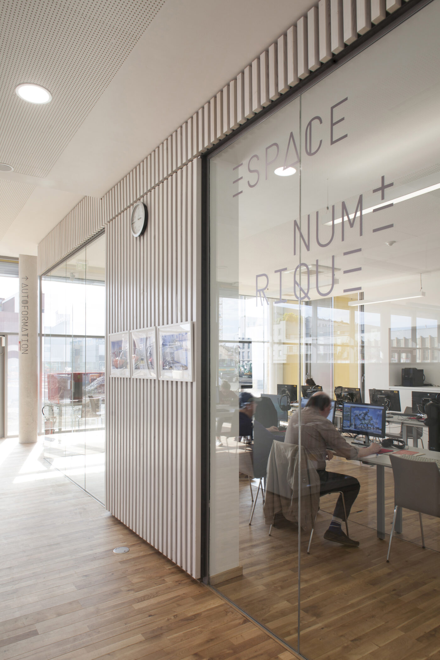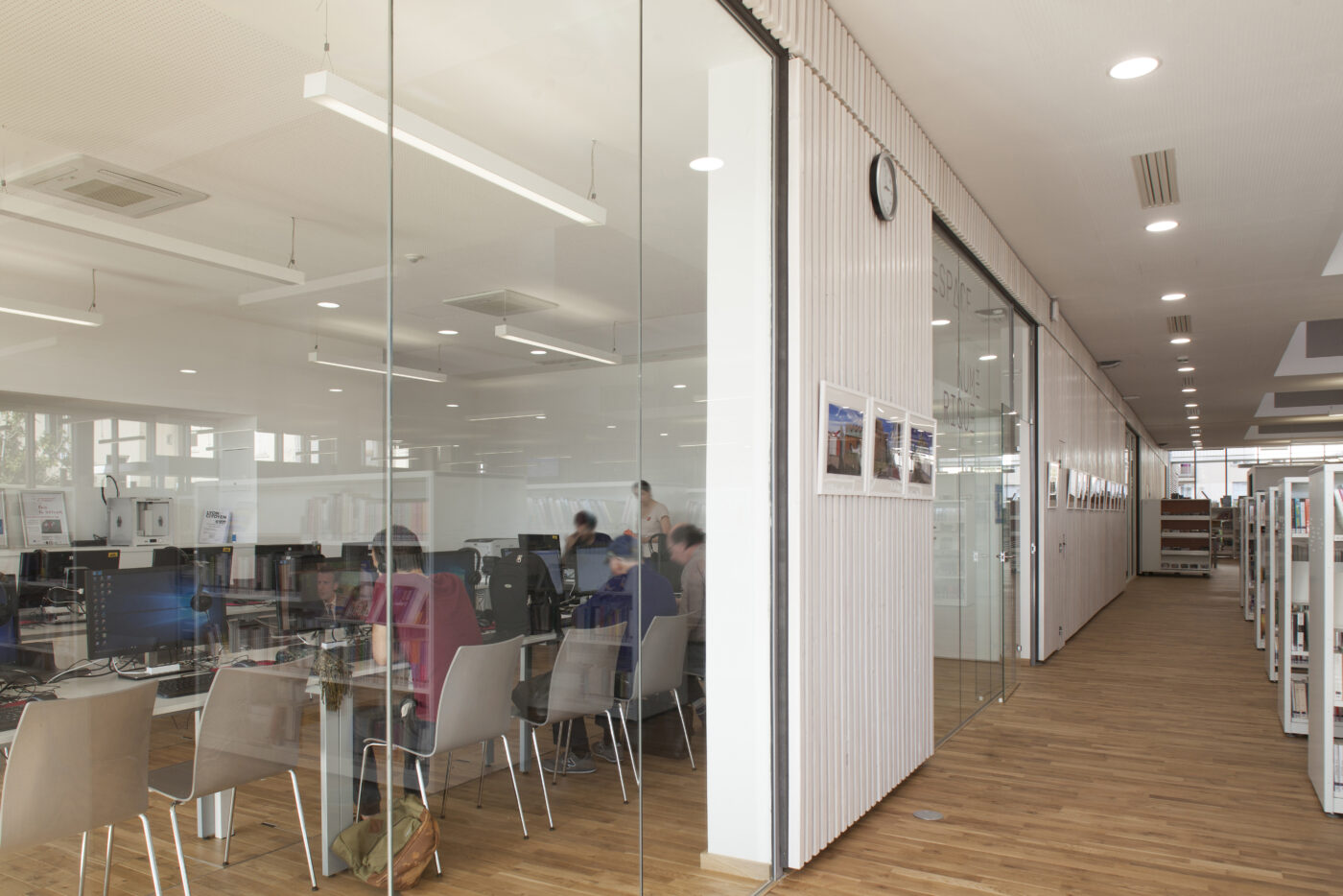 Le programme de la bibliothèque est rigoureusement traduit en termes fonctionnels et d’usage. Dès l’entrée, un sas permet d’accéder directement à la salle polyvalente. Positionnée en vitrine à l’angle de la rue, elle peut être utilisée de manière indépendante.