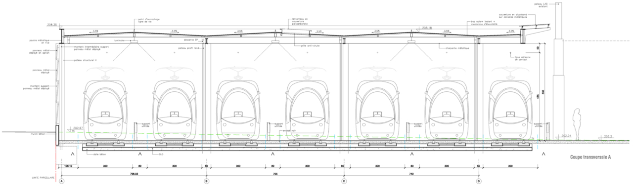 L’extension pourra accueillir 16 rames de 32 mètres. Une nouvelle station de service sera réalisée au Sud de la station existante. L’opération nécessite un réaménagement des zones de parking, aujourd’hui scindées en 2 : zone P+R public et zone du personnel de l’exploitant.
