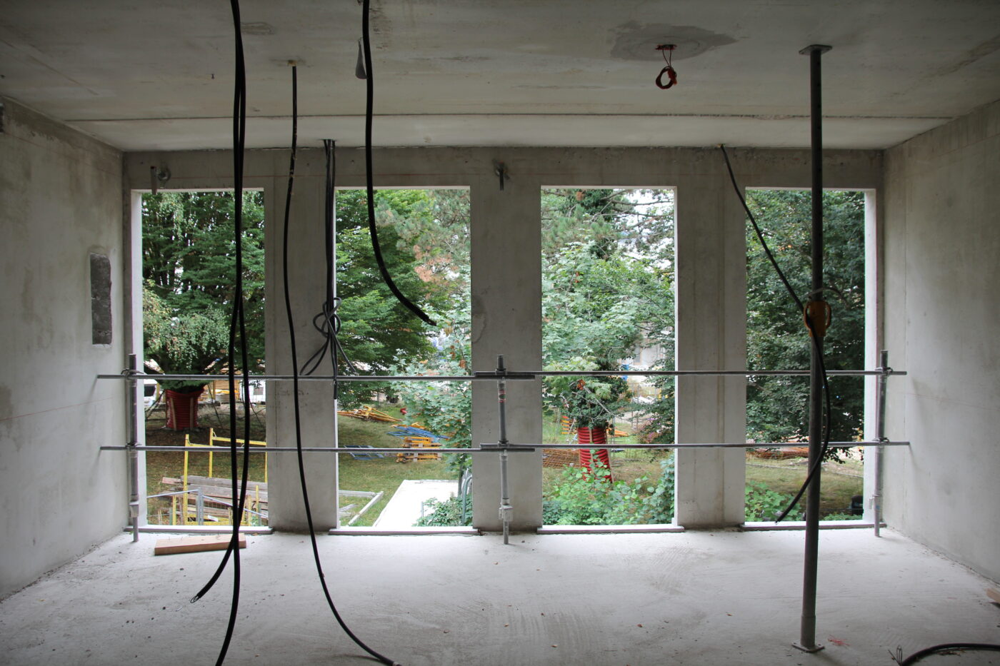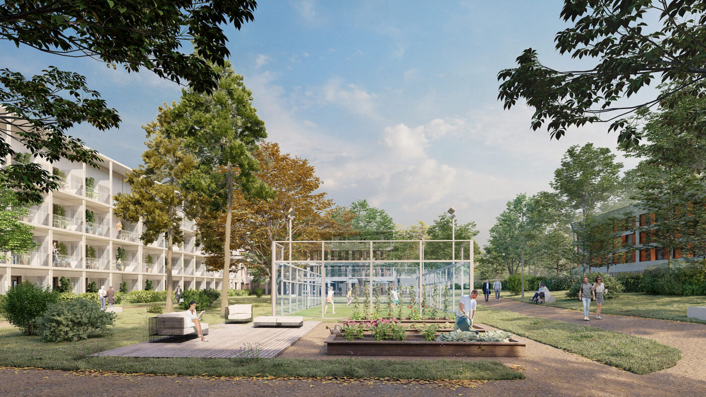 Le plan de masse présente une organisation des nouveaux bâtiments autour d’un vaste espace central et paysagé. La disposition des futurs bâtiments permet d’une part de créer un jardin intérieur à l’abri de la rue, de préserver au maximum les arbres remarquables et de composer un îlot ouvert sur son environnement. Une nouvelle place se développe au nord-est, le long du chemin des trois Noyers permettant d’organiser les différents flux véhicules, piétons, livraisons autour des bâtiments.
