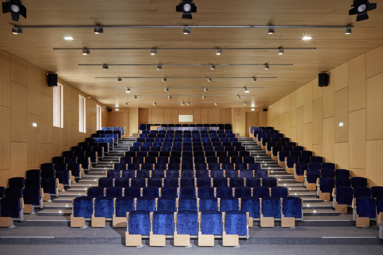 Au rez, le volume en saillie de l’amphithéâtre suit la dénivellation naturelle du terrain, offrant ainsi une entrée basse de niveau avec l’accès principal, et une entrée haute depuis le palier donnant sur l’entrée secondaire.