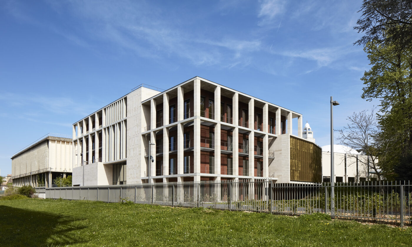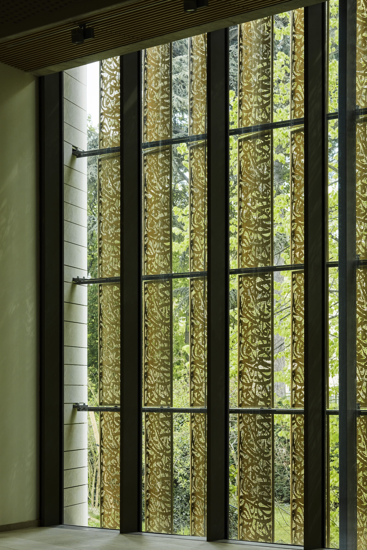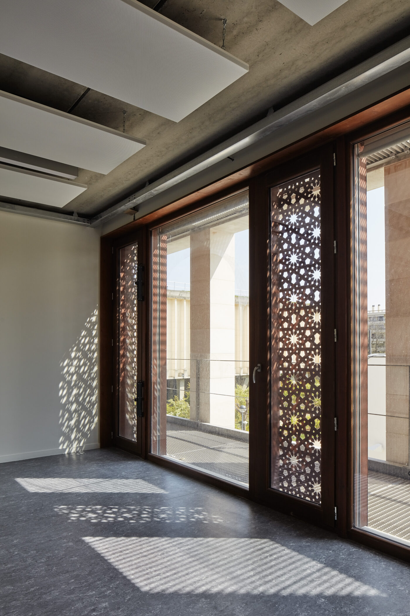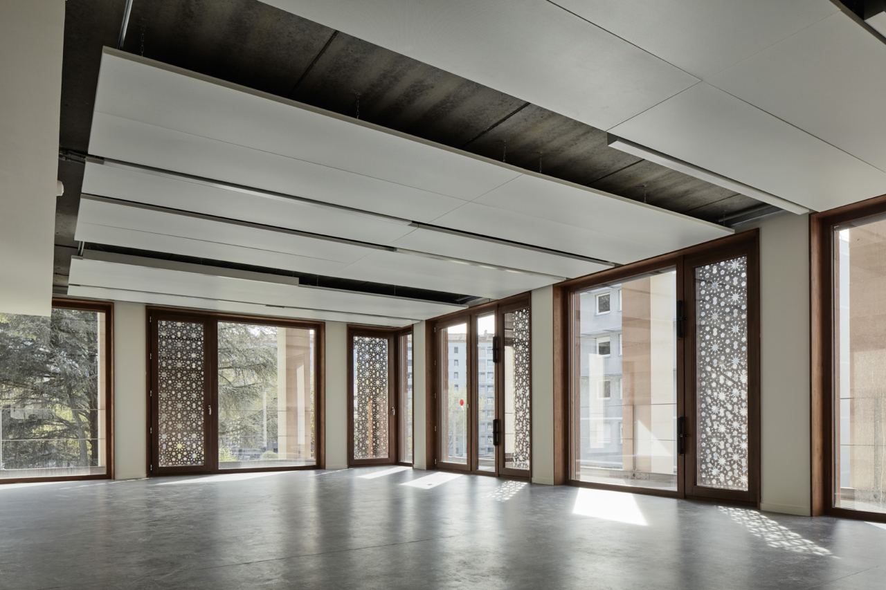 C’est aussi l’occasion d’un travail poétique et artistique en références aux arts géométriques islamiques, en jouant avec la matière, mais aussi avec la perforation qui crée un filtre, interface entre intérieur et extérieur, entre lumière solaire et éclairage artificiel, variant au fil des heures du jour et de la nuit.
