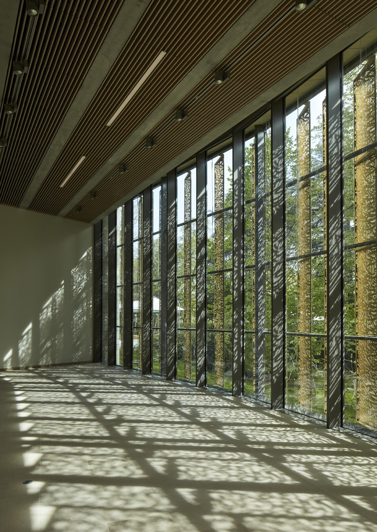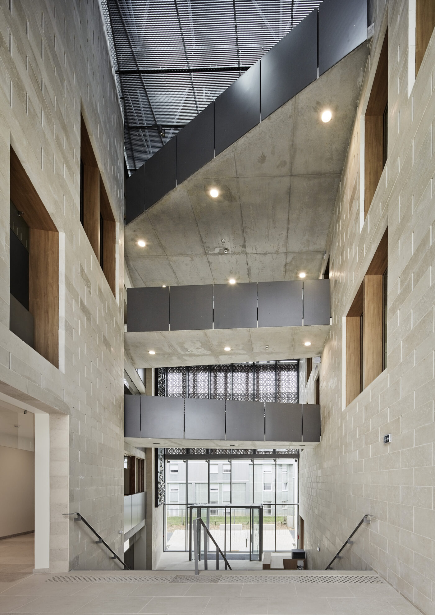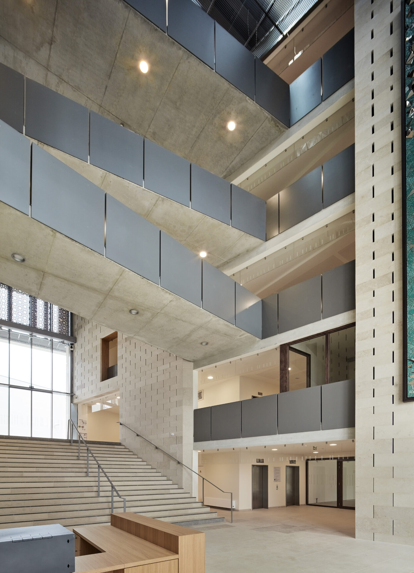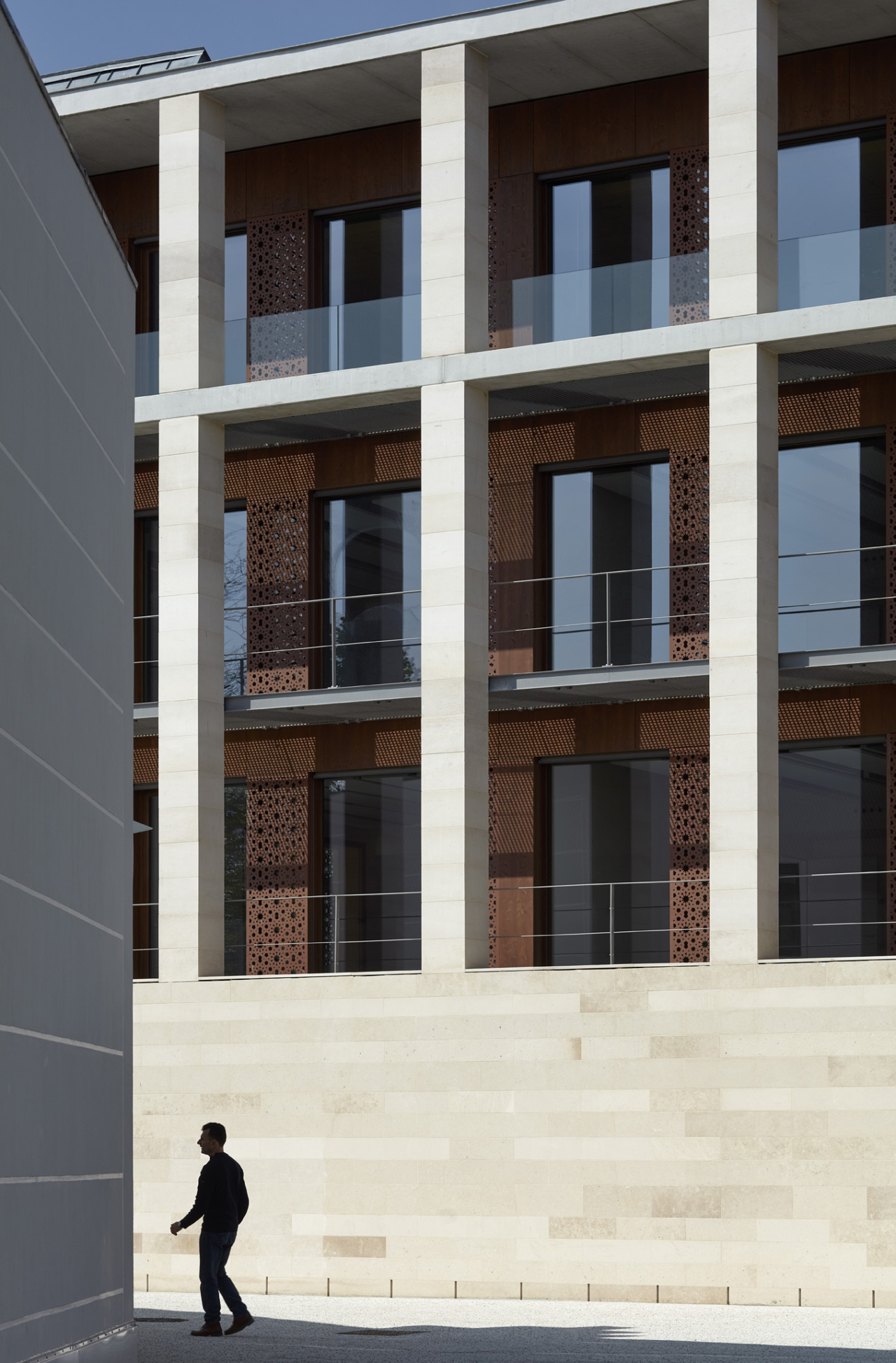 C’est aussi l’occasion d’un travail poétique et artistique en références aux arts géométriques islamiques, en jouant avec la matière, mais aussi avec la perforation qui crée un filtre, interface entre intérieur et extérieur, entre lumière solaire et éclairage artificiel, variant au fil des heures du jour et de la nuit.