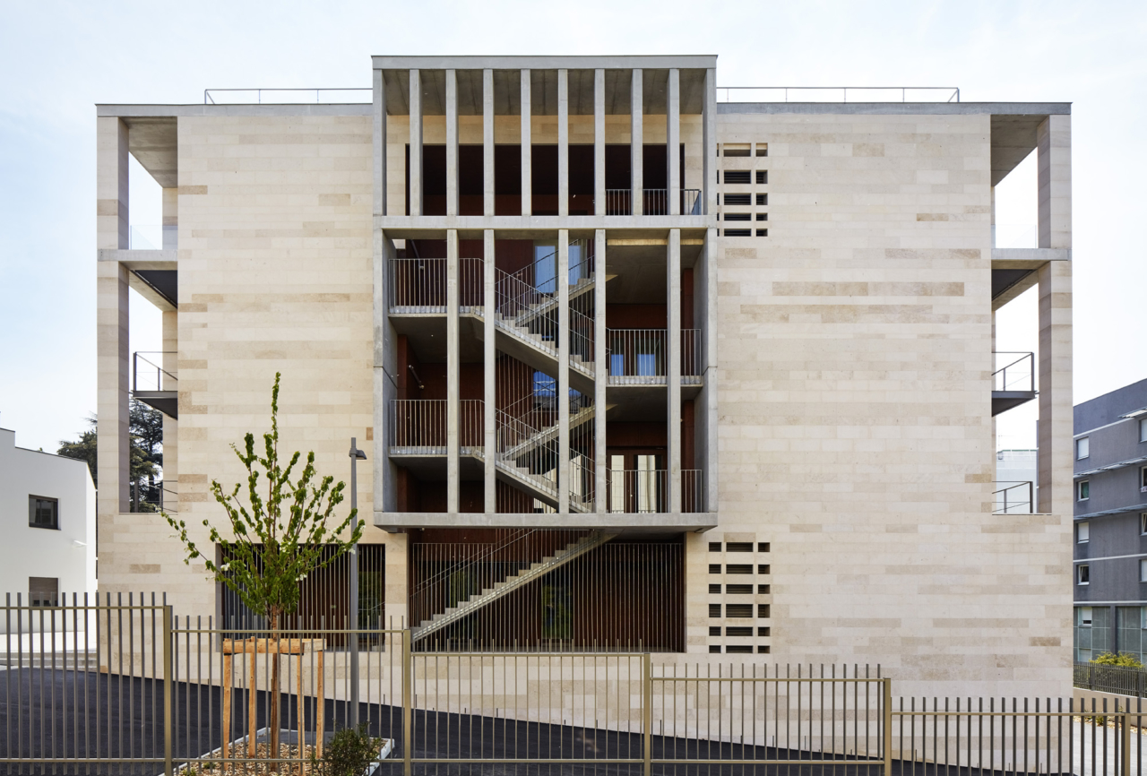 Depuis la rue Guillaume Paradin, l’accès principal longe ce parc et débouche sur un espace clos et cadré dont le caractère apaisé, en retrait des voies publiques, est propice à ce programme.