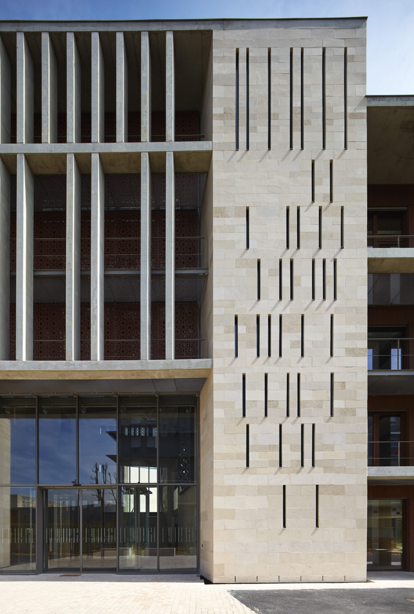 – La pierre qui inscrit le projet dans la durée (pérennité, qualité, durabilité), forme un socle massif et les portiques des niveaux supérieurs.