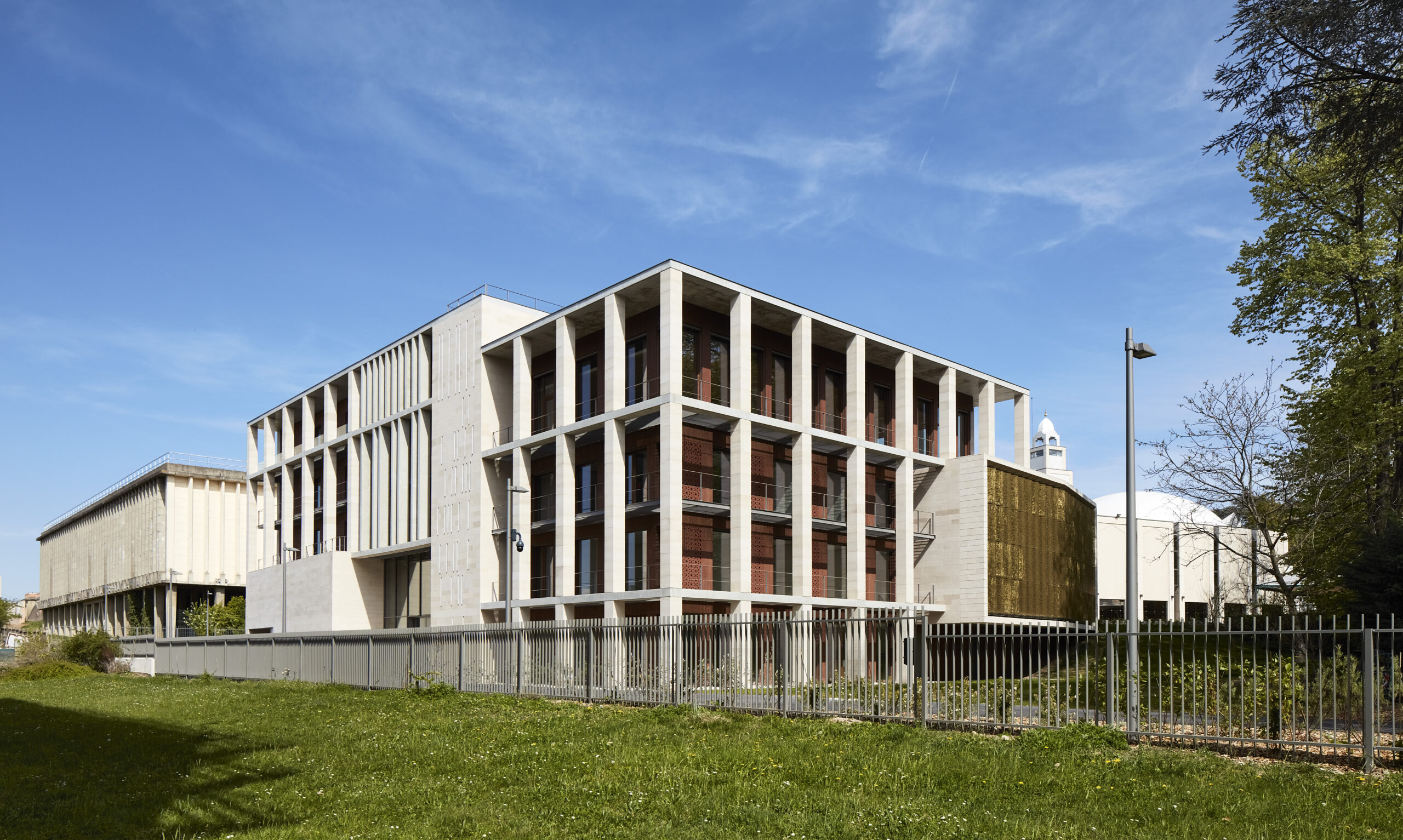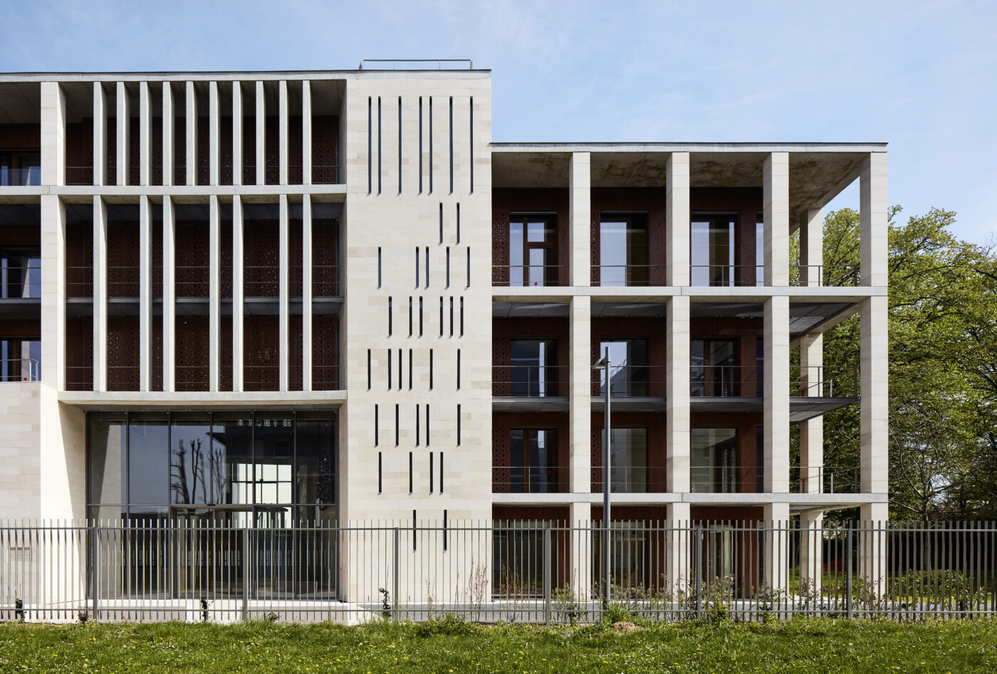 La géométrie est dessinée par hauts portiques en pierre, qui donnent au bâtiment du rythme et de l’épaisseur. La pierre ajoute au caractère massif de cette architecture découpée et expressive…