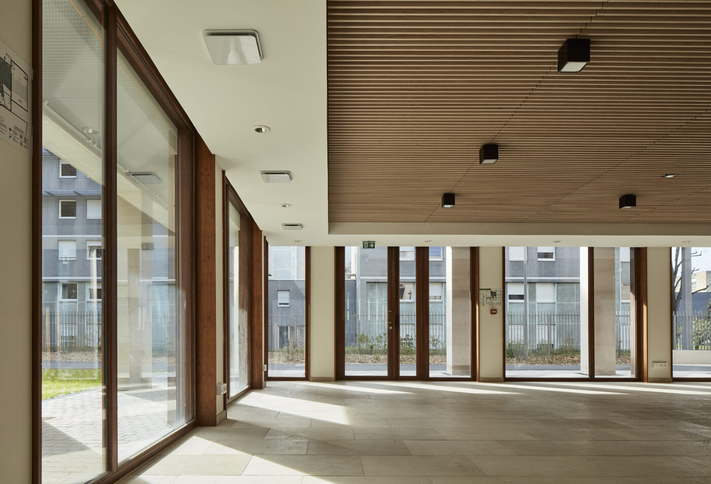 Le rez-de-jardin compose avec la pente naturelle du site. Un atrium, ou rue intérieure, aménagé avec un large escalier ouvre sur un petit parvis, à l’arrière de la mosquée. Il permet ainsi de « trabouler » en traversant le bâtiment en direction de l’entrée de la mosquée et du boulevard Pinel.