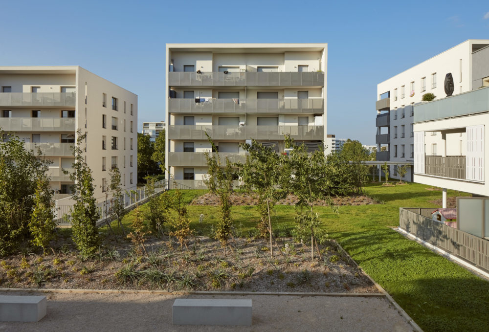 Un vaste jardin suspendu situé au niveau 1 constitue un cœur d’ilot végétalisé propice à biodiversité, il permet aussi de desservir l’ensemble des logements.
