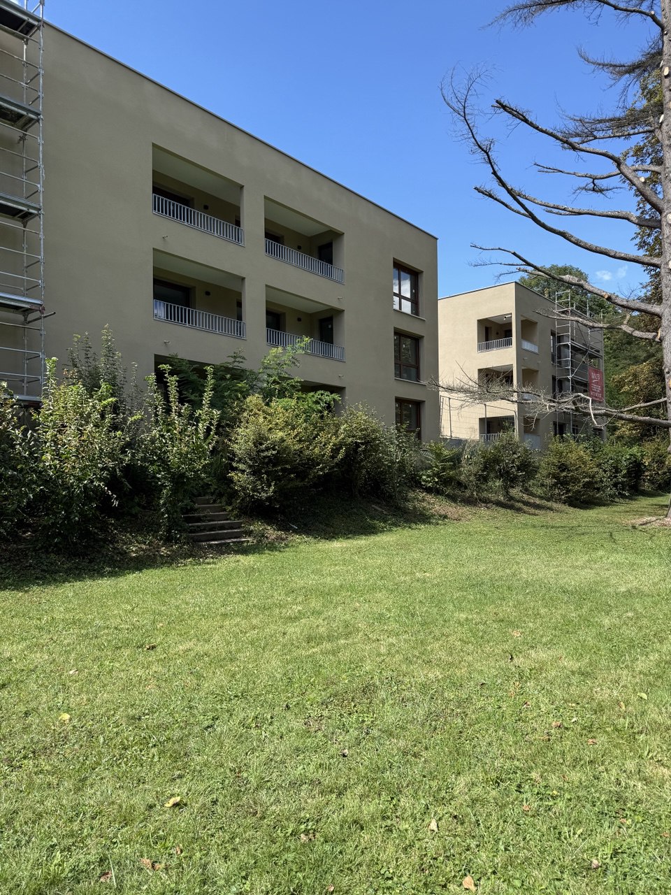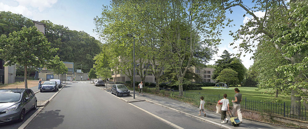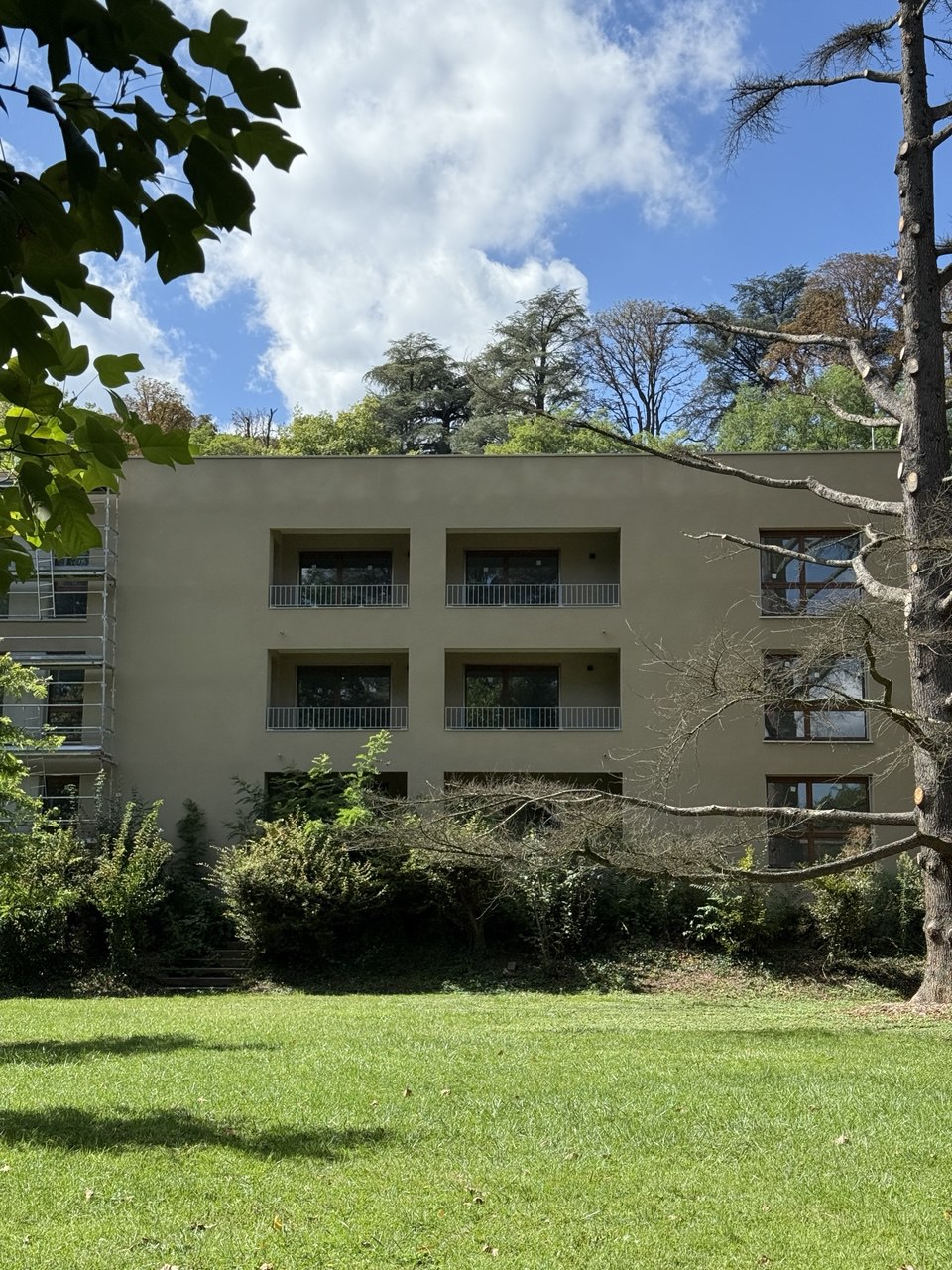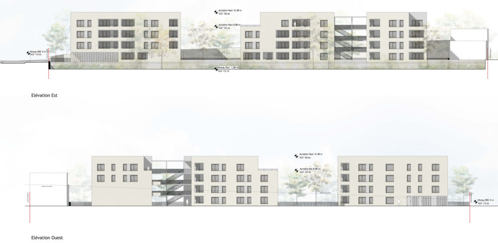 Al hauteur du bâtiment est limité en R+2 afin de s’inscrire au pied des pentes, et préserver les vues vers le parc à l’Est. Les volumes sont sobres, avec deux plots de logement sont liés par une coursive.