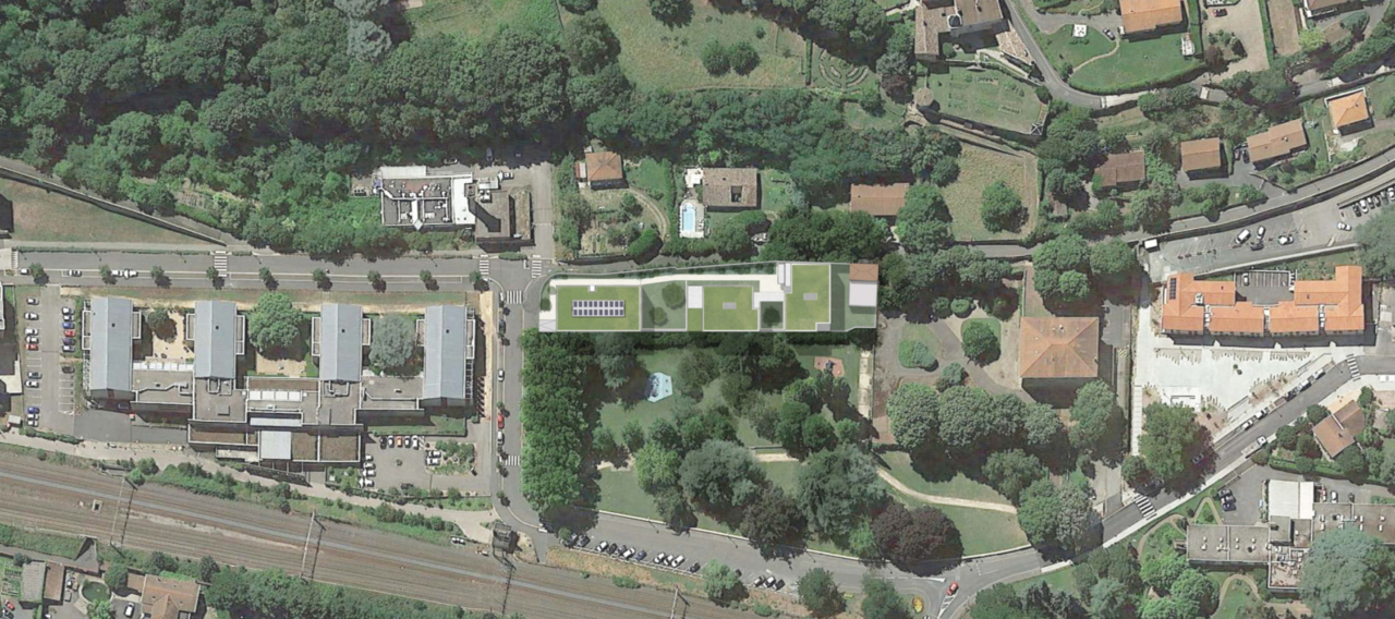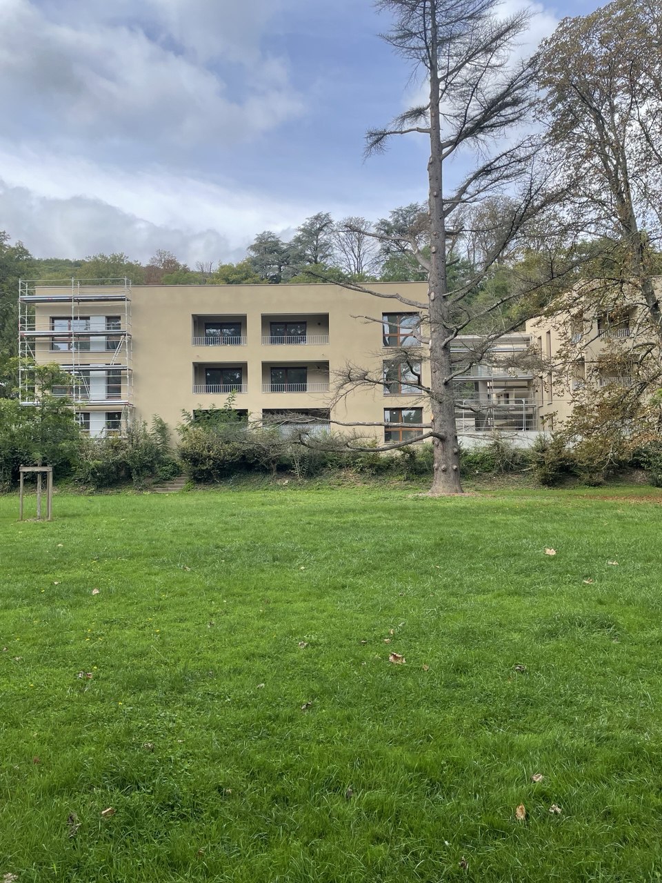 La parcelle est longue et étroite, en pied des Mont d’or, bord par un parc.