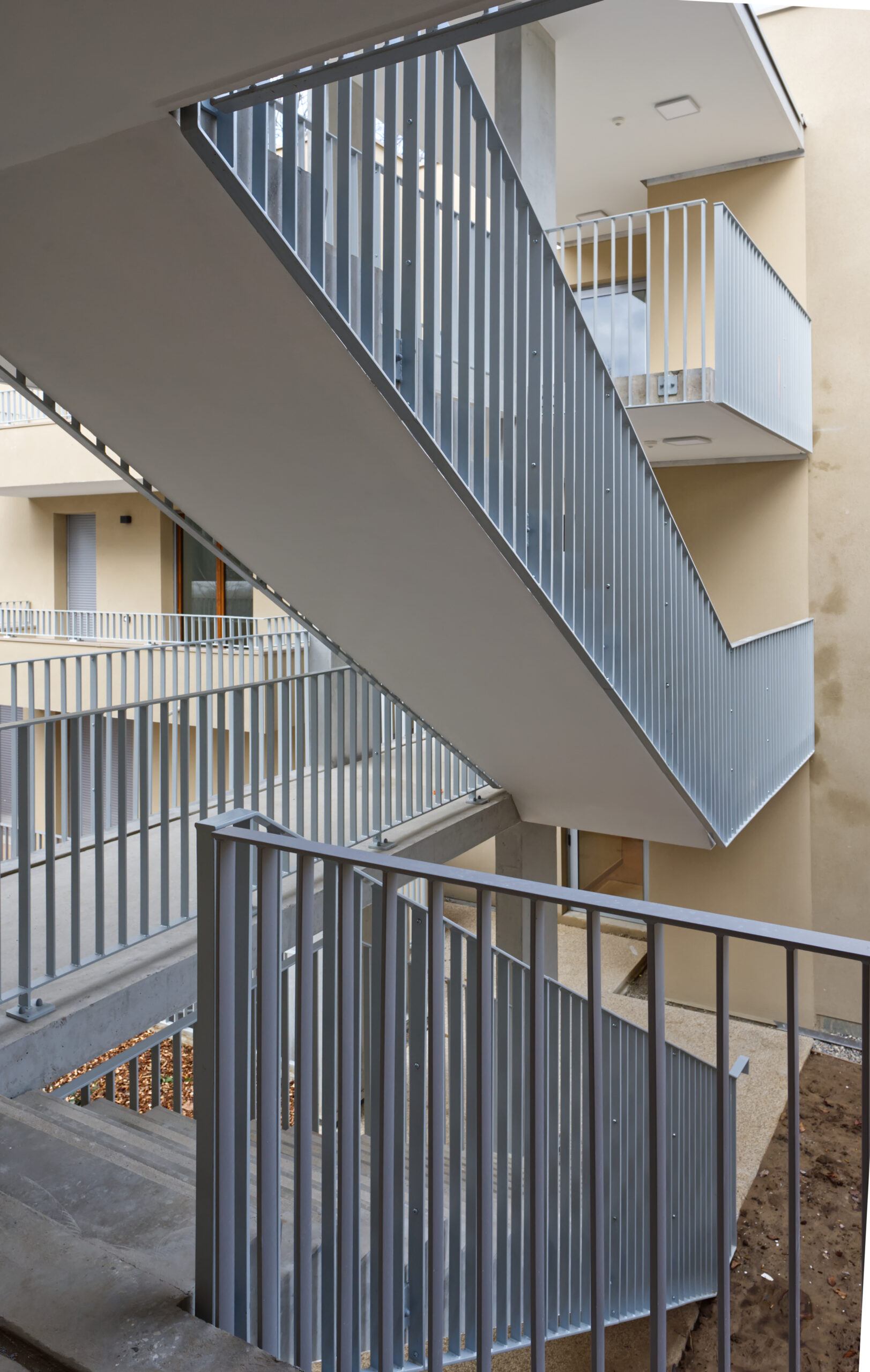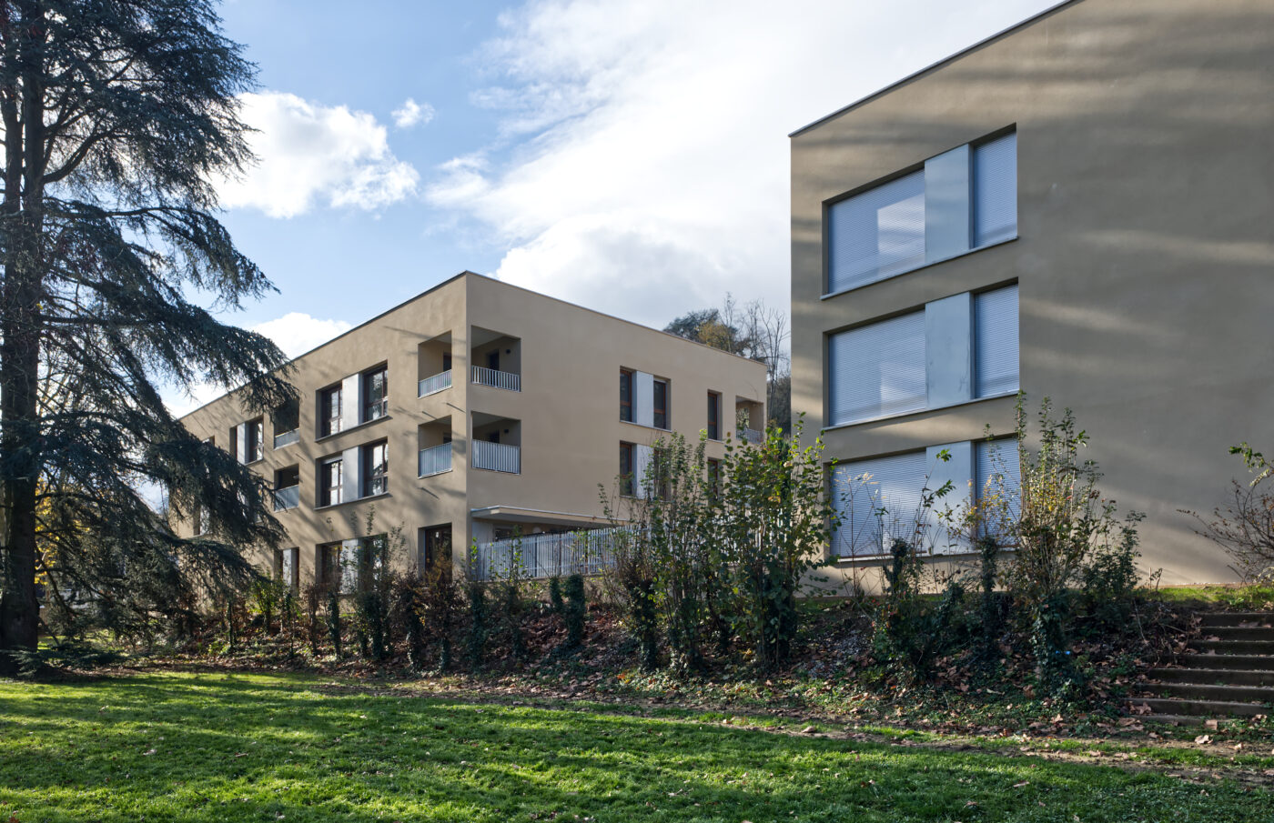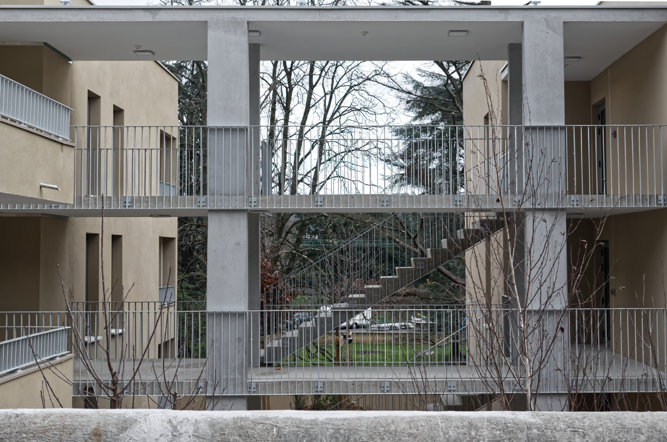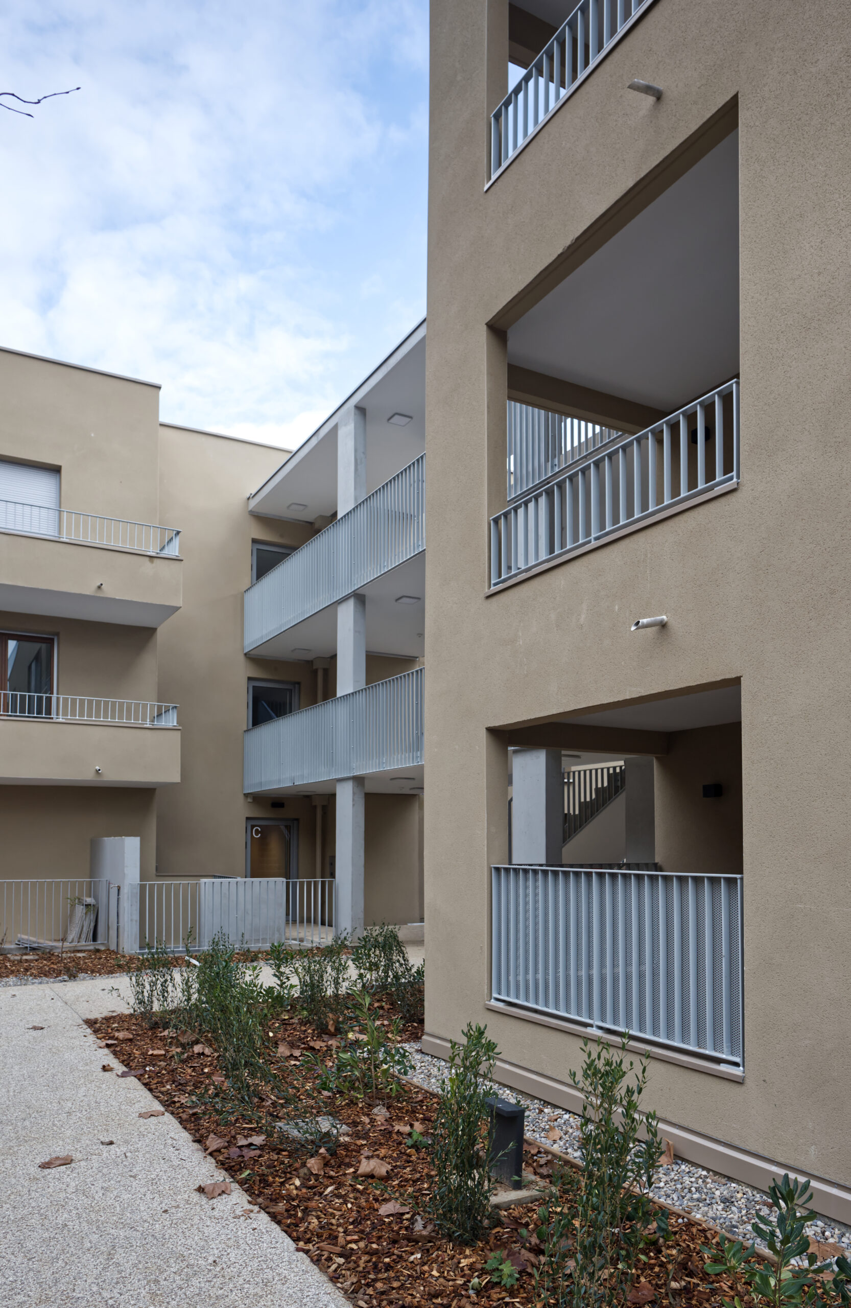 Le premier bâtiment, situé au sud, regroupe les logements locatifs sociaux (11 unités), et la rampe d’accès au sous-sol. Les deux autres bâtiments, implantés au nord, accueillent les logements en accession sociale (23 unités) et une crèche municipale en RDC du plot central. Ils sont reliés par une coursive extérieure. Cette organisation permet de proposer des logements bi-orientés, bénéficiant d’un éclairage naturel et d’une ventilation traversante.