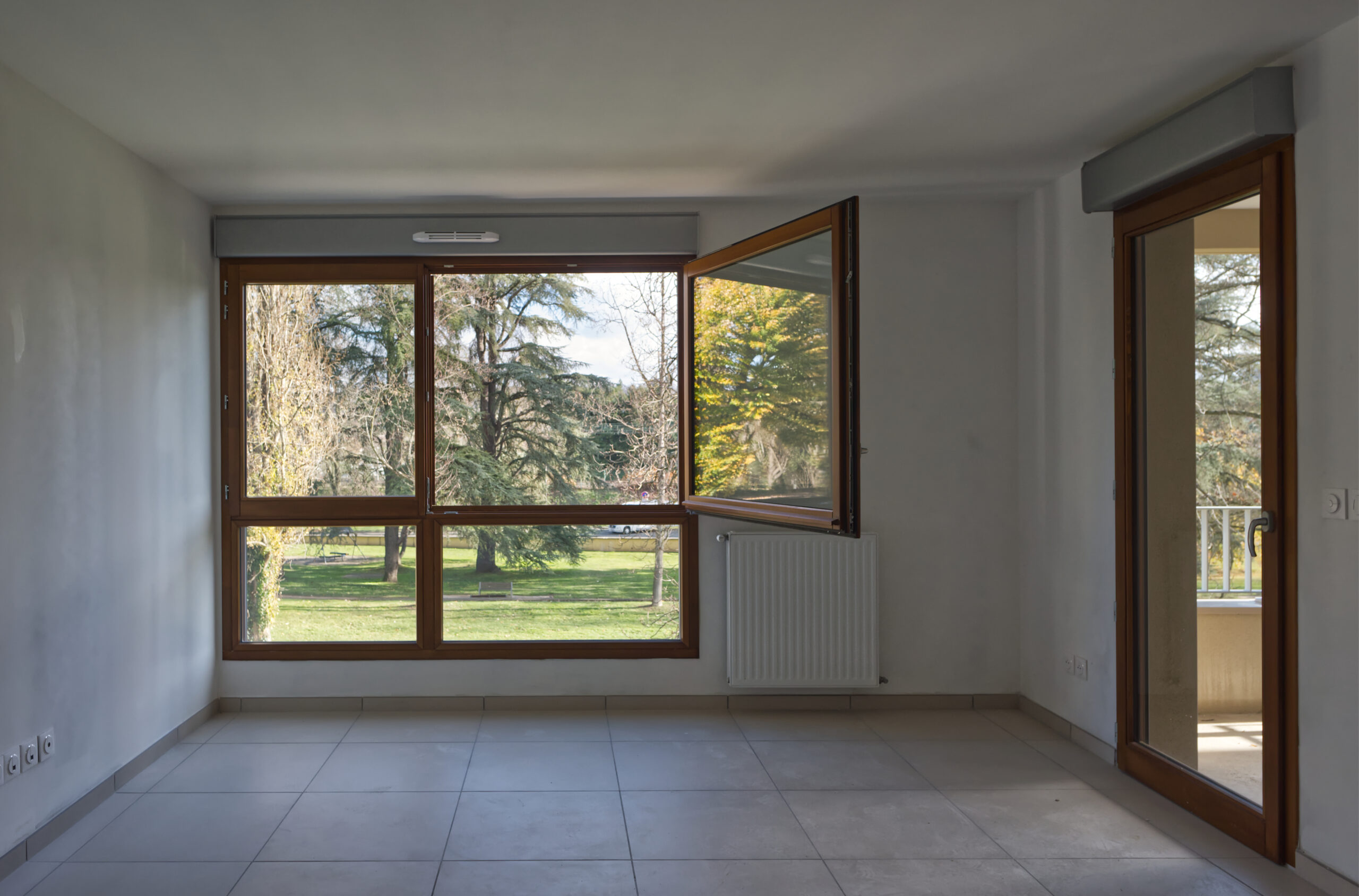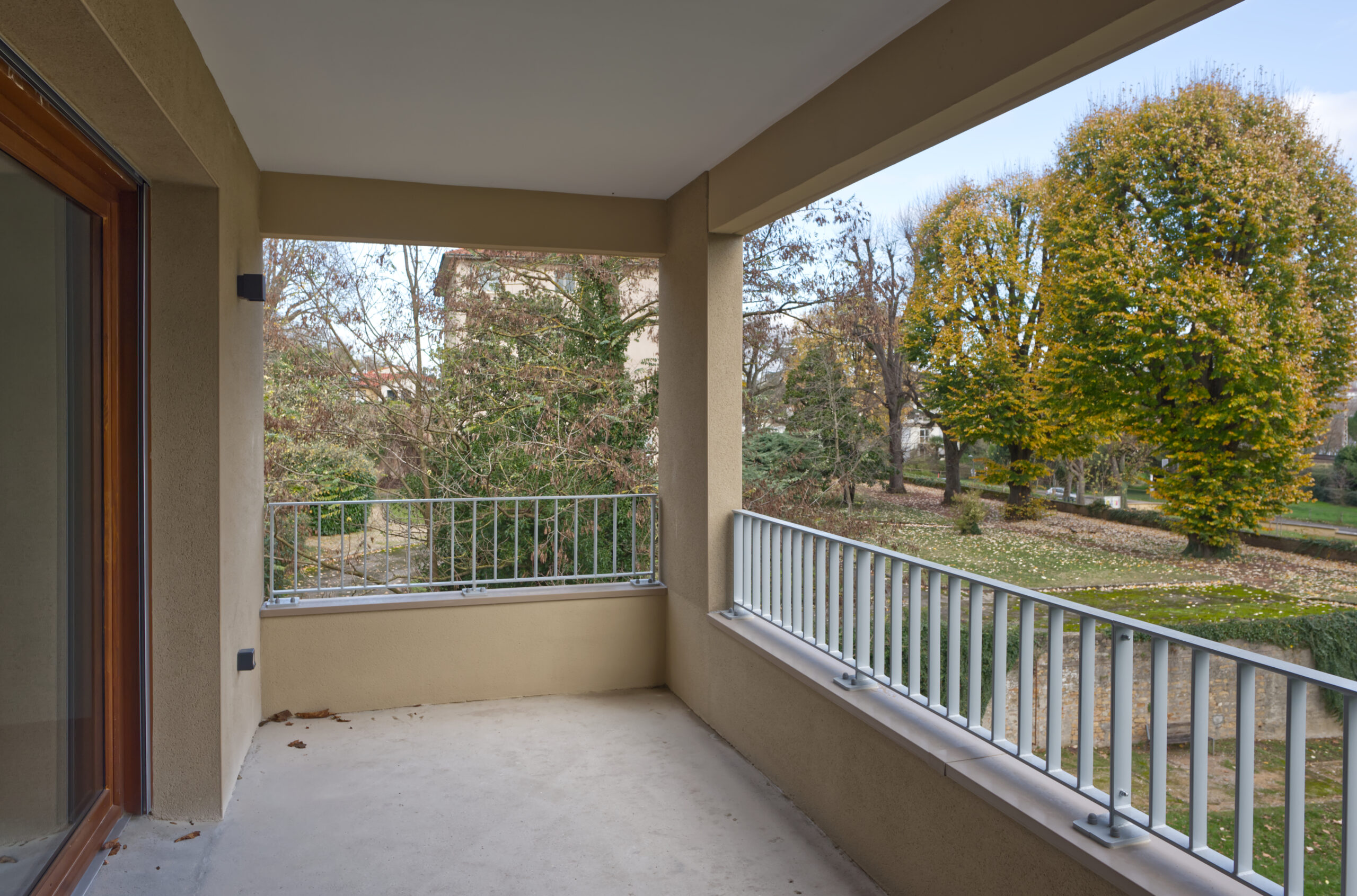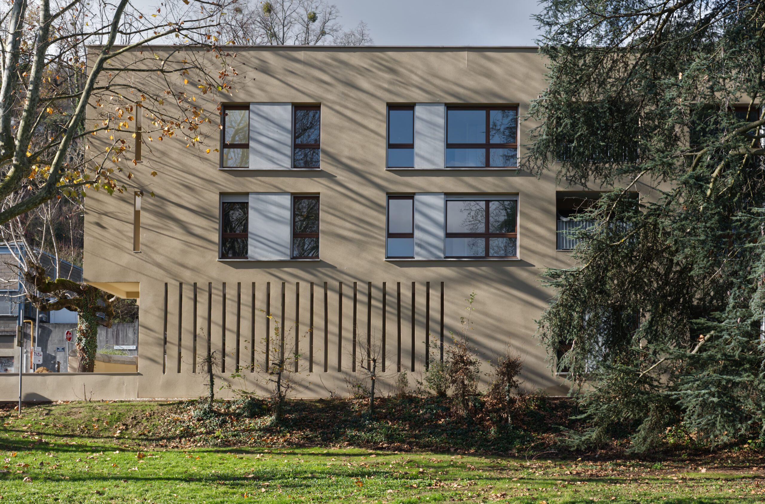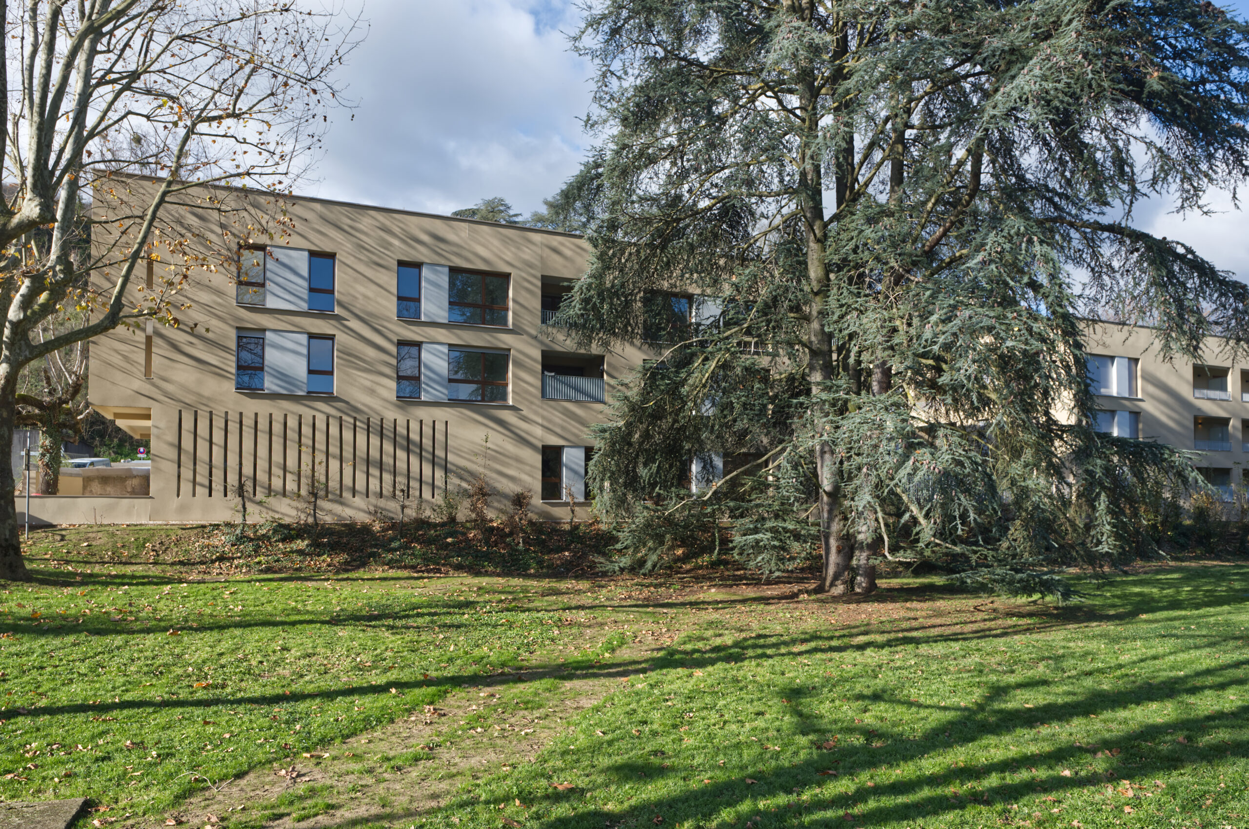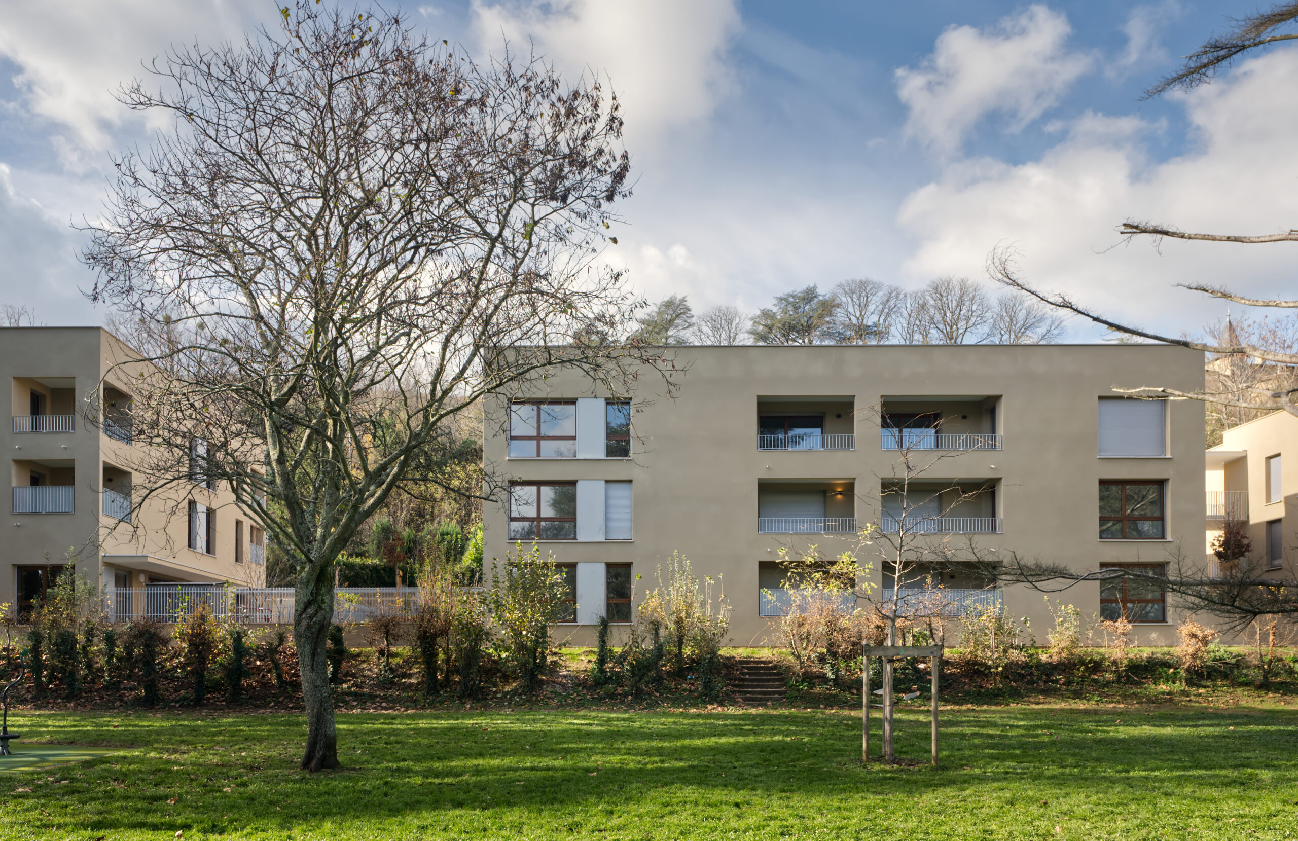 une parcelle allongée, une orientation Est-Ouest favorable et la possibilité de construire en limite du parc. Le plan de composition dessine trois bâtiments en R+2, à volumétrie simple et horizontale, en cohérence avec le contexte urbain, notamment la proximité de l’hôpital au sud. Deux patios généreux ménagent des vues entre le parc et les coteaux des monts d’Or et favorisent la transparence visuelle depuis la rue Richerand.