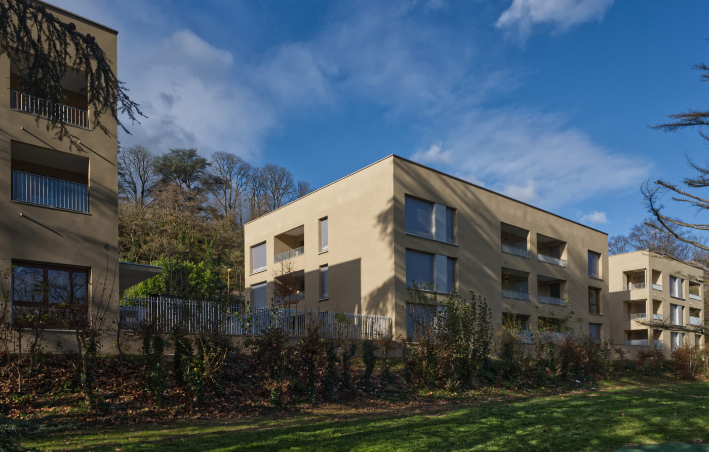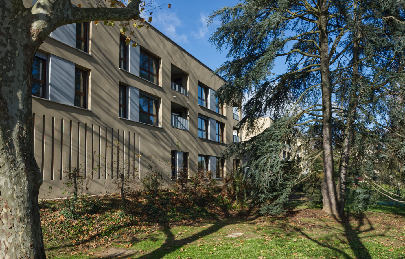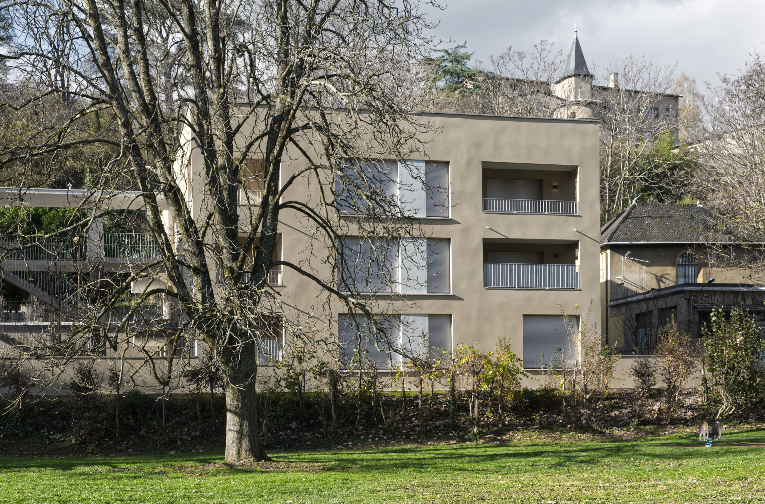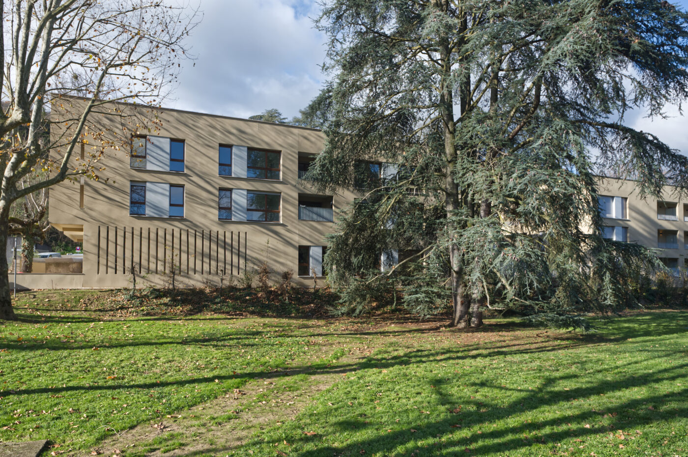 Le projet s’inscrit dans un site à forte valeur patrimoniale et paysagère, dans un périmètre monuments historiques, bordé par le beau parc des Monts d’Or. Il tire parti de ses atouts et contraintes :