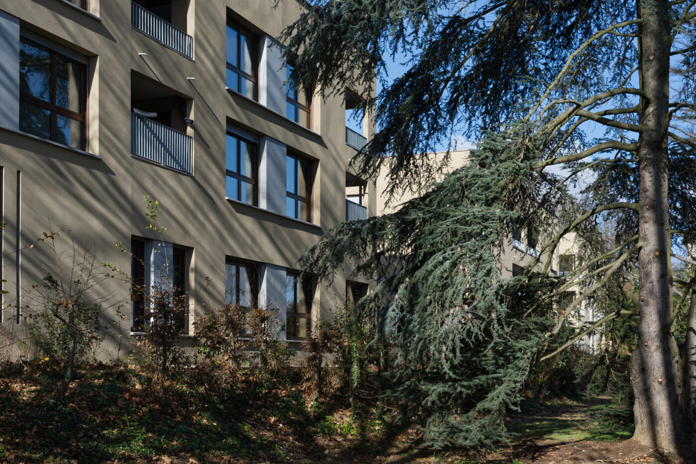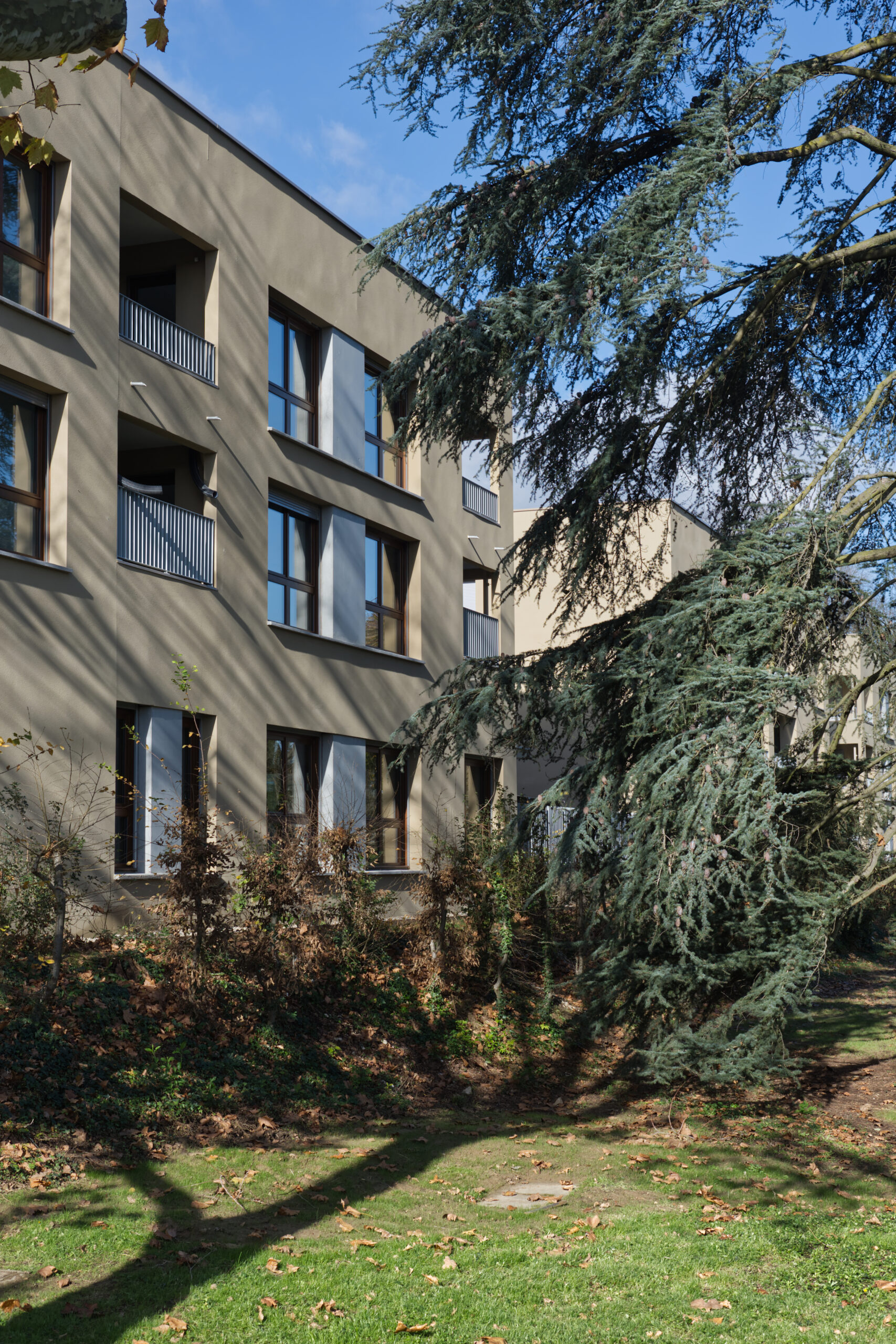 L’architecture repose sur trois plots compacts avec des loggias orientées Est et Ouest, un rez-de-chaussée fluide et des façades animées par grandes ouvertures. Les garde-corps métalliques assurent l’intimité tout en laissant passer la lumière à l’intérieur des logements. Les toitures terrasses sont végétalisées afin de limiter l’impact visuel, réduire les îlots de chaleur et gérer les eaux pluviales.
