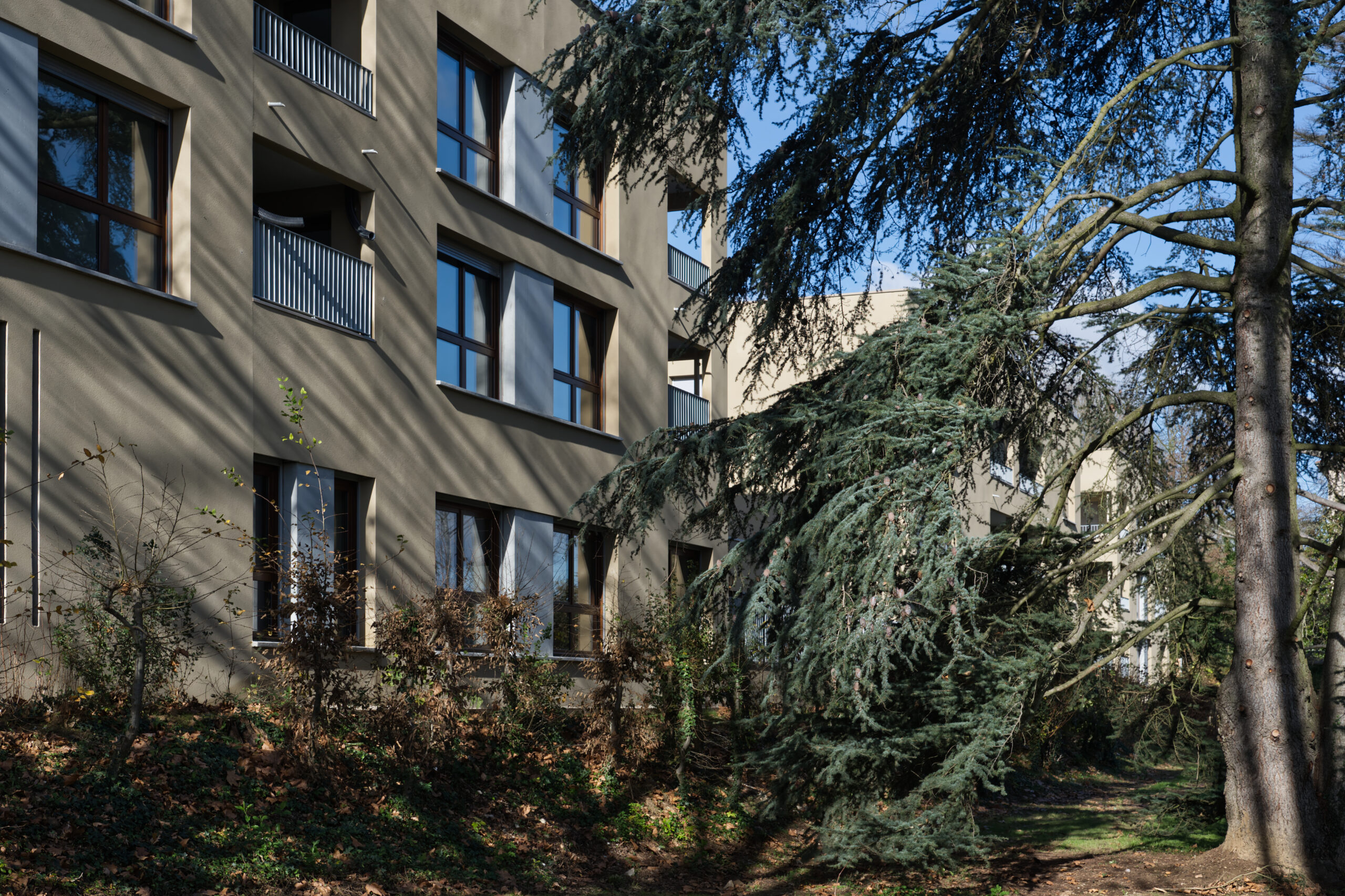 Le traitement paysager privilégie la sobriété et la facilité d’entretien, avec des plantations en pleine terre, des arbustes et des arbres à petites feuilles, ainsi que la végétalisation des toitures. La gestion écologique des eaux pluviales est assurée par l’infiltration naturelle et un bassin de récupération en sous-sol.