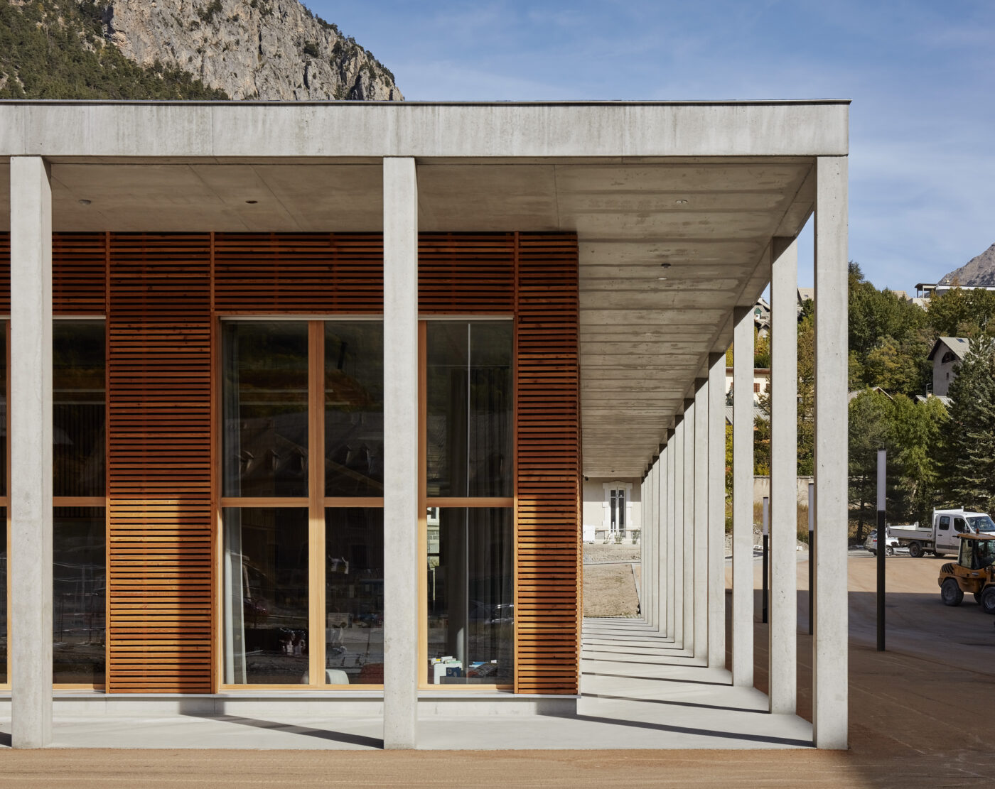 Sous la dalle végétalisée, Les quatre façades sont dessinées sur le principe d’une stoa, mais chacune différenciée et offrant de belles transparences. A l’ouest l’entrée est aménagée sous un portique pour protéger des intempéries. Cette entrée dessert la salle polyvalente qui peut fonctionner en autonomie Au sud une coursive extérieure protège la façade de la neige tombante et du soleil.