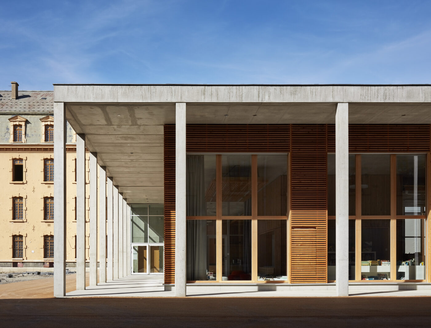 Ici au cœur de l’ancienne caserne Berwick en cours de mutation, entre deux casernements massifs et austères, le bâtiment veut être un écho aux montagnes proches. Béton et bois définissent son ambiance intérieure. Sous une grande dalle de béton, minérale, brute comme de la pierre, le plan organise les différentes fonctions de la médiathèque. C’est un plan libre, fluide, amplifié par la grande hauteur sous plafond et un acrotère élancé qui dégage de belles vues sur les crêtes alentour.