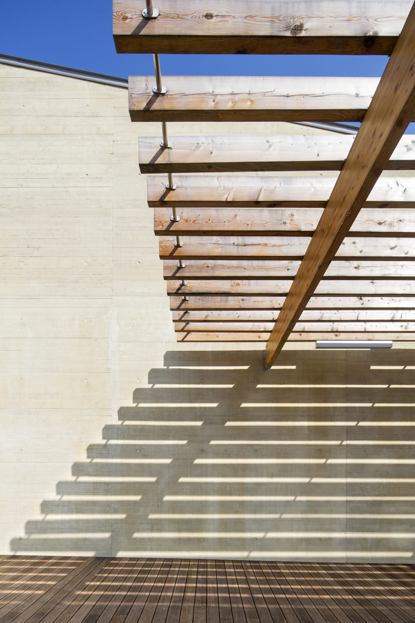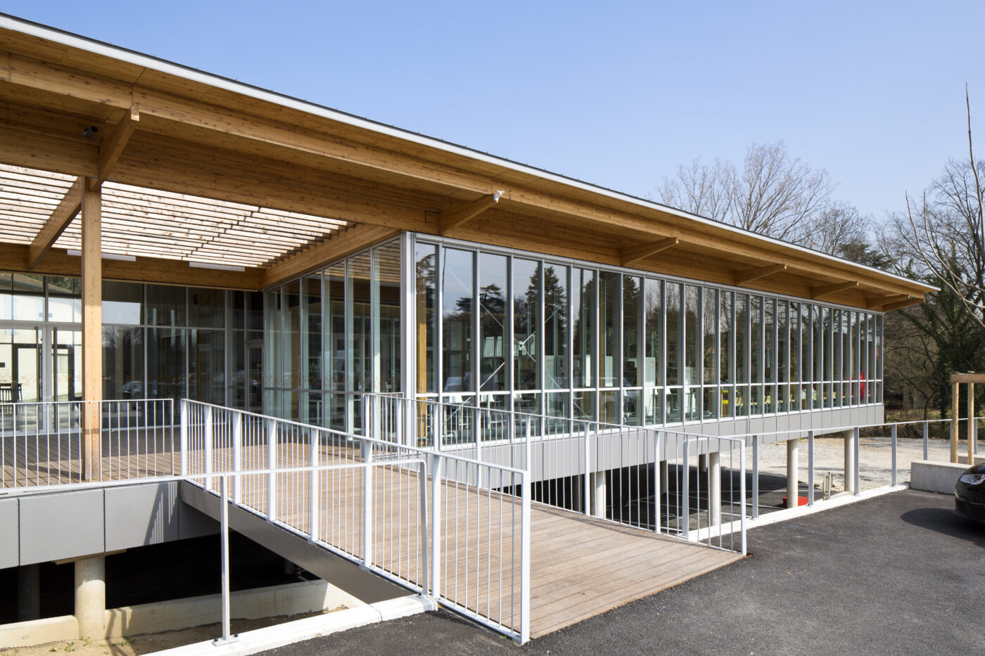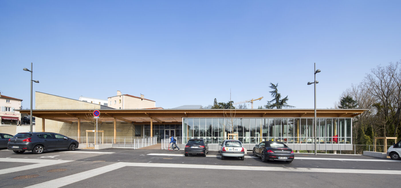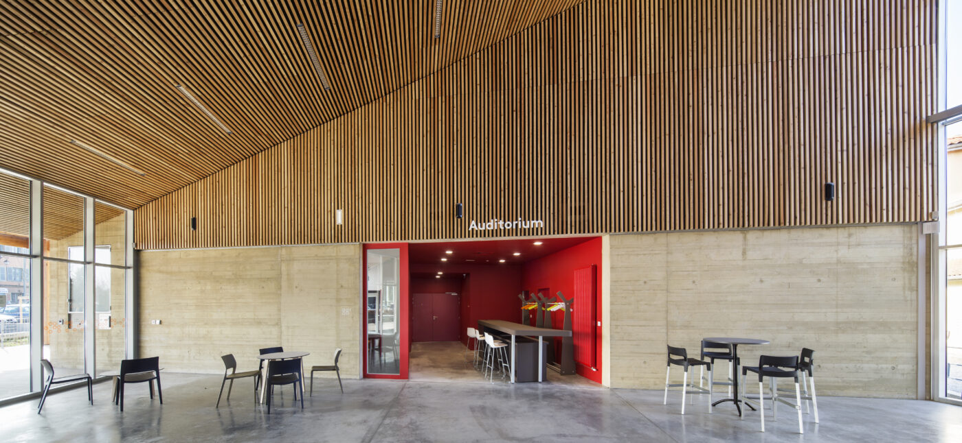Sa toiture lui confère une silhouette identitaire reconnaissable de tous dans le paysage actuel de la commune. Cette cinquième façade permet de donner aux volumes intérieurs une échelle variée et découpée, de rythmer les différents espaces : salle, hall d’accueil, médiathèque.