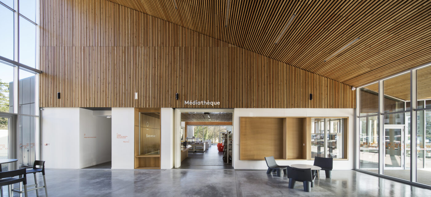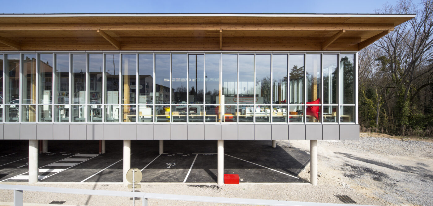 La médiathèque est positionnée en cœur de village comme un générateur d’urbanité. Elle s’inscrit dans ce contexte par la prise en compte du passé, des traces, de son histoire urbaine et sociale. Ainsi, la porte du château est révélée par la création d’une noue paysagère, qui met à nu les fondations du château.
