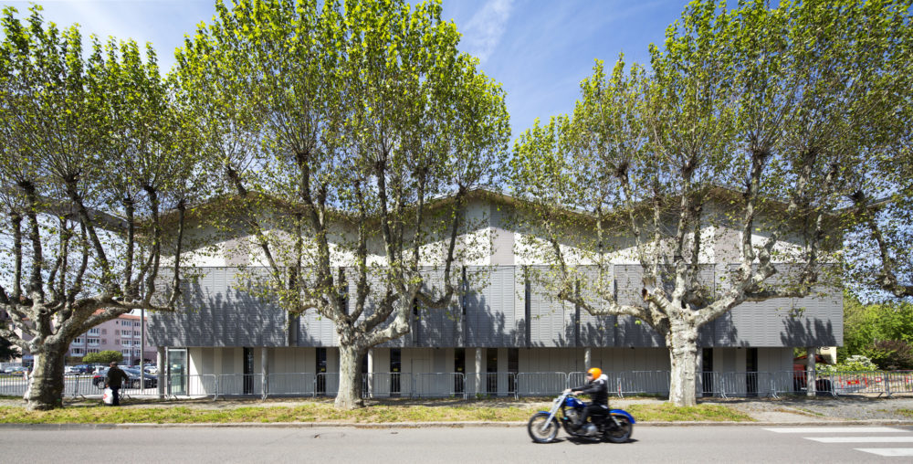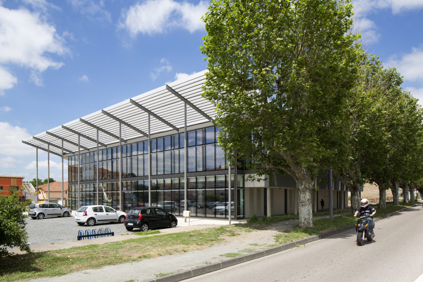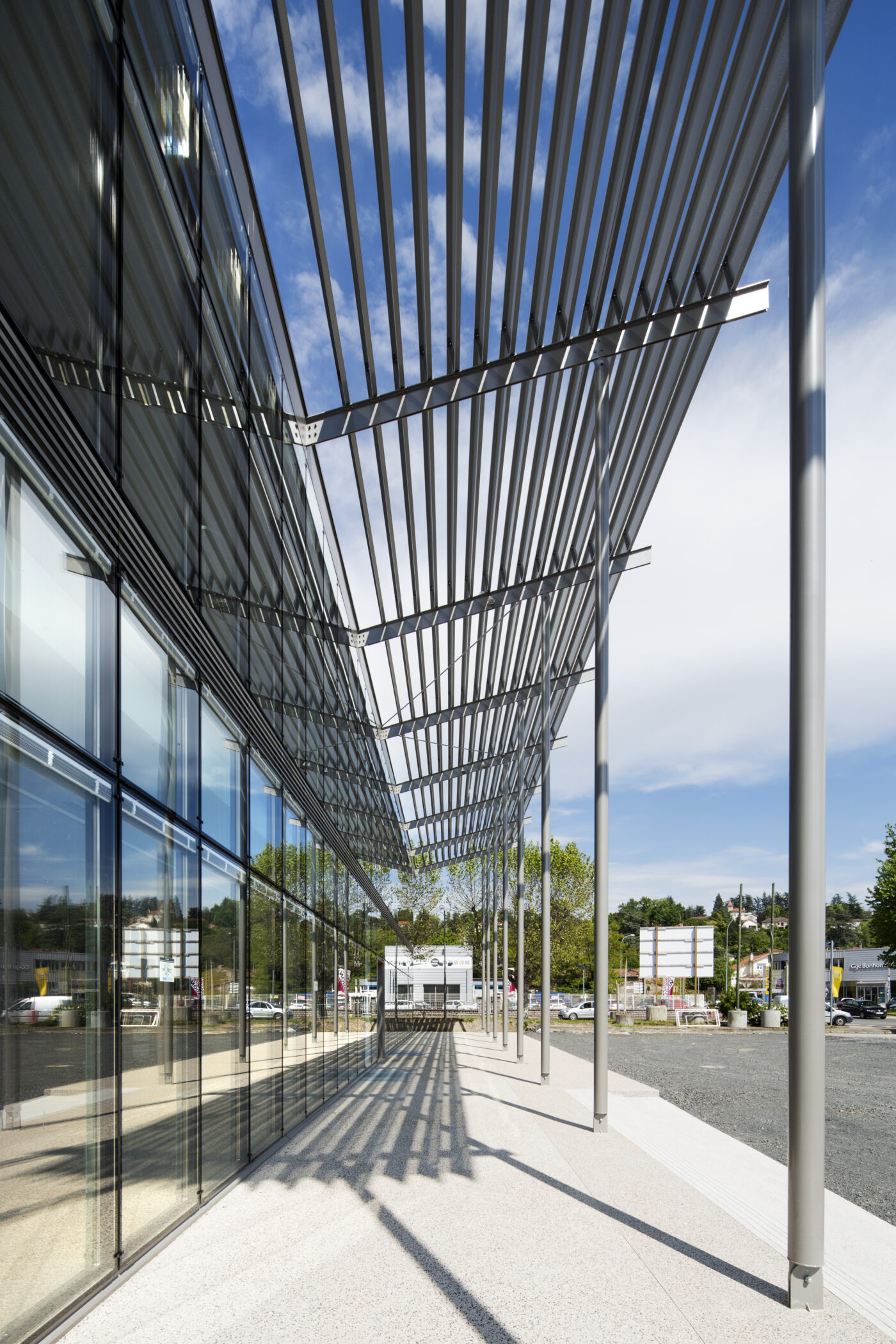 Selon les localisations, le bardage est en verre type Emalit ou en acier persienné ; résistants, ces bardages ne nécessiteront aucun entretien.