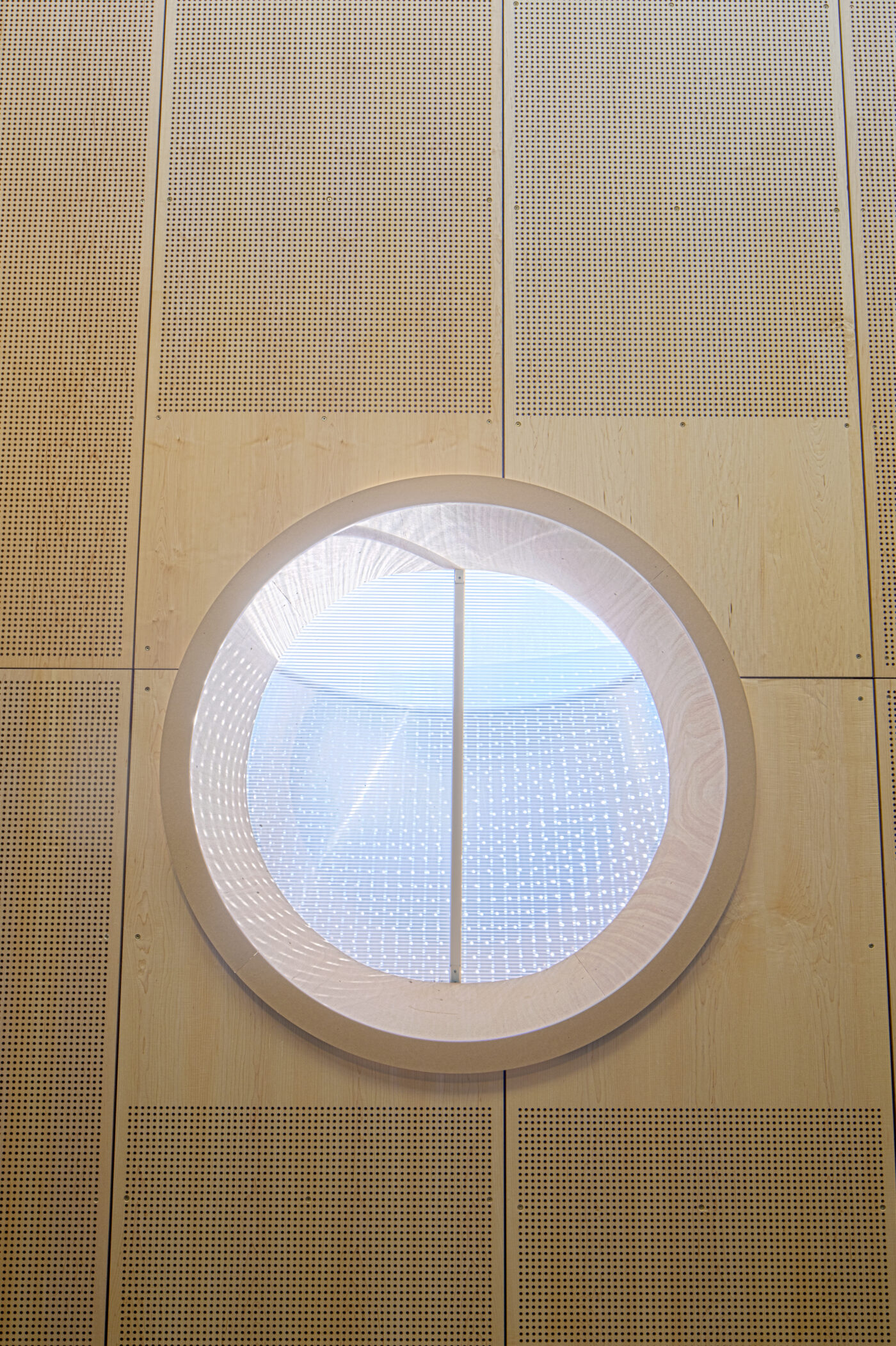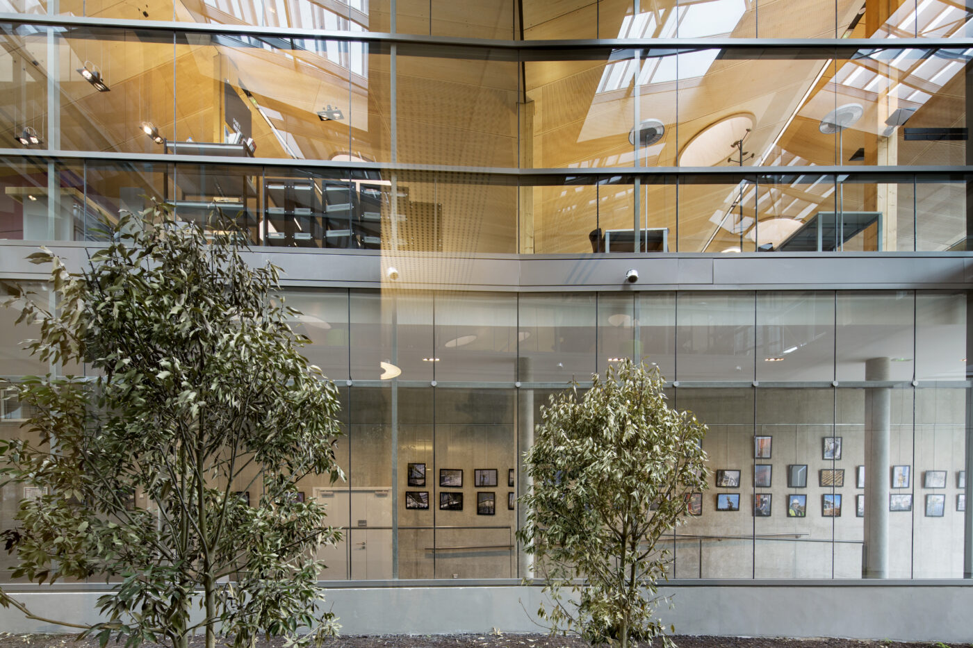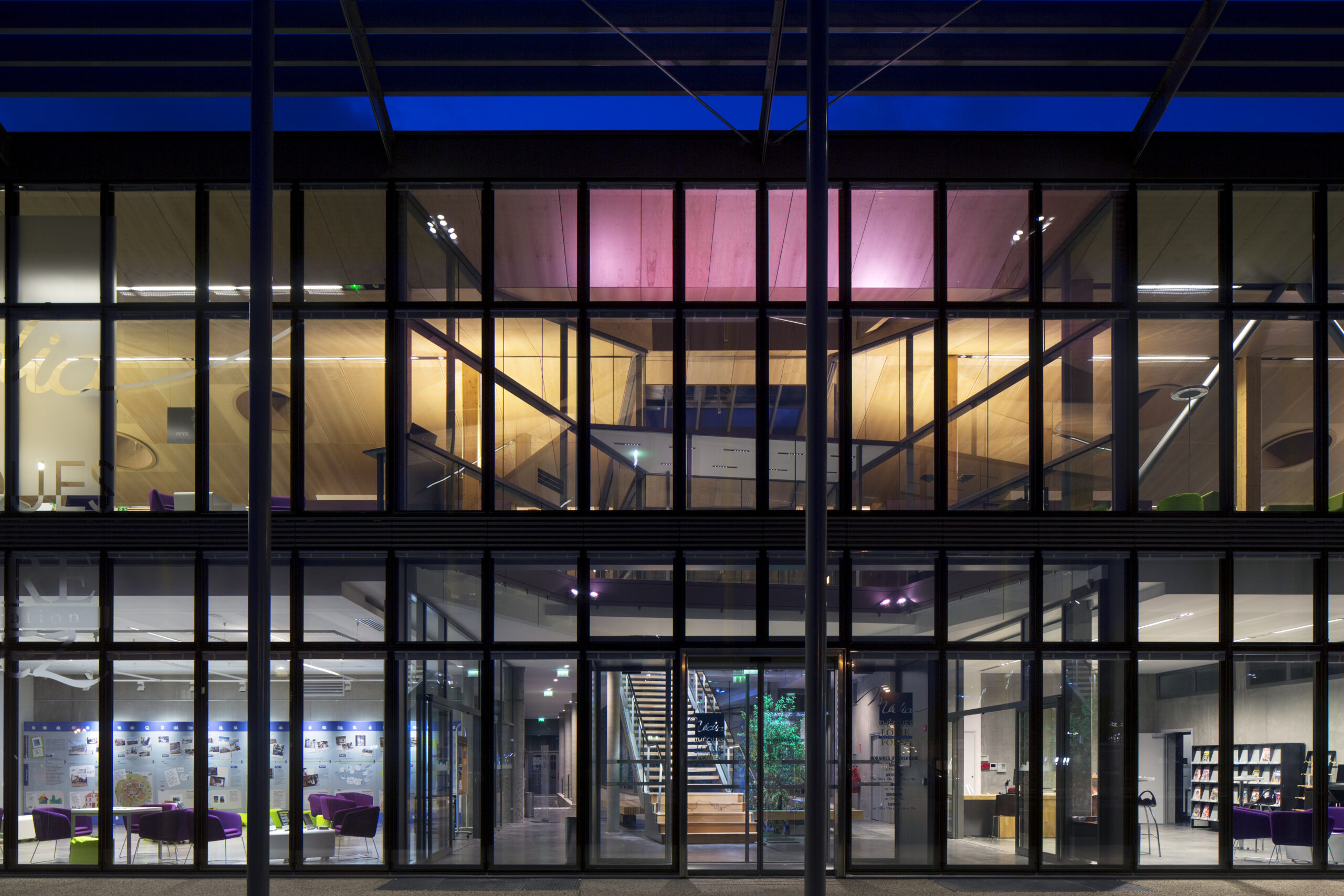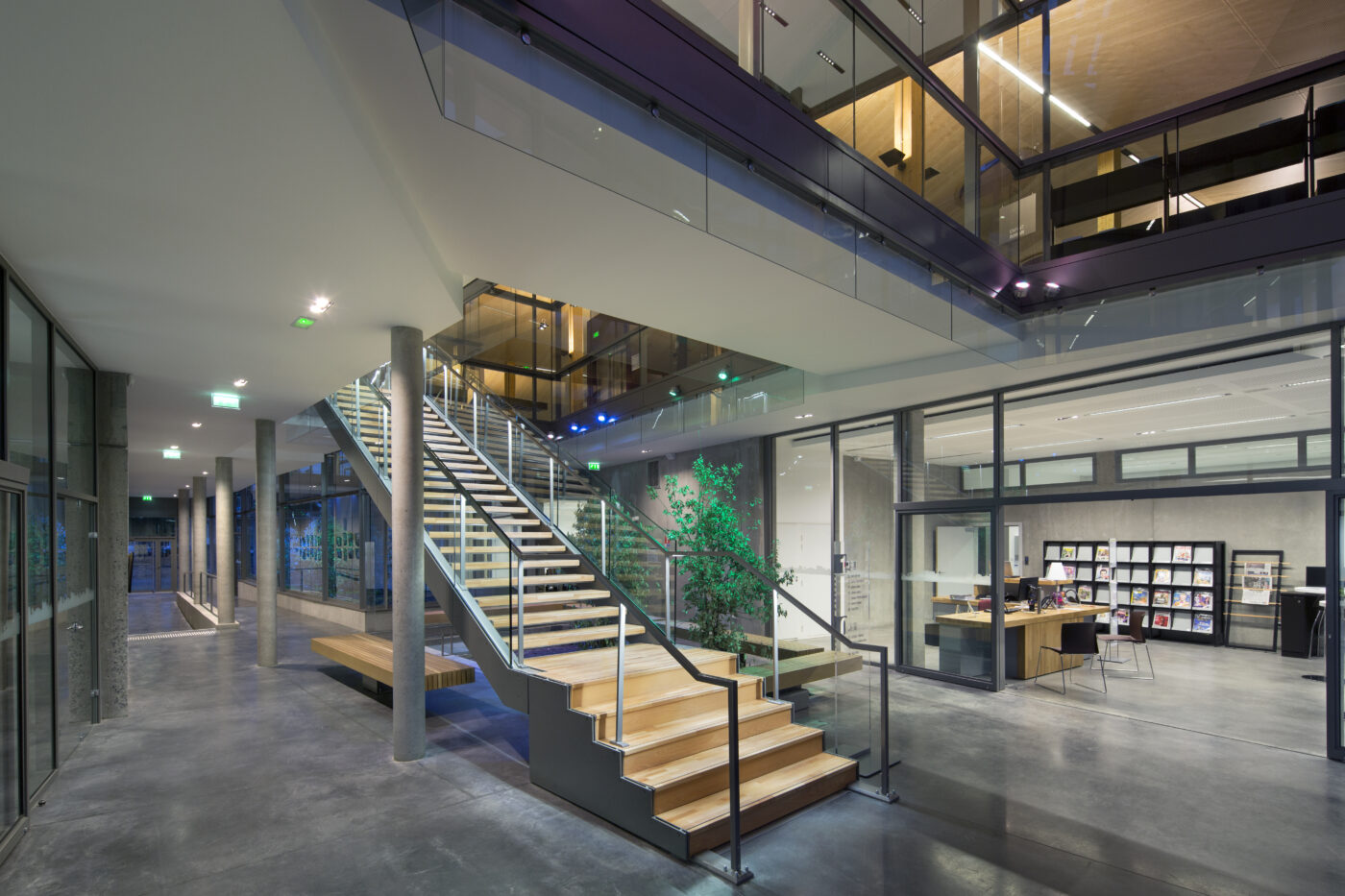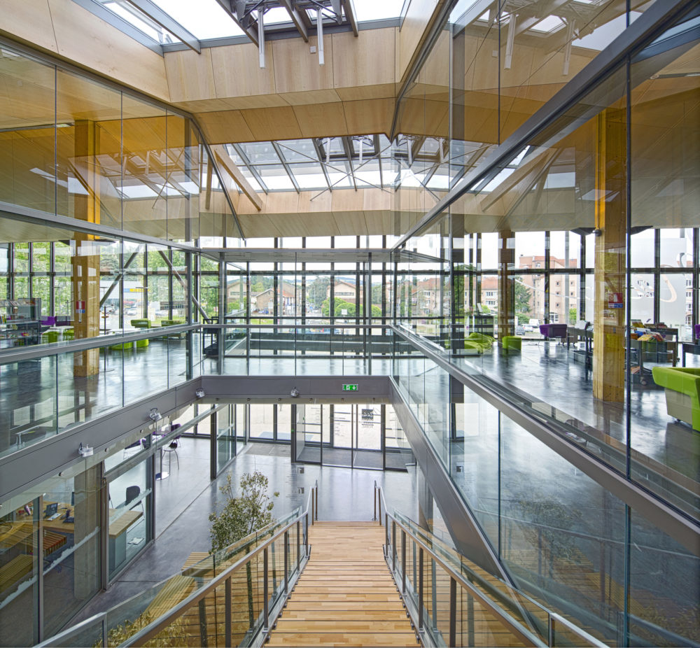 Les murs ainsi que les plafonds des parties médiathèque sont en bois clair ; les planchers sont en béton quartzé pour une résistance et une durabilité maximales, ainsi que pour leur facilité d’entretien.