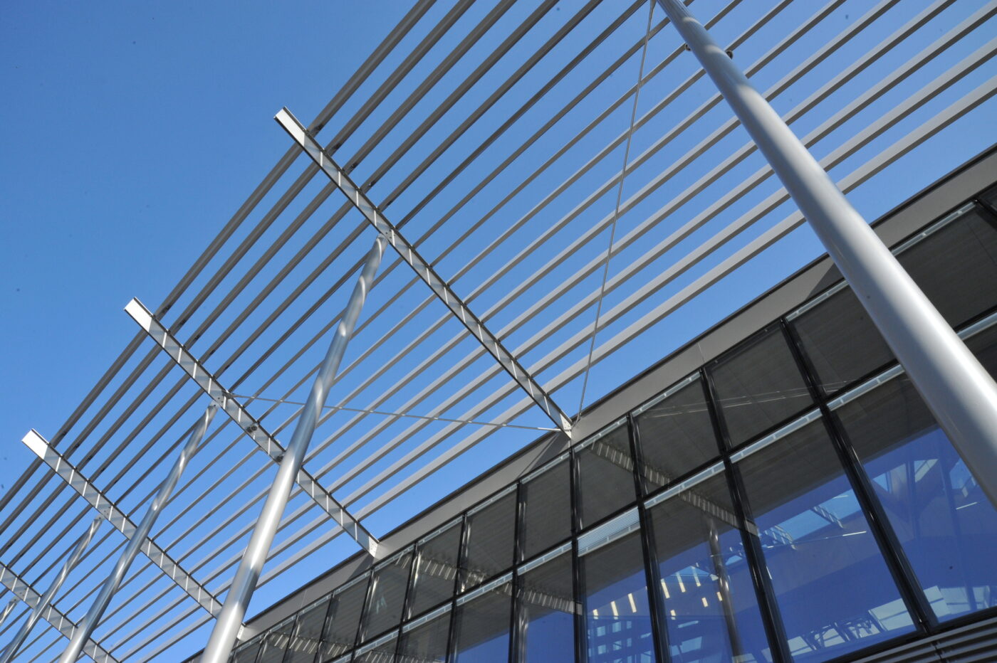 Les protections solaires fixes sont en tôle micro-perforée ; les protections solaires des vitrages zénithaux sont décalés des vitrages de manière à faciliter l’entretien de ces derniers.