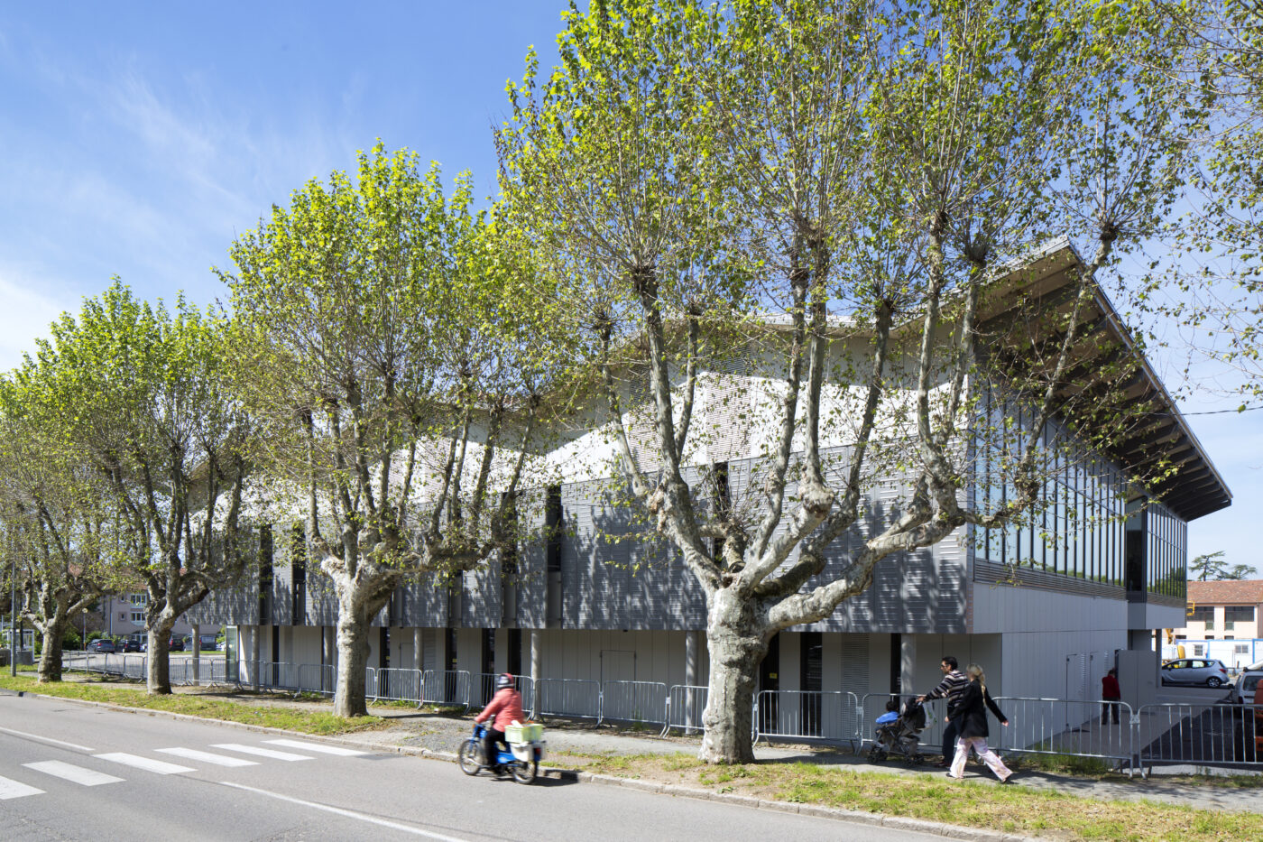 Au sud la création d’un parvis transversal Est Ouest permettant une liaison claire avec le parc, marque l’accès principal de l’équipement et dans son prolongement celui de la MJC construite en simultané.