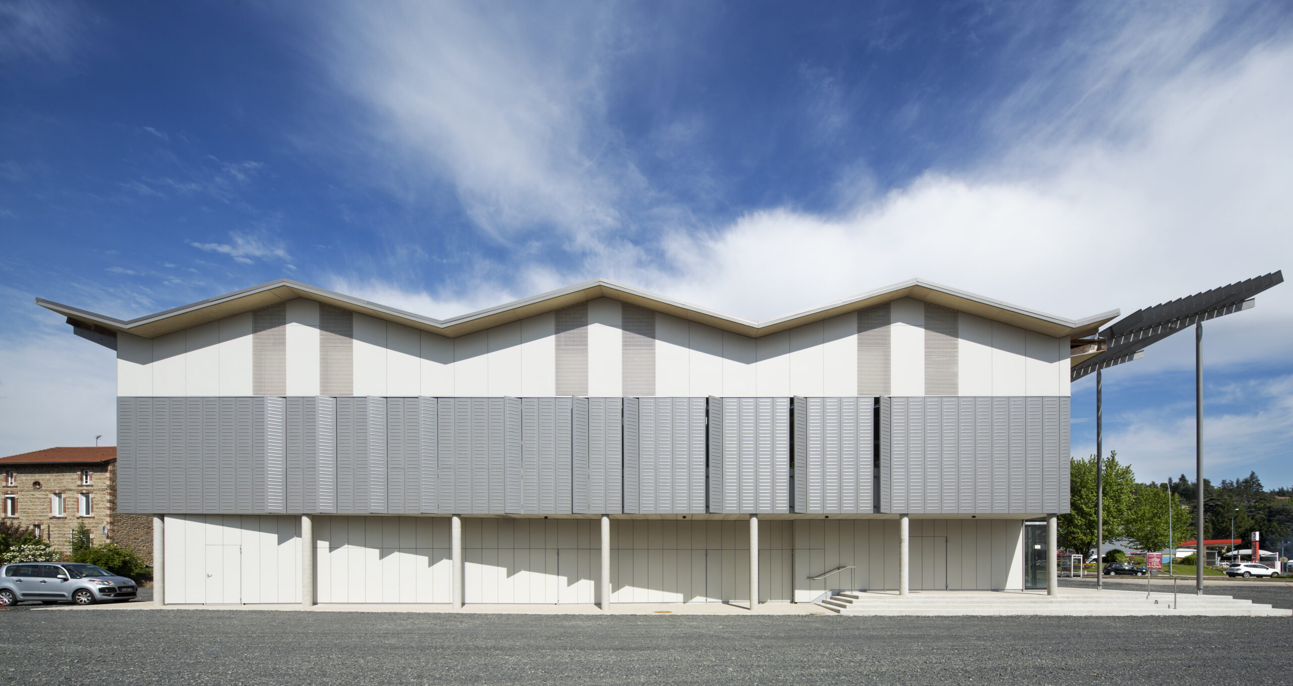 La toiture plissée du bâtiment lui confère une silhouette identitaire reconnaissable de tous dans le paysage actuel de la commune. Cette cinquième façade permet de donner une échelle au volume intérieur variée et découpée; un rythme aux différents espaces.