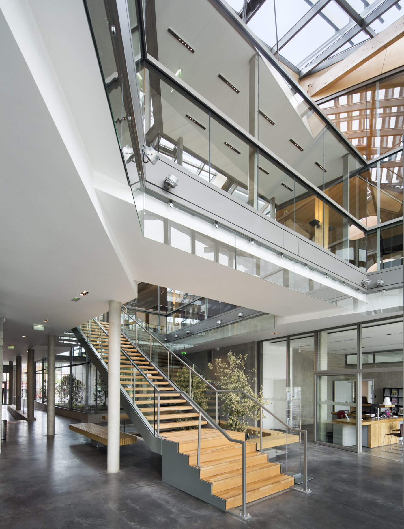 Le plancher intermédiaire est toutefois en béton, de manière à apporter de l’inertie au bâtiment ainsi qu’un bon isolement acoustique
