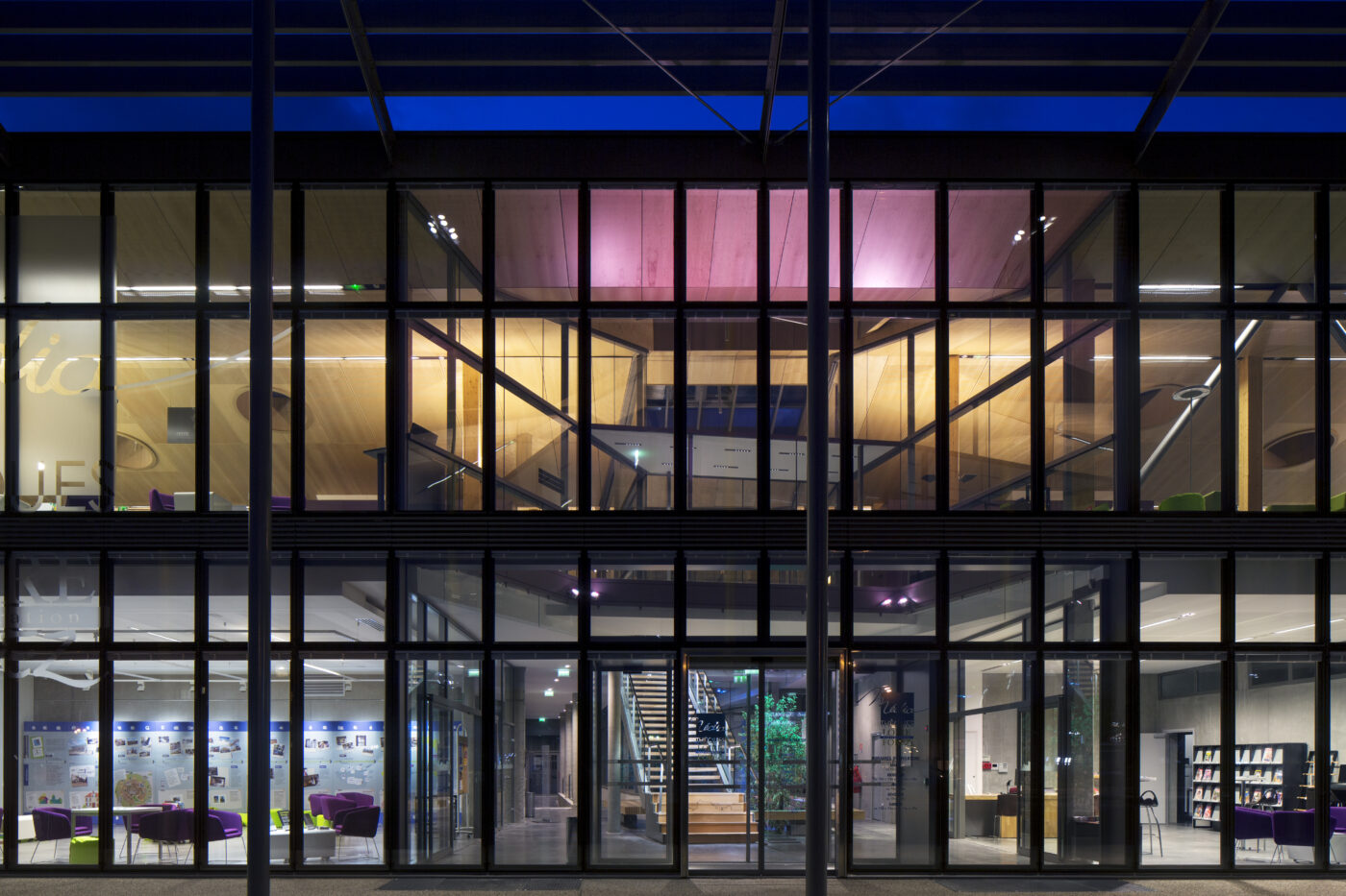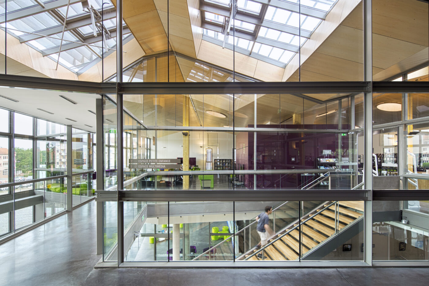 La qualité de la lumière pour le confort d’usage est primordiale, le principe d’un apport de lumière naturelle contrôlée et optimale aux espaces de la médiathèque mais aussi d’accueil du public a nourri notre réflexion sur le projet et sur la mise en place de principes simples :