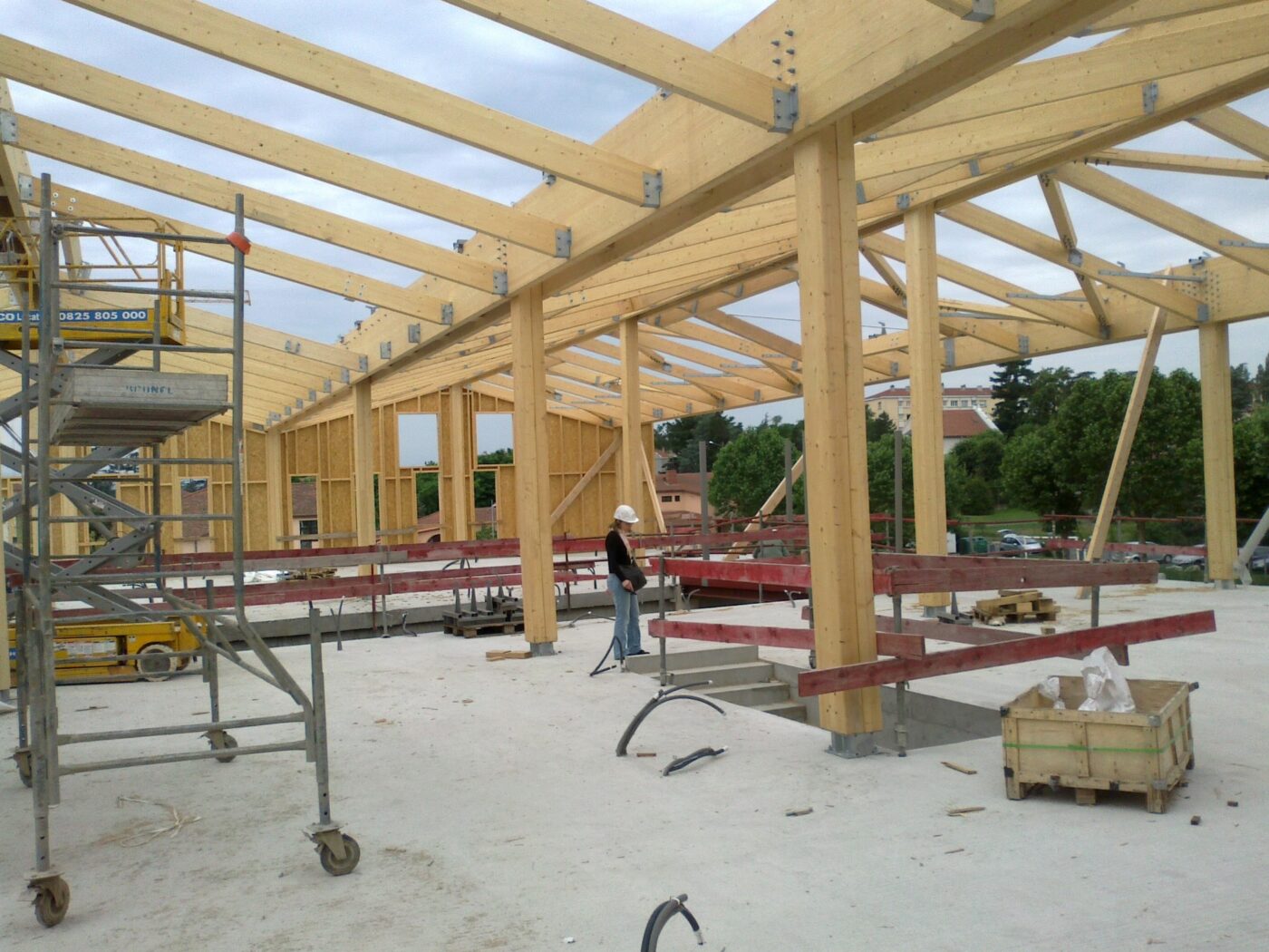 L’ensemble de la structure en façade et en toiture est une ossature en bois sauf les parois de la médiathèque et certains refends. Certains porteurs sont en béton, pour assurer le contreventement ou assurer un isolement acoustique. Il est de manière générale constaté que le matériau de structure est le poste le plus pénalisant dans le bilan d’énergie grise (quantité d’énergie liée à la production et mise en œuvre du matériau) ; le projet répond pleinement à cette problématique par le choix délibéré d’une structure en bois, extrêmement intéressante par rapport à ce que serait une structure béton.