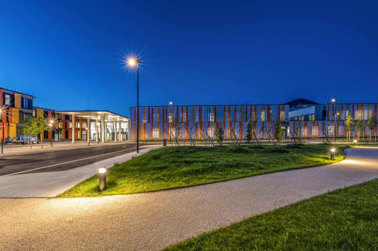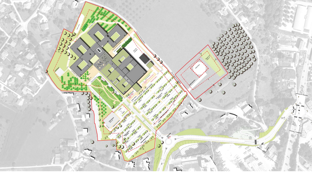 Le projet de centre hospitalier s’inscrit dans un site encore rural. Cet environnement exige un ensemble léger de bâtiments, dont l’apparence et la volumétrie se retiennent. Pour être accepté ou acceptable, le projet doit intégrer une dimension paysagère forte et fédératrice.